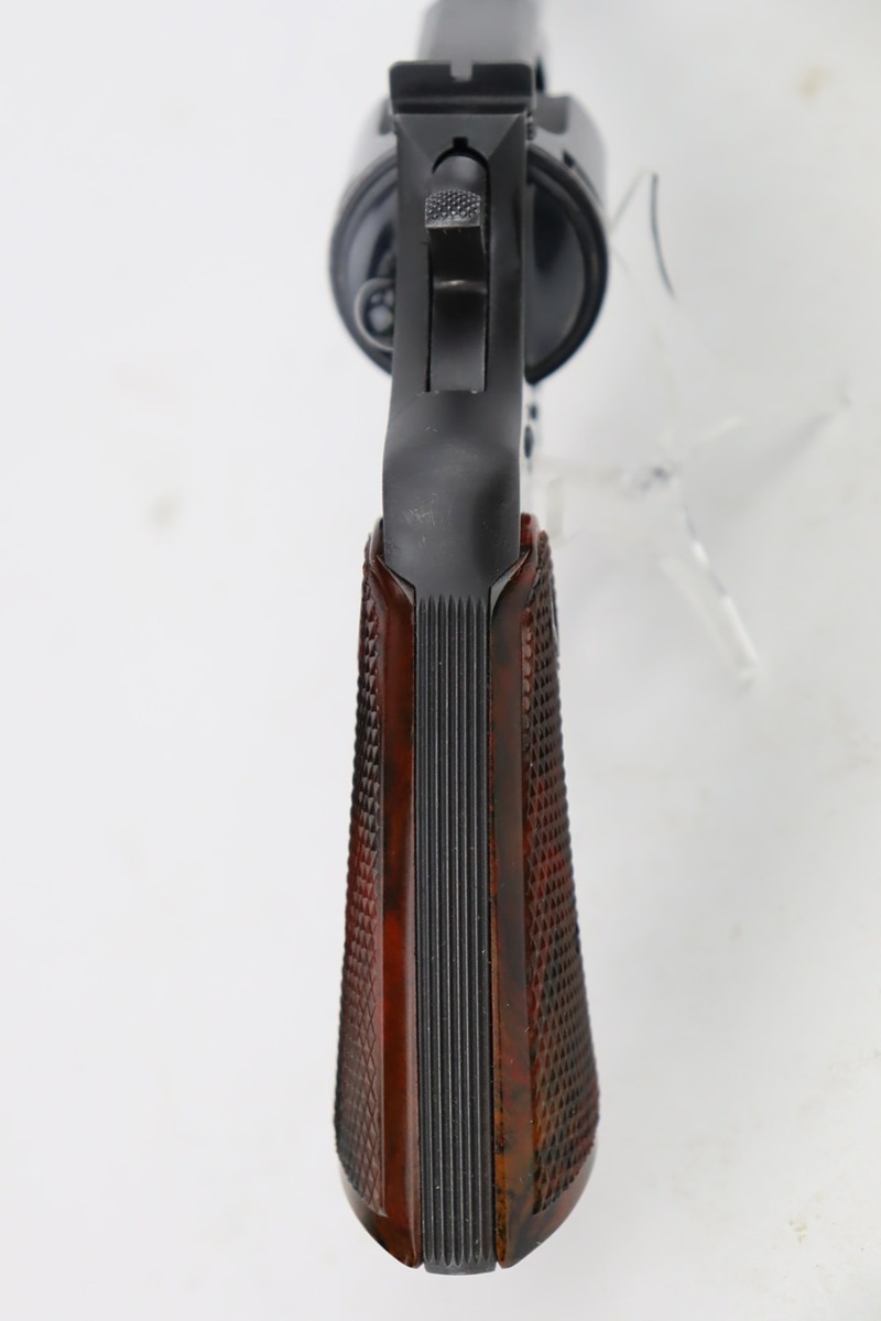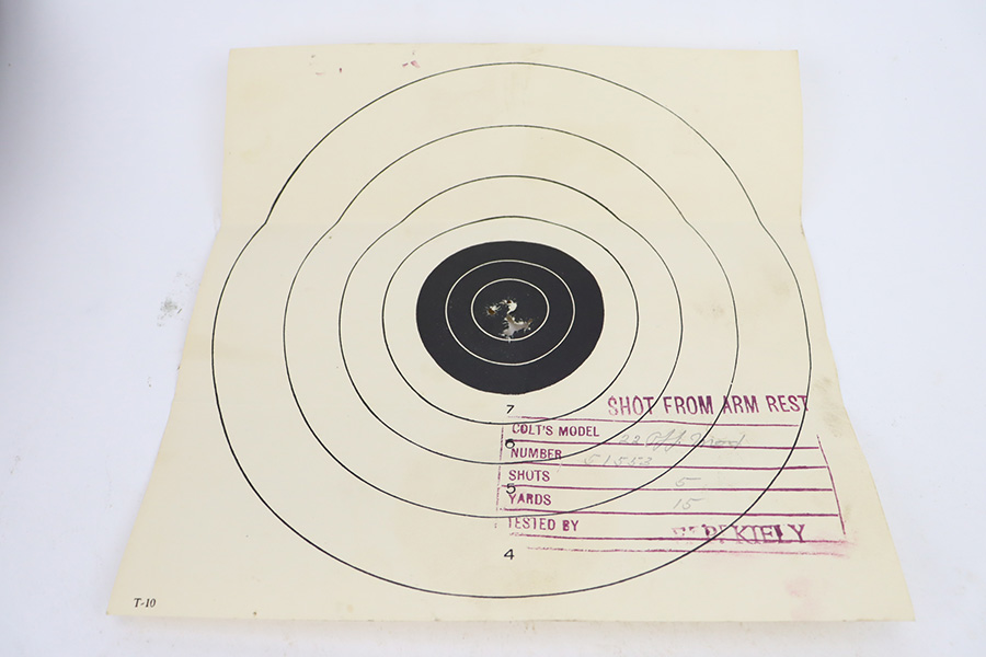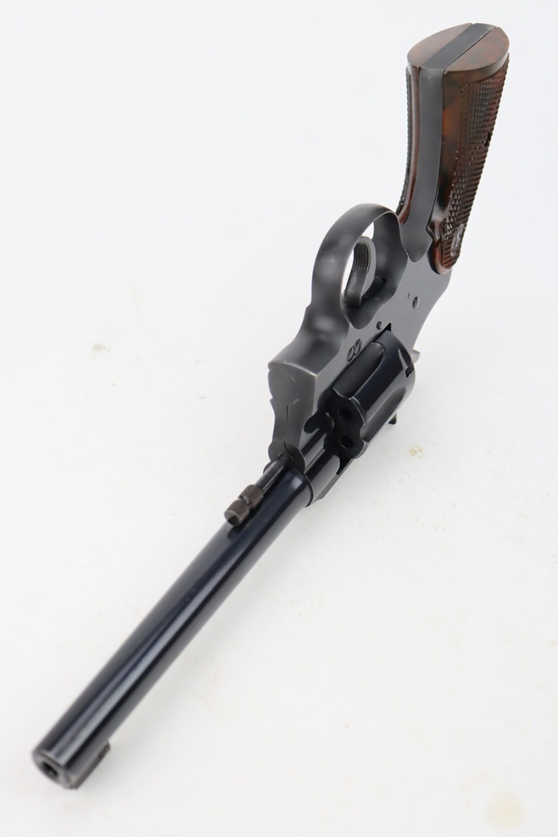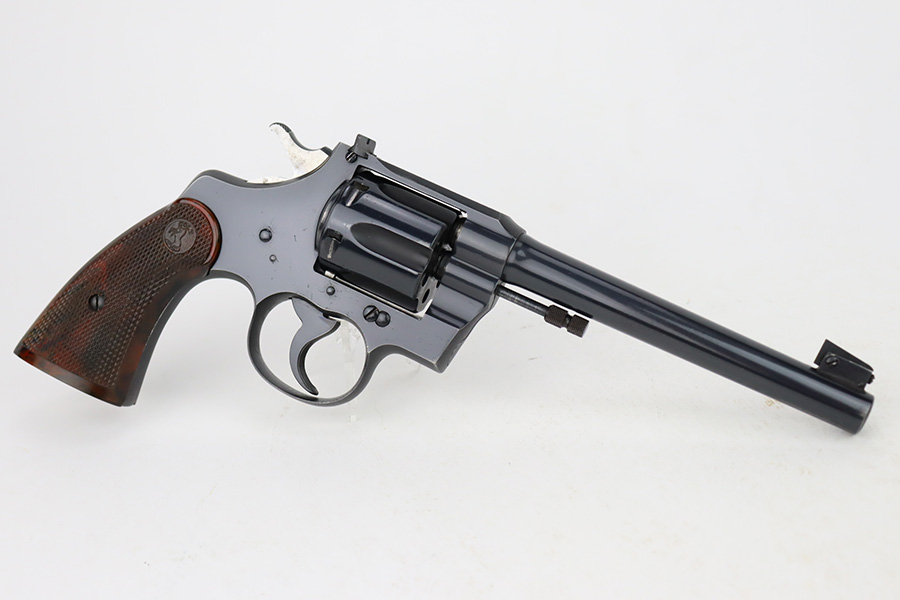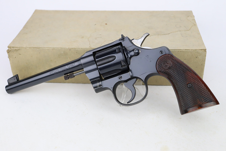 9/28/23 – This is an excellent Colt Officers Model Target revolver in its original box. Made in 1948, the revolver has about 97% of its original blue remaining with minor edge wear on the bottom of the grip frame, and light muzzle/high edge wear elsewhere. Also a light turn line on cylinder. Six inch barrel with minty bore. Beautiful grips. Box has the original test target inside, and the shipping sleeve is also included, which has the serial of the handgun hand-written on it.
