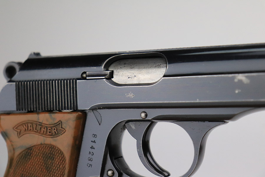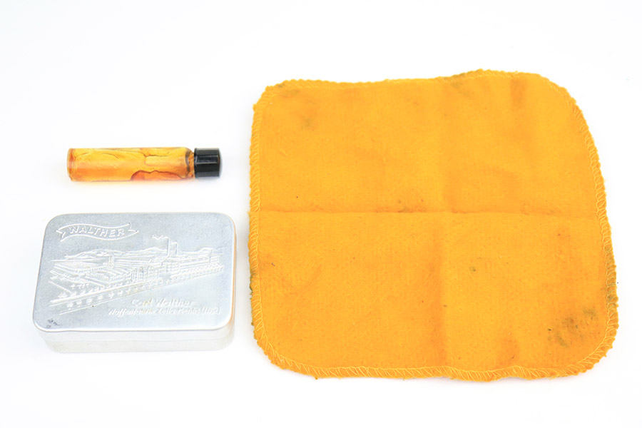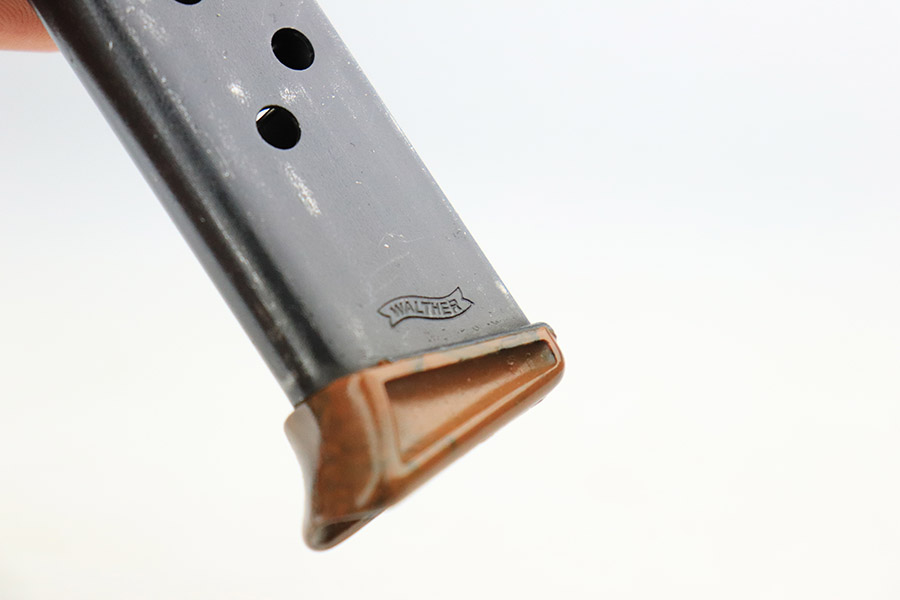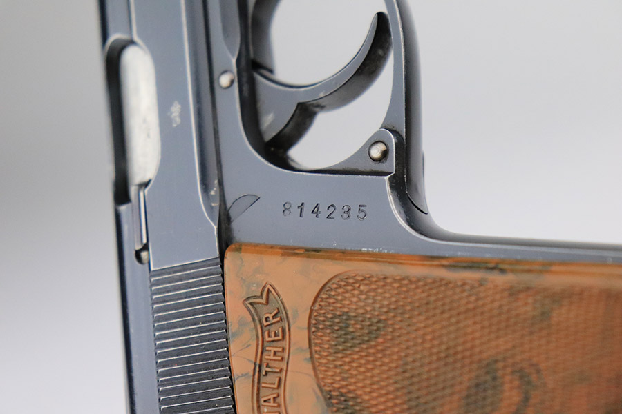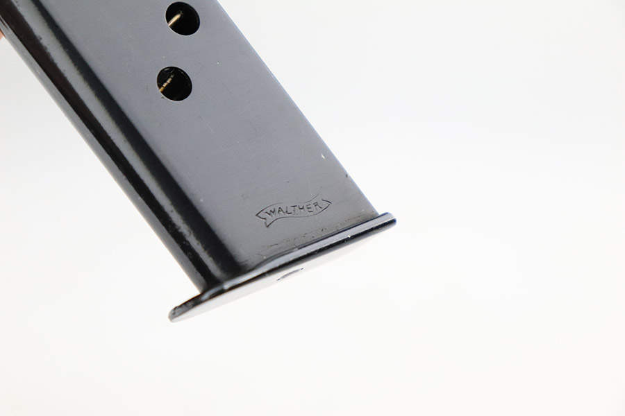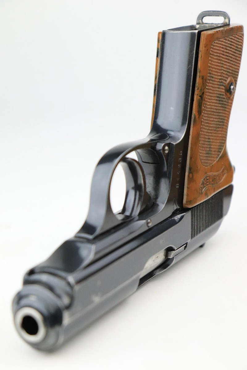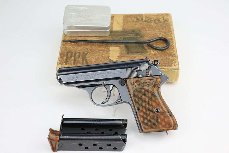 11/8/22 – This is an excellent example of a Walther PPK sold in the commercial market in 1934. It is all matching and has the proper “Crown N” commercial proofs. It comes with a period-correct box (no numbered label), one finger extension magazine, one spare flat-bottom magazine, a cleaning rod, and a period-correct cleaning tin with an original yellow cloth and glass oiler with some of the original oil in it. The box has a pink interior. The side panels have been reinforced with masking tape. The gun itself has retained about 96-97% of its original high polish finish. There is minor muzzle wear and very minor wear concentrated around the high edges of the slide. A couple of small spots of wear on the right side of the slide and a couple of very light surface scratches on the left side. Comes with an excellent brown Walther grip – no cracks or chips. Mint bore.