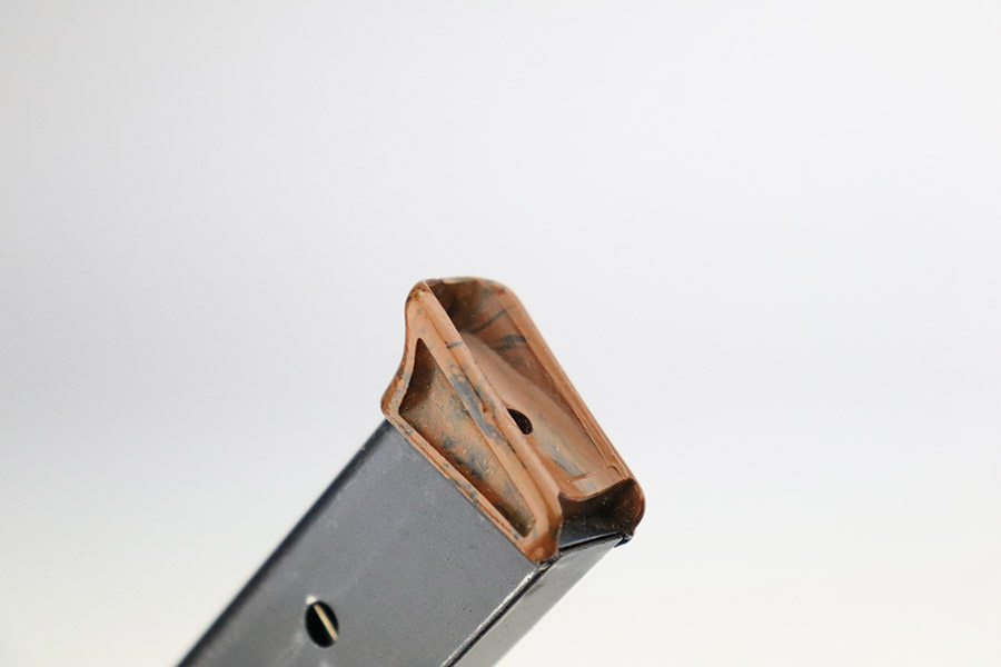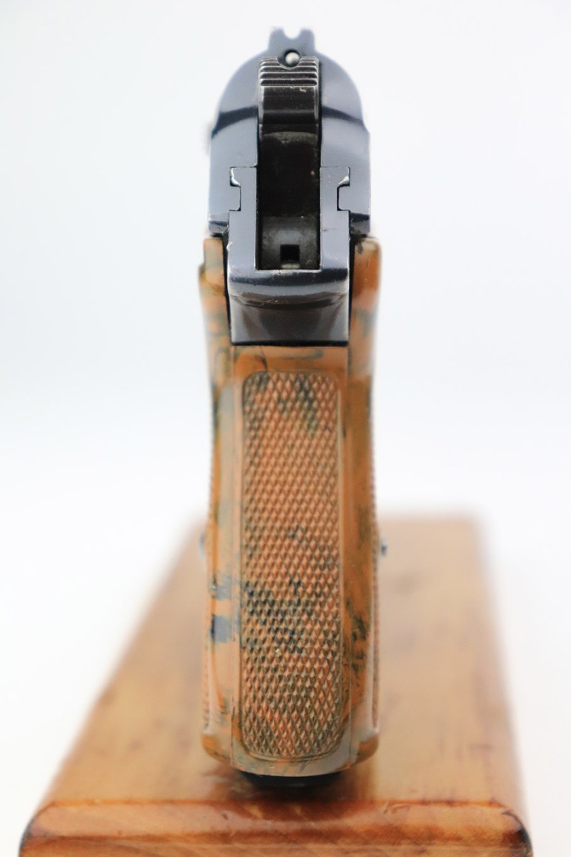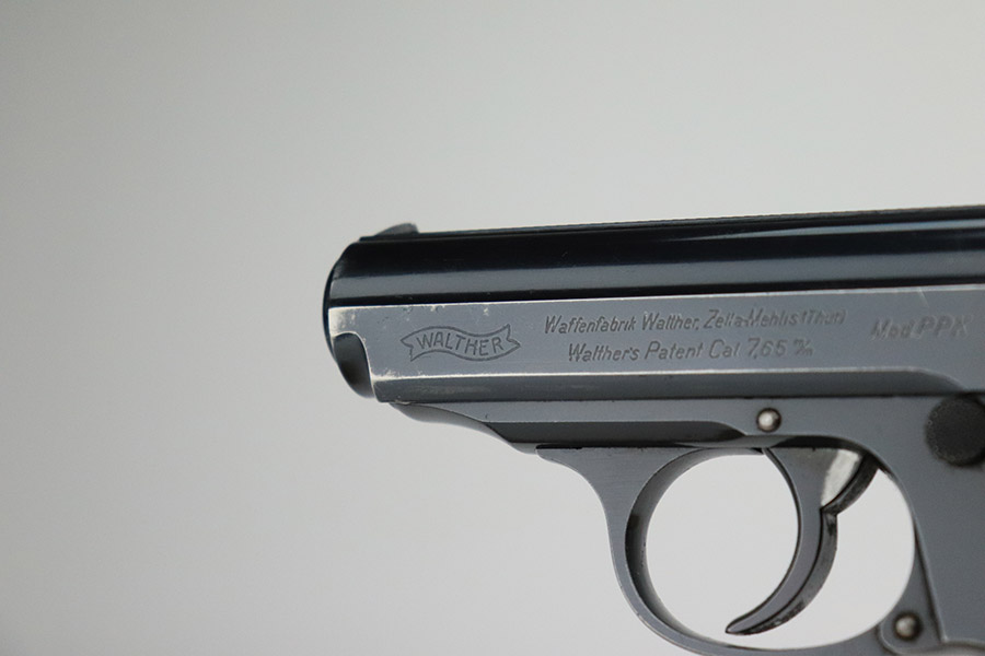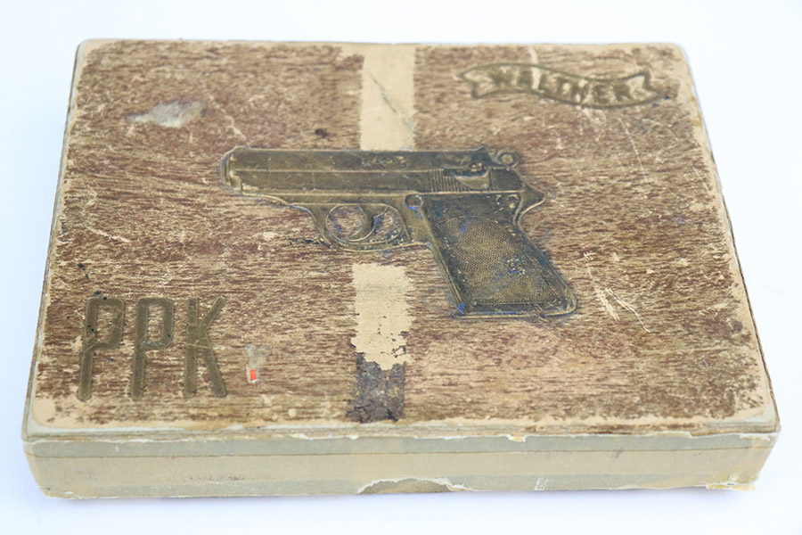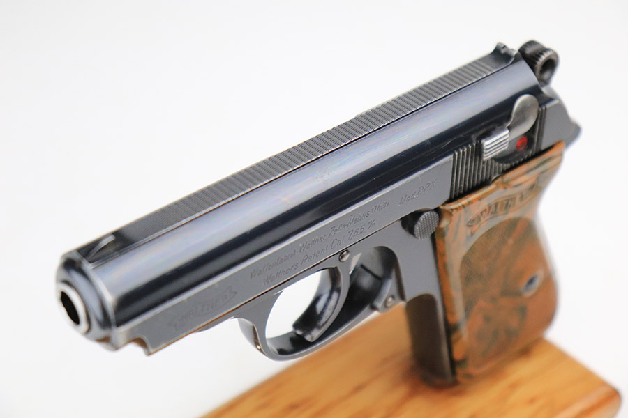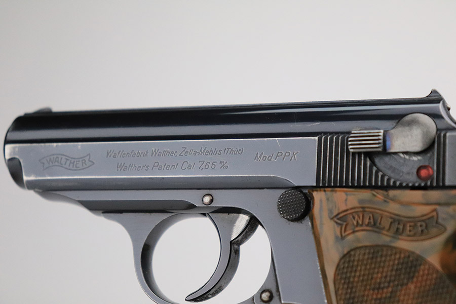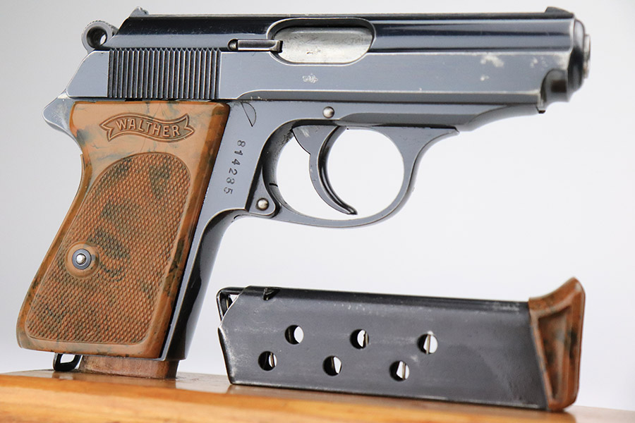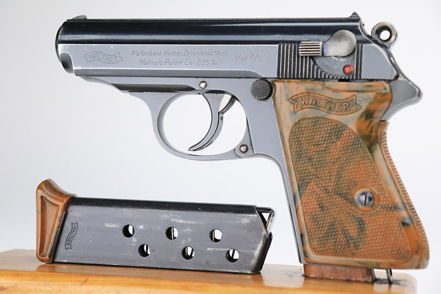 11/8/22 – This is an excellent example of a Walther PPK sold in the commercial market in 1934. It is all matching and has the proper “Crown N” commercial proofs. It comes with a period-correct box (no numbered label), one finger extension magazine, one spare flat-bottom magazine, a cleaning rod, and a period-correct cleaning tin with an original yellow cloth and glass oiler with some of the original oil in it. The box has a pink interior. The side panels have been reinforced with masking tape. The gun itself has retained about 96-97% of its original high polish finish. There is minor muzzle wear and very minor wear concentrated around the high edges of the slide. A couple of small spots of wear on the right side of the slide and a couple of very light surface scratches on the left side. Comes with an excellent brown Walther grip – no cracks or chips. Mint bore.