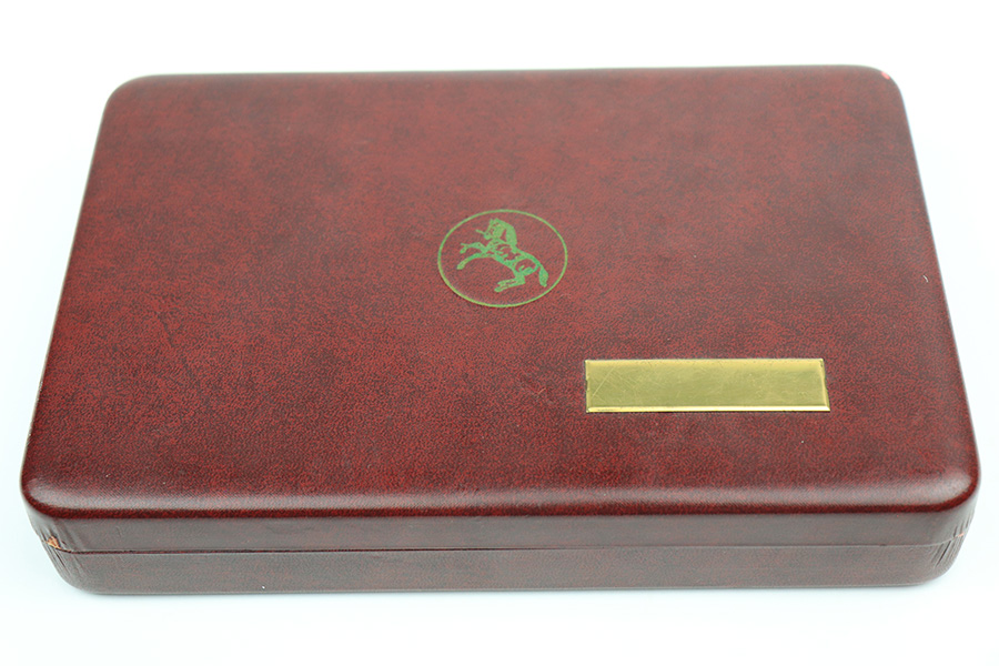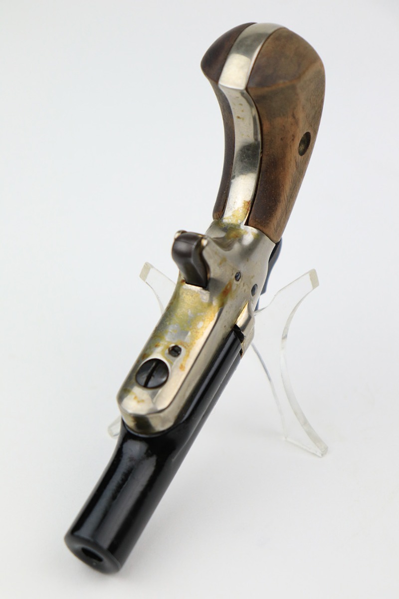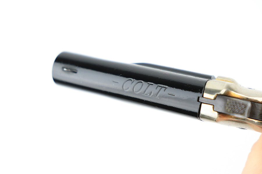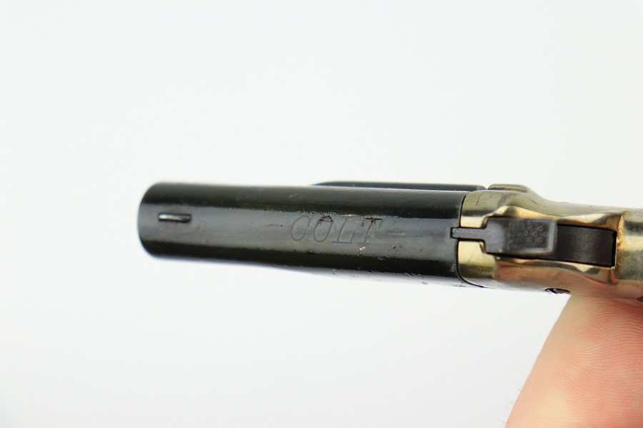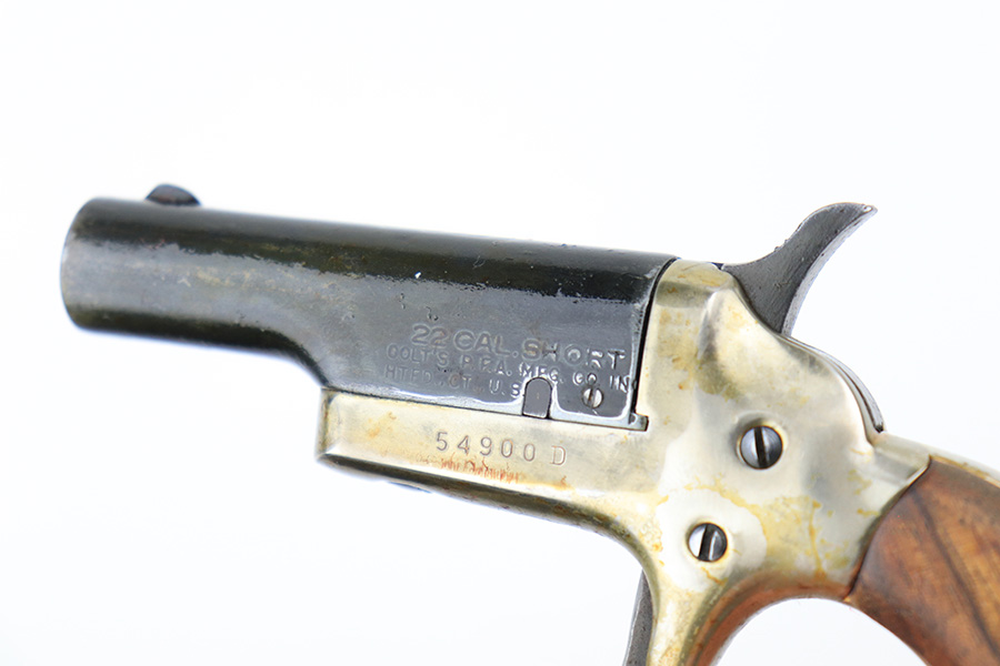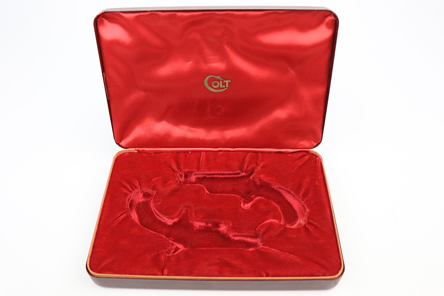 5/3/22 – This is a very nice set of two Dueling Colt Deringer pistols. These are 4th Model examples, manufactured between 1959-1963. The guns are one serial number away from being consecutively-numbered. They come in a really nice red velvet-lined Colt hard case with a gold plate on the outside to engrave someone’s name (currently blank). Both pistols are in nice condition, but 54898D shows fewer signs of use. On both pistols, the light gold wash on the frames has mostly worn away and there are tiny dots of discoloration. 54900D shows signs of wear along the barrel. 54898D has a bore that is near mint. 54900D has an excellent bore, but there are some tiny dots of oxidation. Both have excellent wood grips.