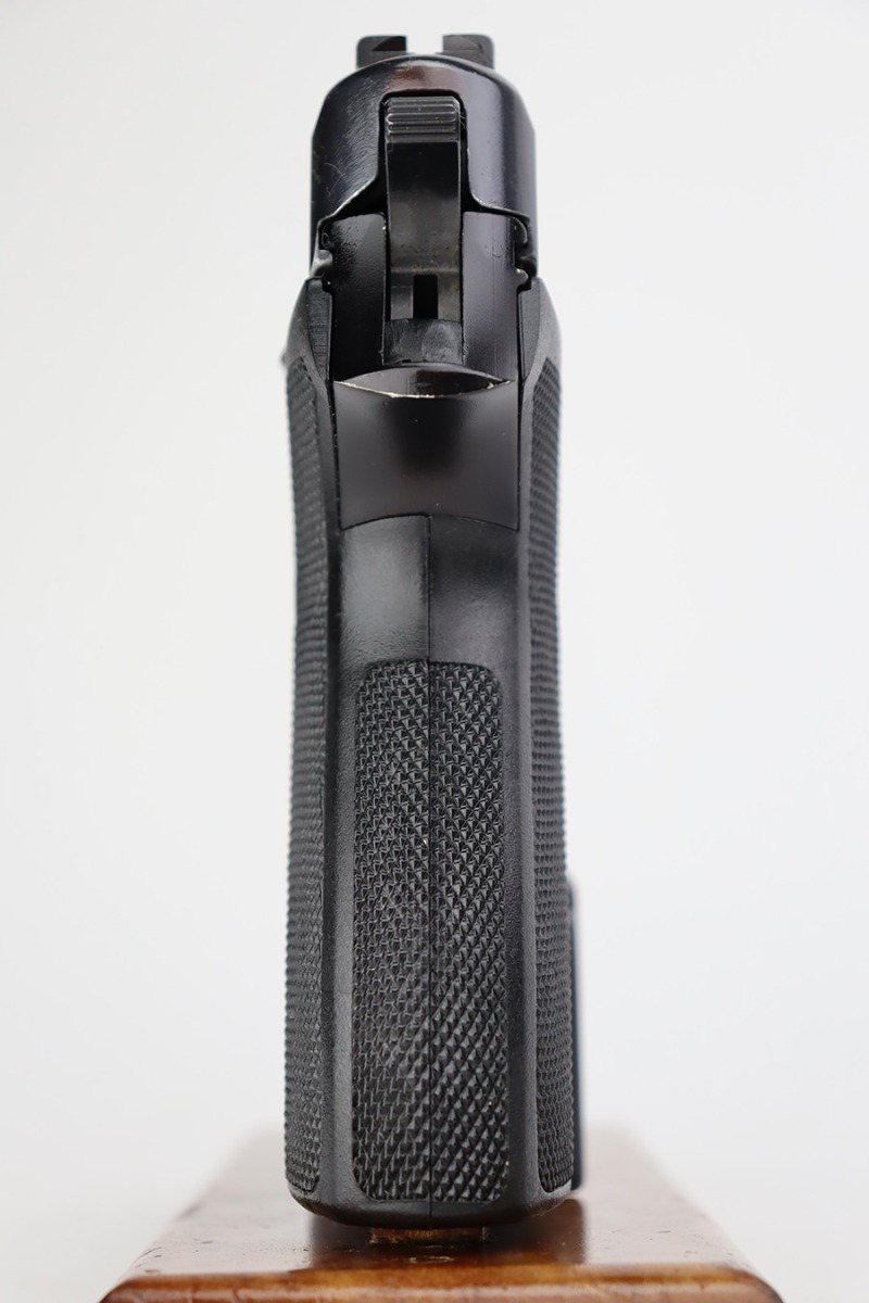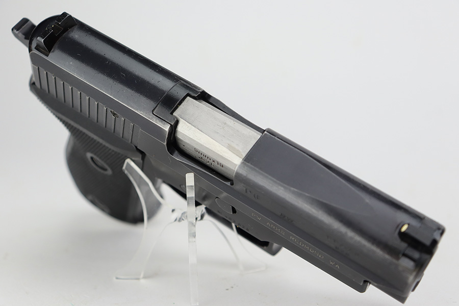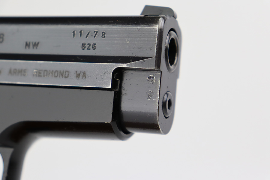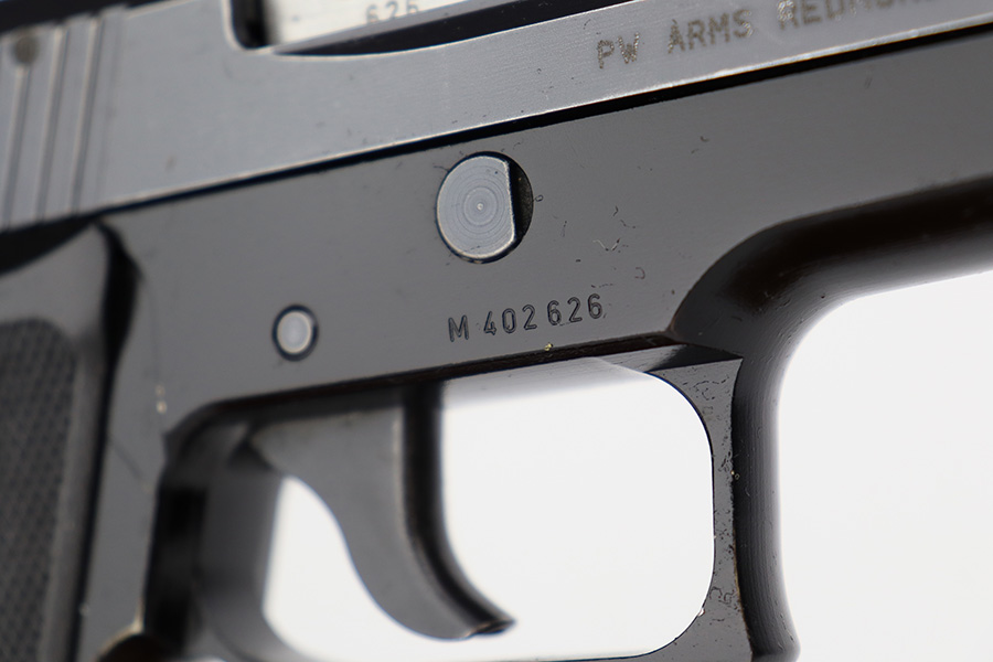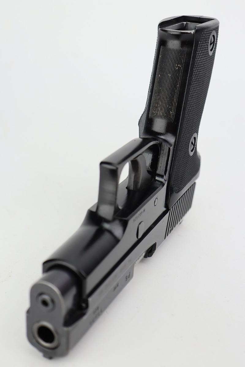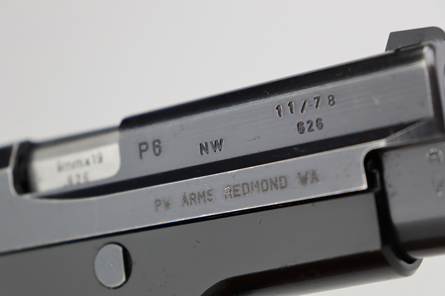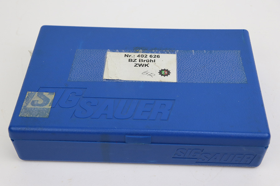 7/11/23 – This is an excellent example of an early Sig Sauer P6, manufactured in November of 1978. All matching with the proper West German proofs. Import mark on the right side of the slide. The gun comes with a proper blue box (hand-numbered to match) and two magazines. The gun itself has retained about 96% of its original finish with just minor high edge wear. Fitted with excellent black plastic grips. Minty bore.
