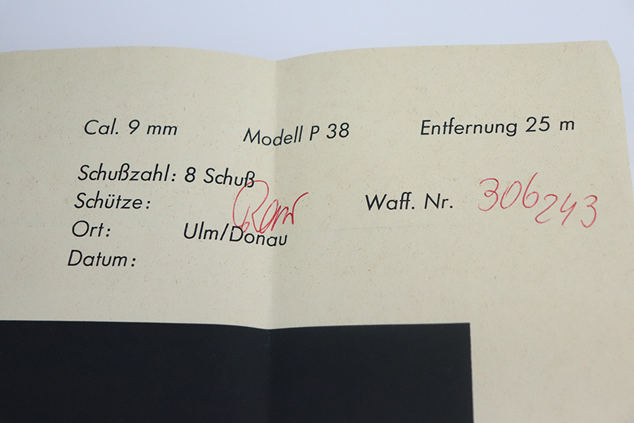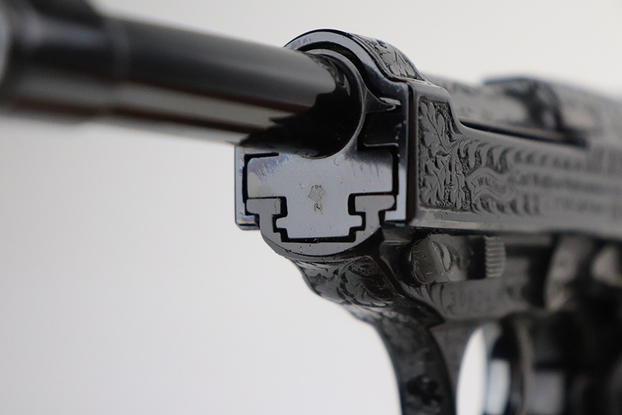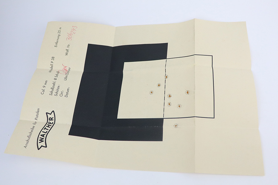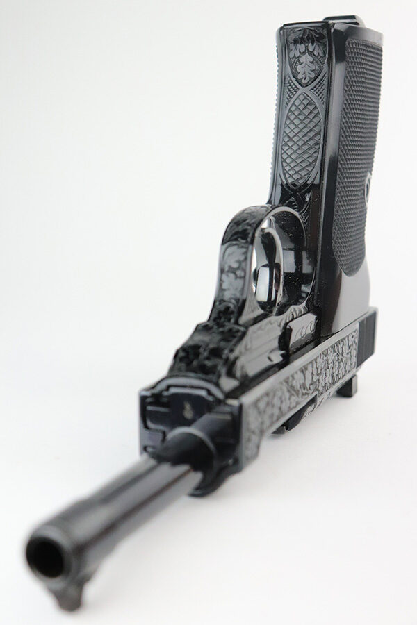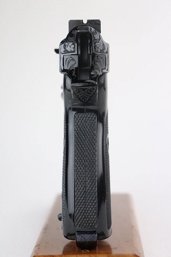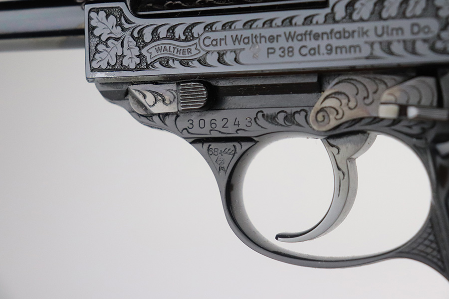 7/1/21 – This is an absolutely stunning example of a factory-engraved Walther P.38 manufactured in 1968. It is all matching and has the proper German proofs. It comes with the original matching box, matching test target, cleaning rod, and two original magazines that are engraved on the bottom. The gun is in gorgeous, like-new condition with no signs of wear. The whole gun features a beautiful traditional German oak leaf and acorn engraving pattern. Excellent black plastic grips. Mint bore. Just a stunning gun.