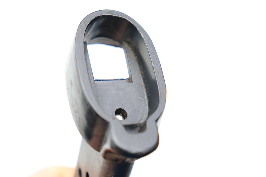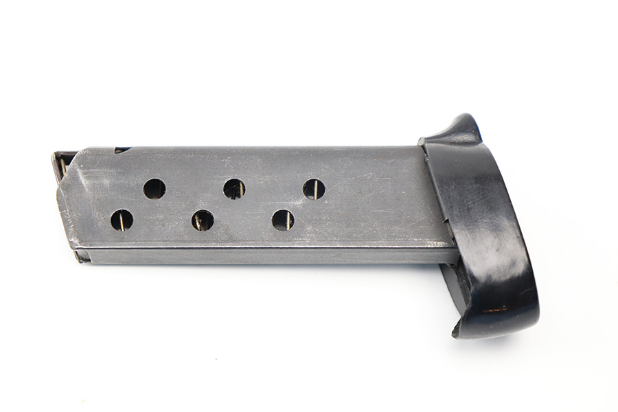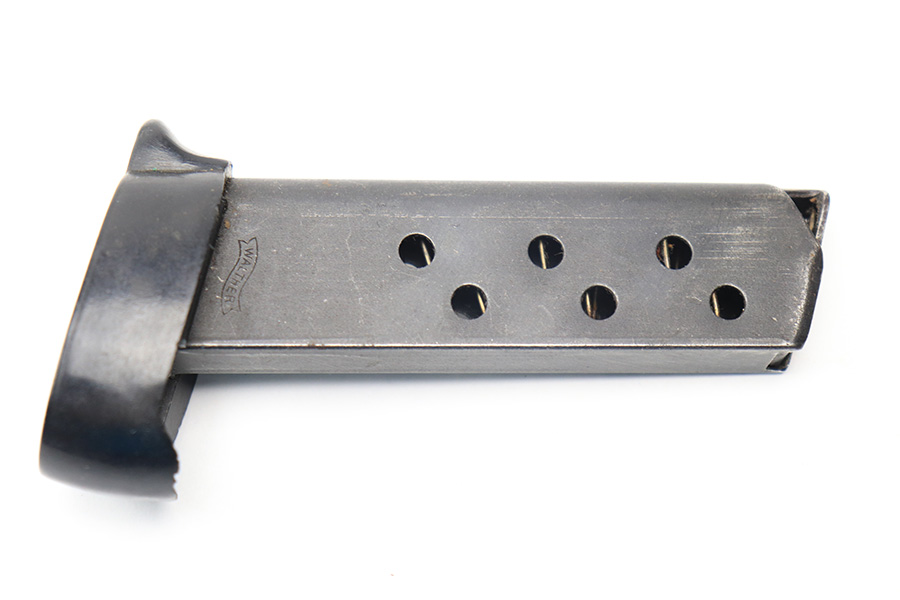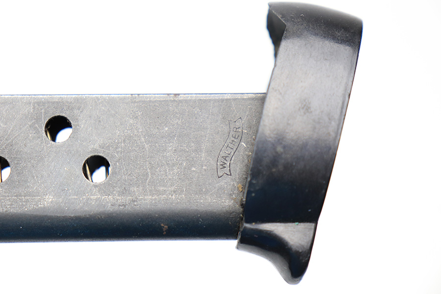 12/1/21 – This is an original WW2 era production Walther PP magazine with a rare boxed finger extension. The bakelite finger extension is in good overall condition despite some chipping on the back “fin” or rear spine / lip of the finger extension. This is the most common area for wear on these magazines. The rest of the magazine is in great condition with no notable flaws and a fully functional spring.