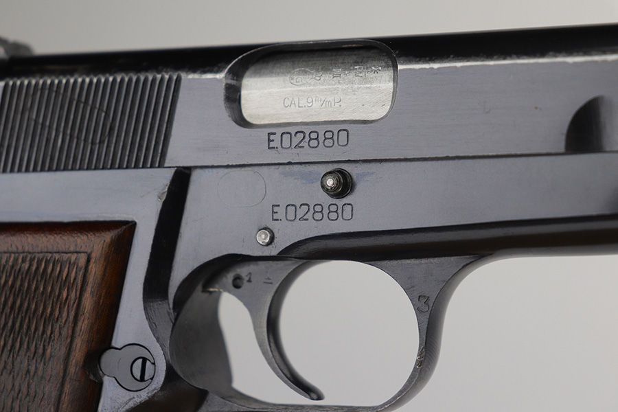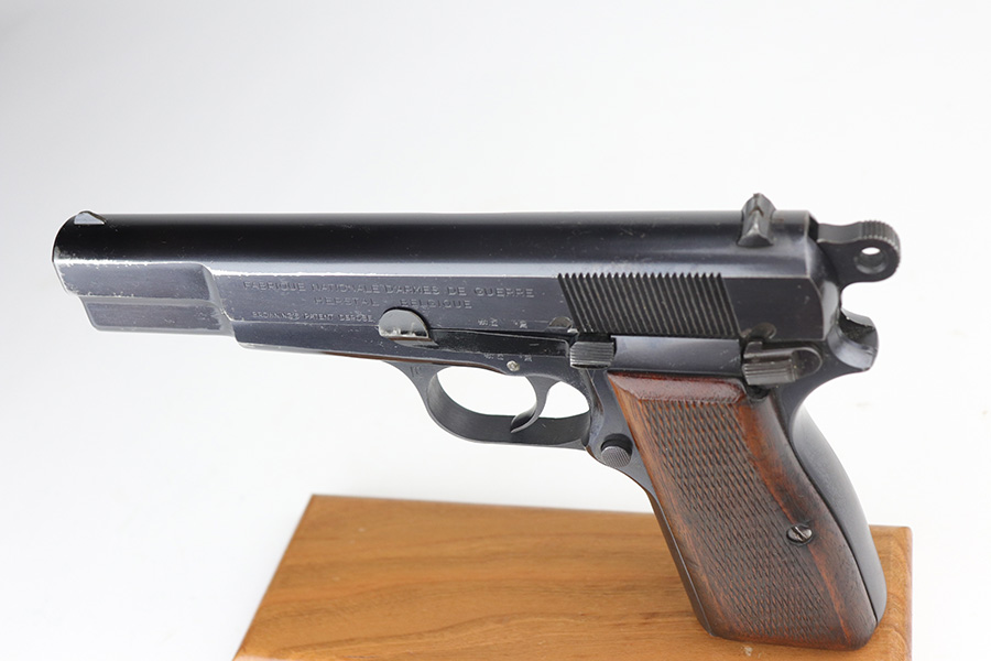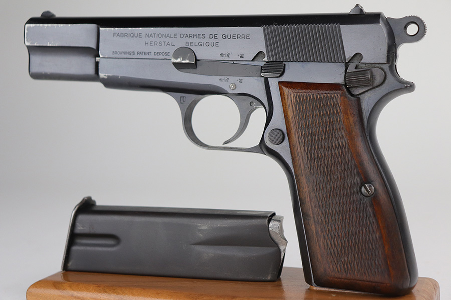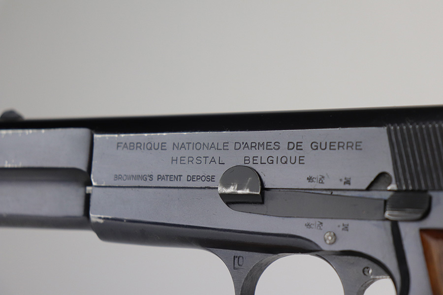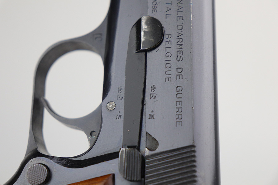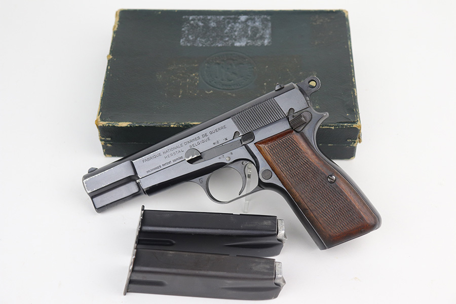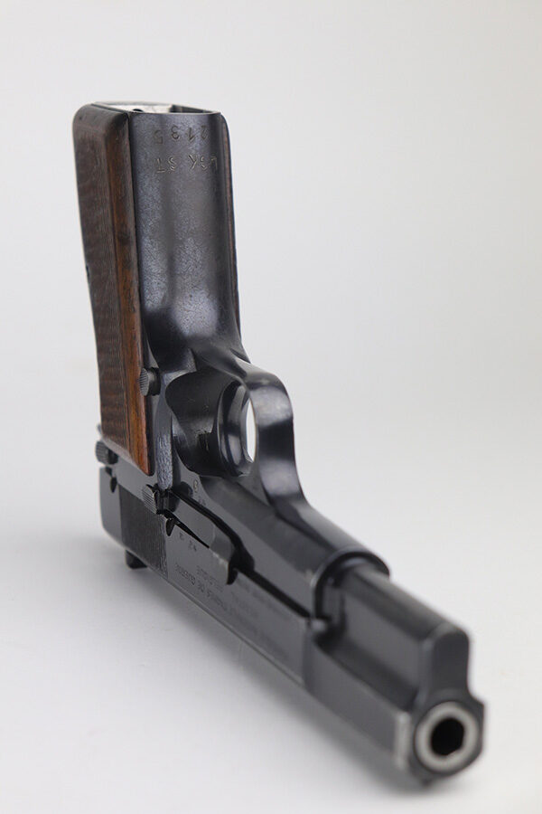 11/23/21 – This is a very nice example of an FN Browning Hi Power manufactured in the late 1950’s. It comes with a period-correct cardboard box that is not matching but very close. The gun is all matching, has the proper Belgian proofs, and has an “LSK ST 2135” marking on the front strap. This indicates that the gun was delivered to the Austrian government and issued to the Austrian State Police of Steiermark or Styria. The gun also comes with two matching-numbered magazines. It has retained about 93% of its finish. There is somewhat spotty wear concentrated on the high edges of the slide and around the muzzle. Minor wear on the front edges of the frame and an area of scratchy wear on the top of the slide. While there isn’t a ton of actual finish loss, there is noticeable scratchy wear and patina on both grip straps. Comes with nice period-correct wood grips – some minor bruising here and there. The bore is mint.
