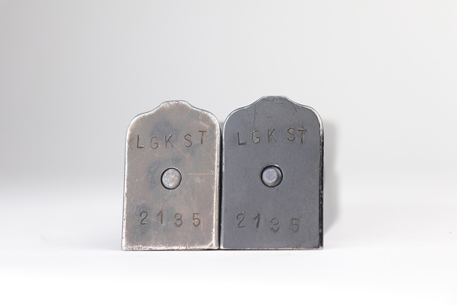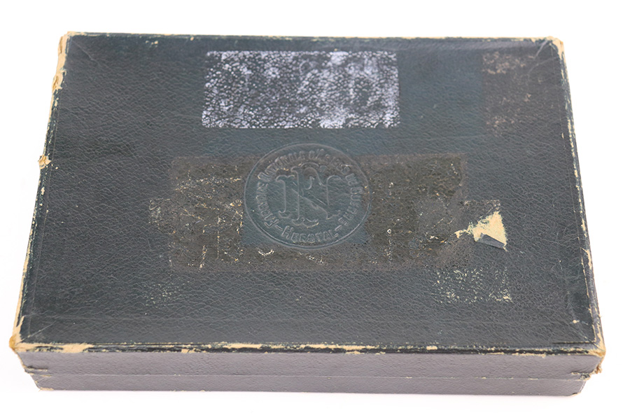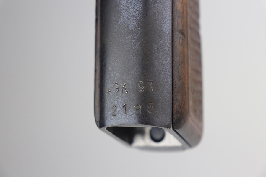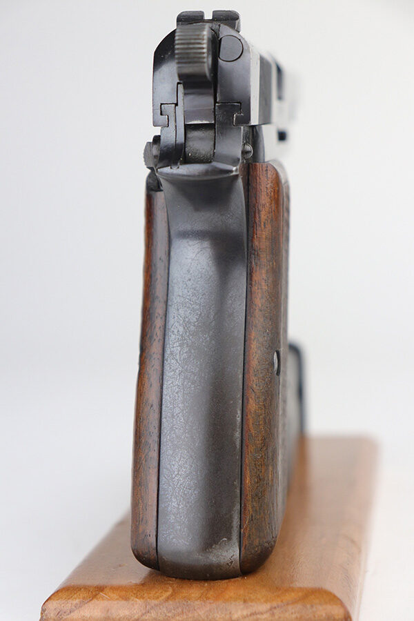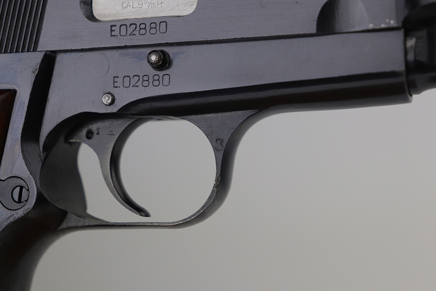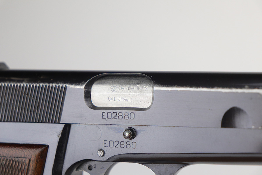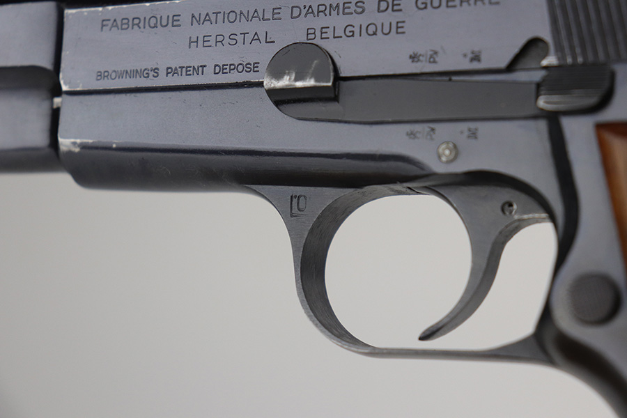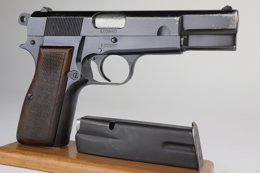 11/23/21 – This is a very nice example of an FN Browning Hi Power manufactured in the late 1950’s. It comes with a period-correct cardboard box that is not matching but very close. The gun is all matching, has the proper Belgian proofs, and has an “LSK ST 2135” marking on the front strap. This indicates that the gun was delivered to the Austrian government and issued to the Austrian State Police of Steiermark or Styria. The gun also comes with two matching-numbered magazines. It has retained about 93% of its finish. There is somewhat spotty wear concentrated on the high edges of the slide and around the muzzle. Minor wear on the front edges of the frame and an area of scratchy wear on the top of the slide. While there isn’t a ton of actual finish loss, there is noticeable scratchy wear and patina on both grip straps. Comes with nice period-correct wood grips – some minor bruising here and there. The bore is mint.