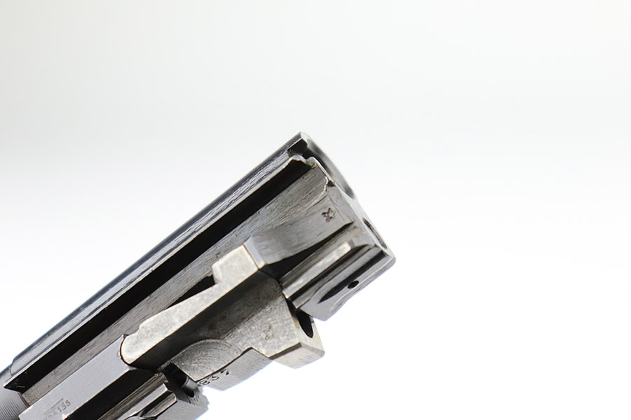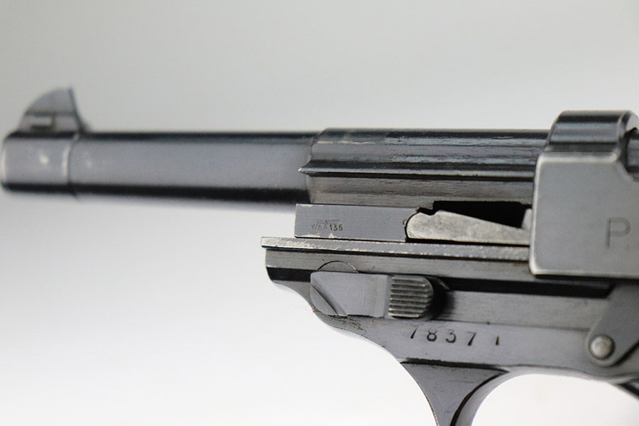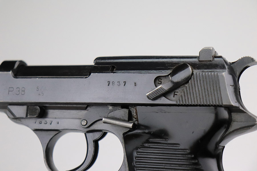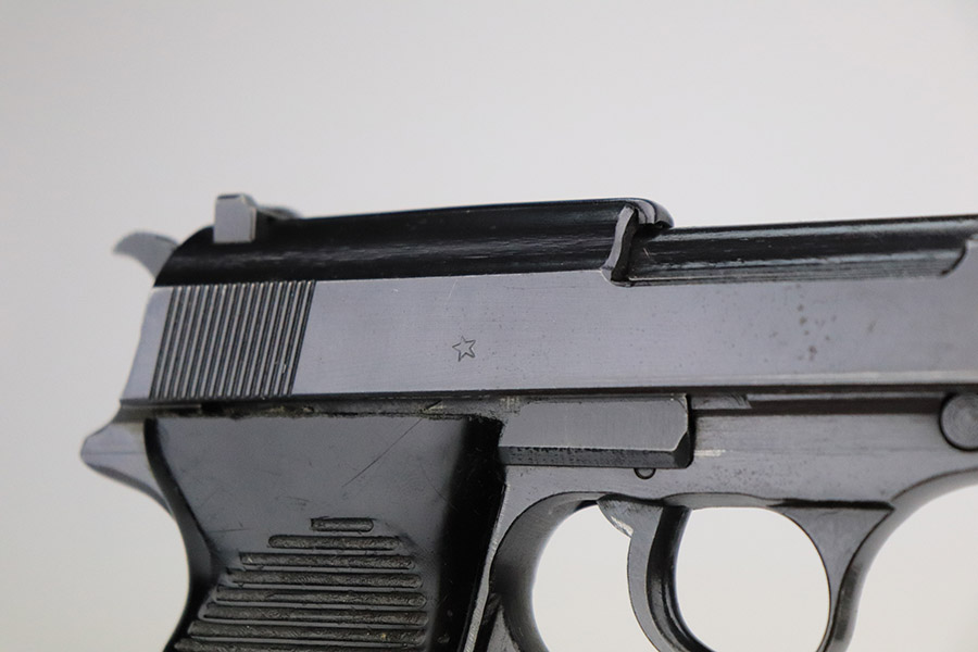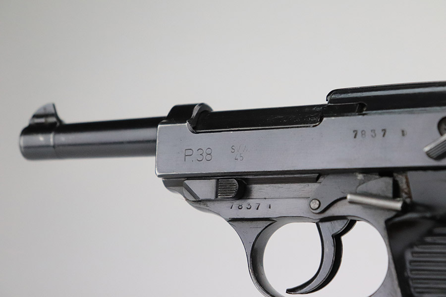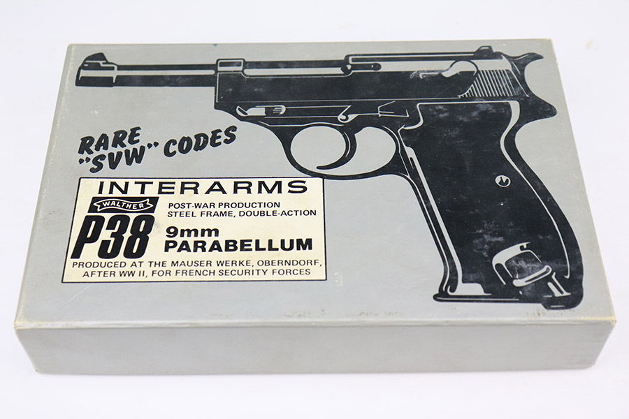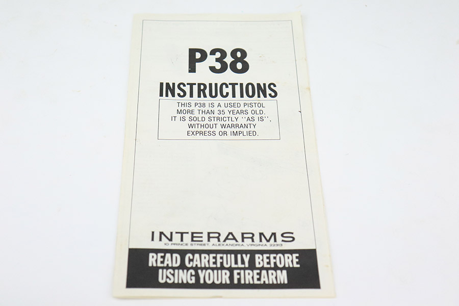 11/17/22 – This is an excellent example of a Mauser P.38 put together by the French using leftover Nazi parts immediately after WW2, in 1945-46. This one was imported by Interarms. It comes with its original matching Interarms box, owners manual, and one “Eagle 359” Walther magazine (small dent on the left side of the tube). The gun is all matching, has a French star on the right side of the slide, and has one “Waffen 135” Nazi military acceptance proof on the barrel. Import mark on the underside of the slide. The gun is in minty condition, retaining nearly all of its finish with just very minor muzzle wear and hints of wear on the high edges in general. Very minor pin-pricking and light brown patina on the front strap. Comes with black plastic grips – dings and scratches on both sides and slightly shaved along the top edges. The bore has strong rifling with very minor pin-pricking throughout. De-cocker is functional.