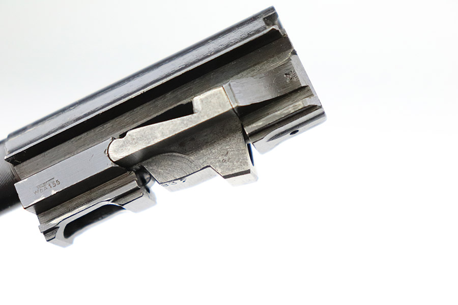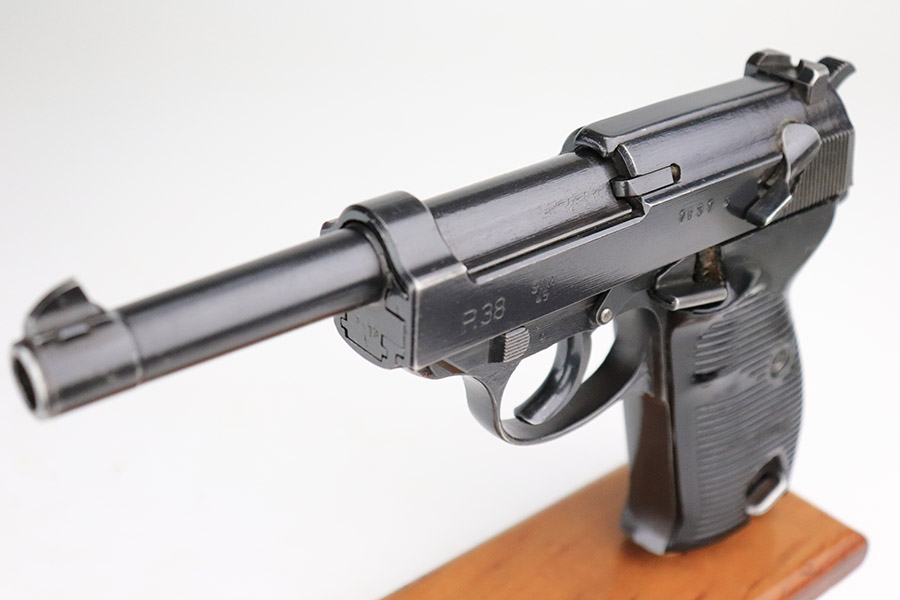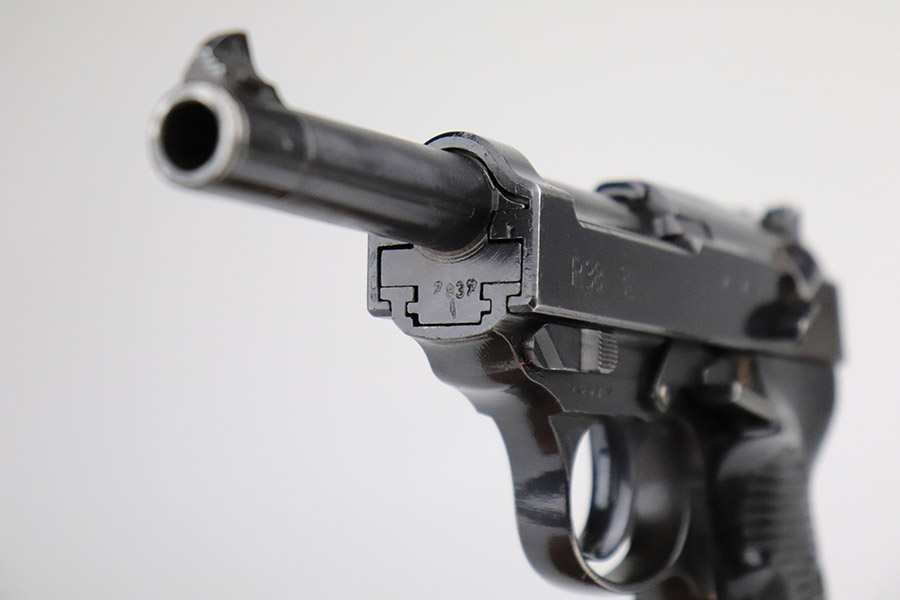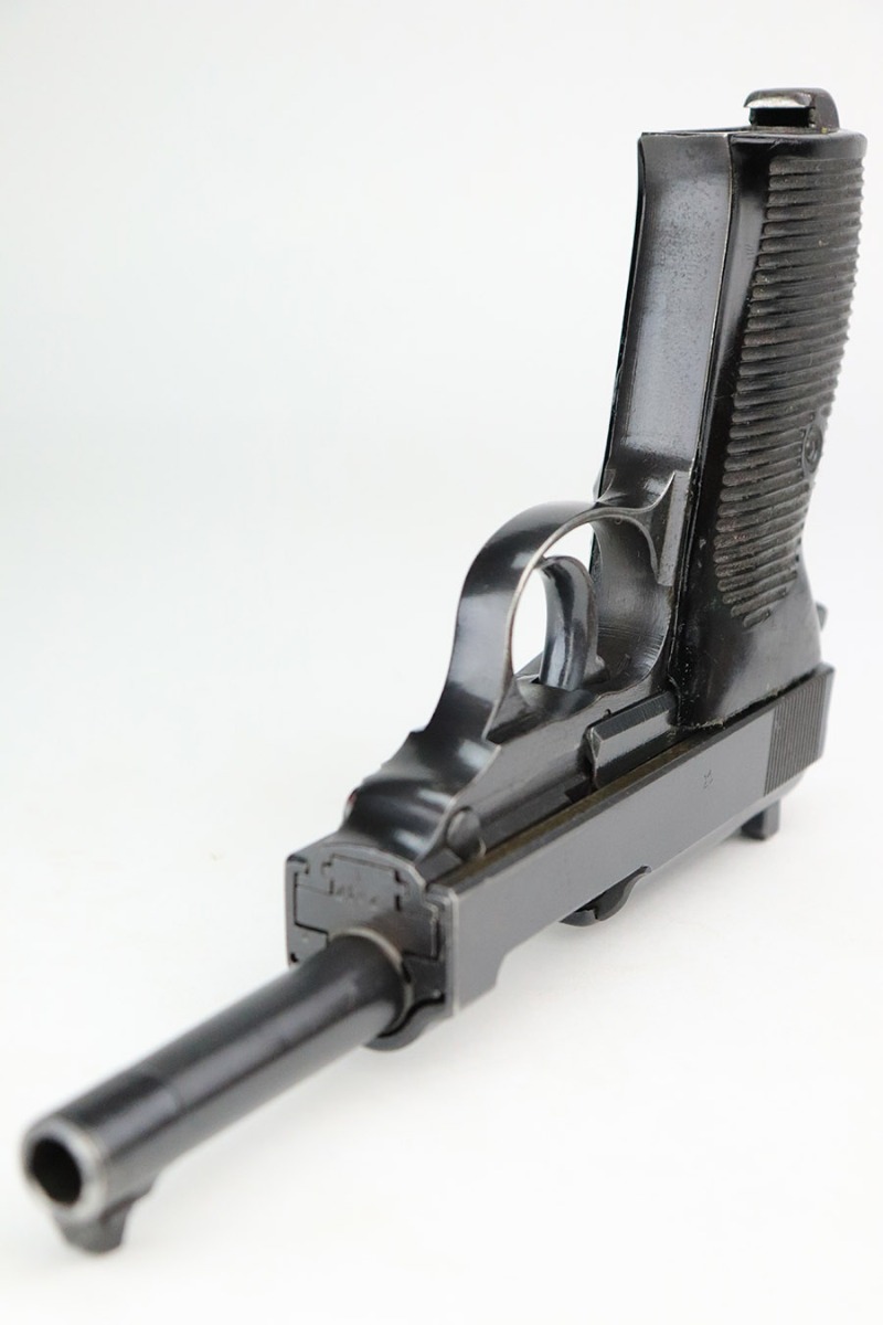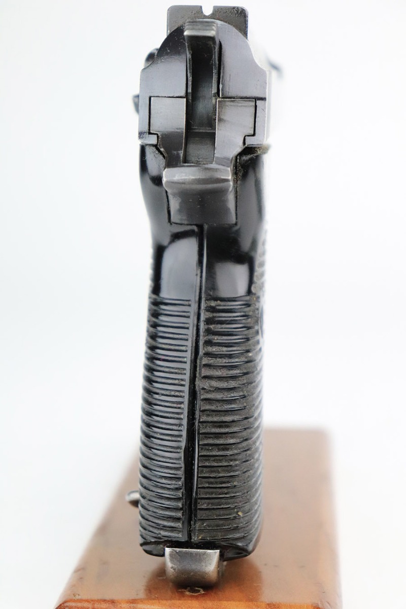 11/17/22 – This is an excellent example of a Mauser P.38 put together by the French using leftover Nazi parts immediately after WW2, in 1945-46. This one was imported by Interarms. It comes with its original matching Interarms box, owners manual, and one “Eagle 359” Walther magazine (small dent on the left side of the tube). The gun is all matching, has a French star on the right side of the slide, and has one “Waffen 135” Nazi military acceptance proof on the barrel. Import mark on the underside of the slide. The gun is in minty condition, retaining nearly all of its finish with just very minor muzzle wear and hints of wear on the high edges in general. Very minor pin-pricking and light brown patina on the front strap. Comes with black plastic grips – dings and scratches on both sides and slightly shaved along the top edges. The bore has strong rifling with very minor pin-pricking throughout. De-cocker is functional.