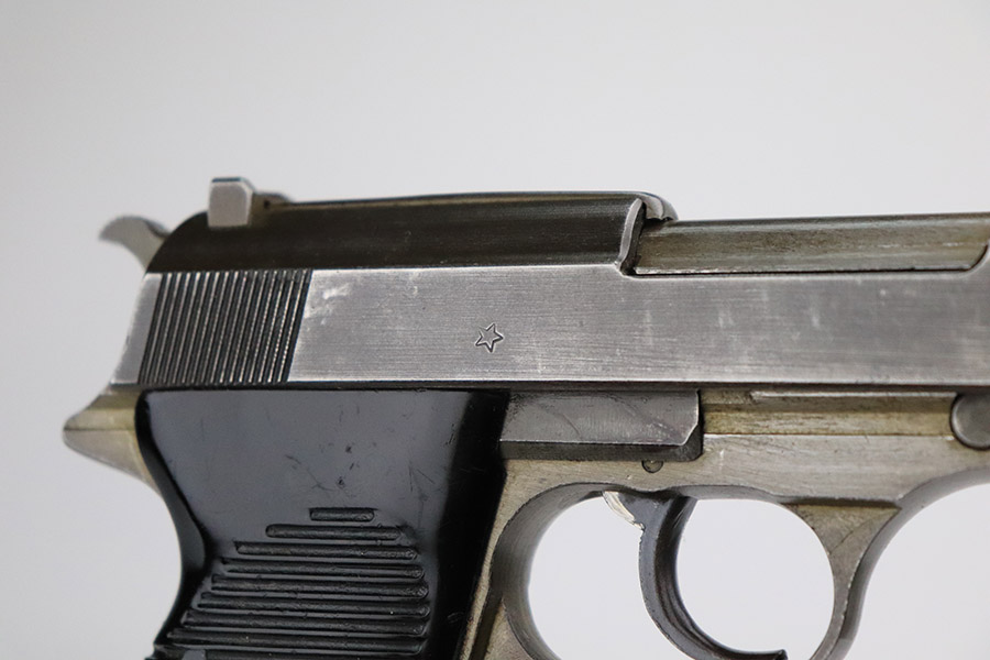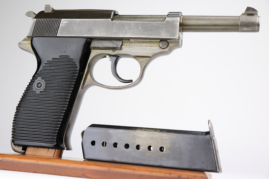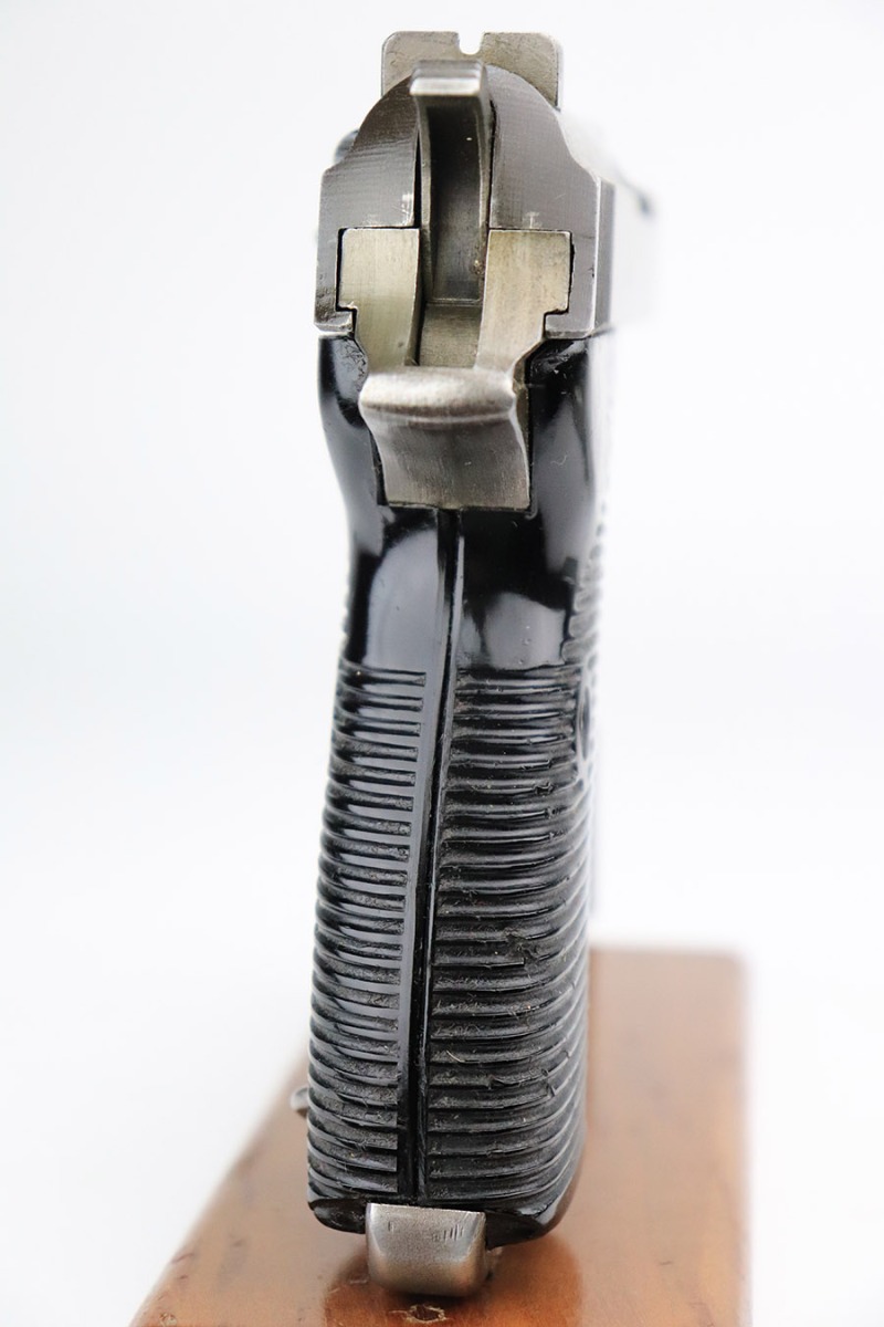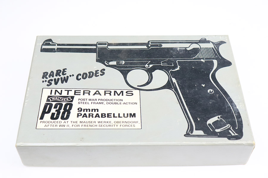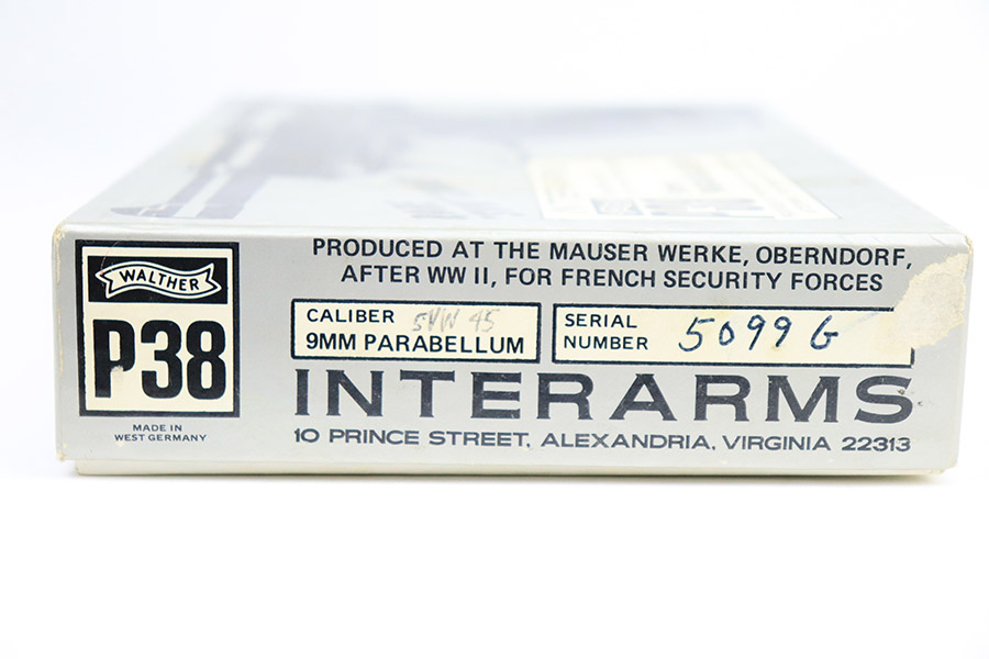 8/15/23 – This is an excellent example of a Mauser P.38 put together by the French using leftover Nazi parts immediately after WW2. This one was imported by Interarms. It comes with its original matching Interarms box, owners manual, and one magazine. The gun is all matching, has a French star on the right side of the slide, and has one “Waffen 135” Nazi military acceptance proof on the barrel. Import mark on the underside of the slide. The gun is in excellent condition. This phosphate finish is difficult to rate, but we estimate that it has retained about 90%. The finish on the frame is thin by nature, it does not appear to be actual wear. There is very minor thinning on the front strap, minor wear around the high edges of the right side of the slide, and a few tiny dots of discoloration here and there. Comes with black plastic grips – slightly shaved along the top edge of the left panel. Mint bore. De-cocker is functional.