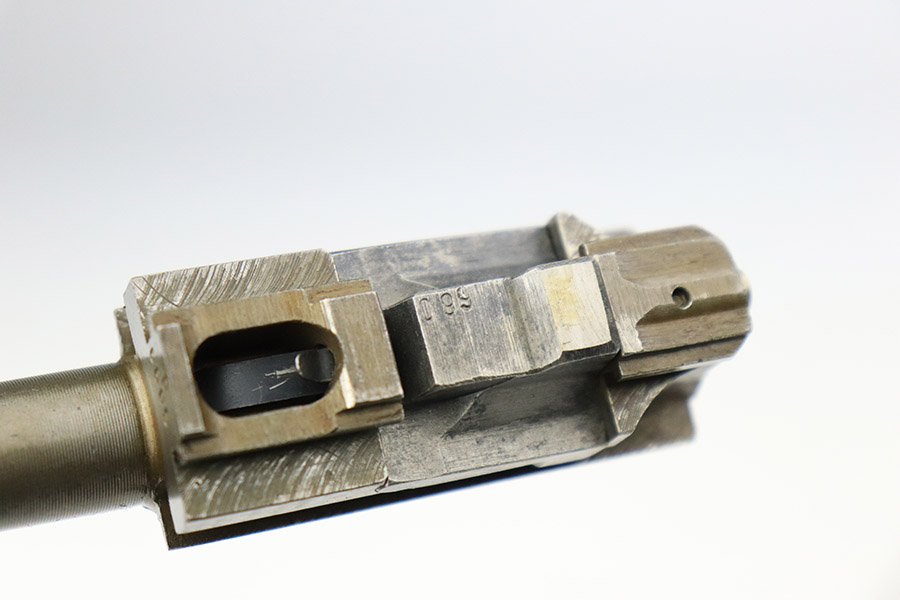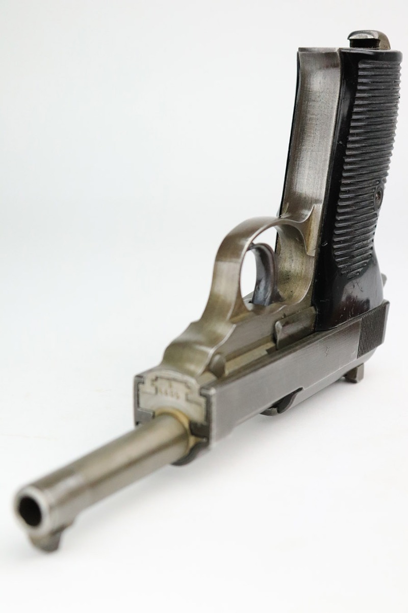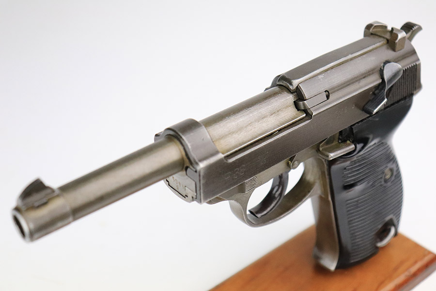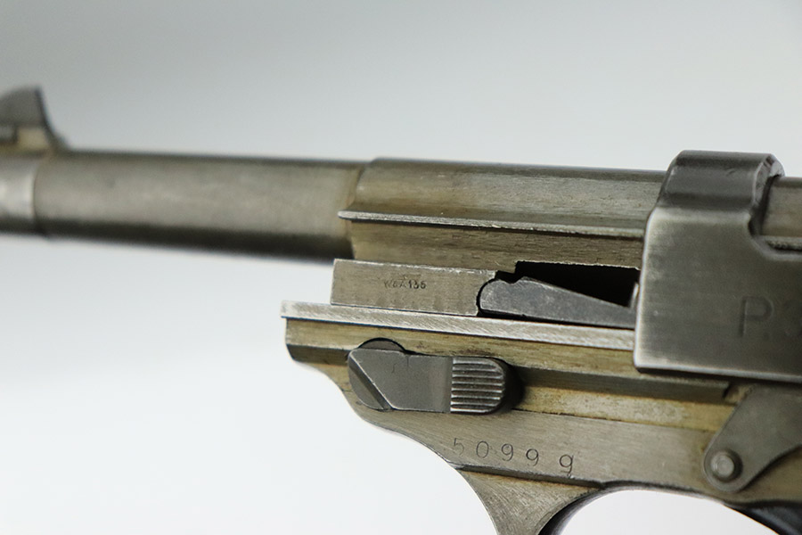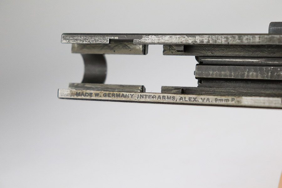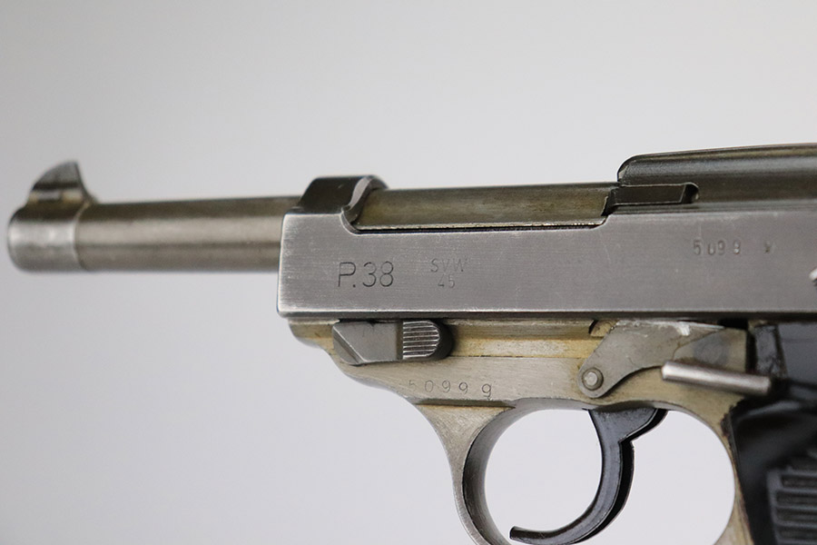 8/15/23 – This is an excellent example of a Mauser P.38 put together by the French using leftover Nazi parts immediately after WW2. This one was imported by Interarms. It comes with its original matching Interarms box, owners manual, and one magazine. The gun is all matching, has a French star on the right side of the slide, and has one “Waffen 135” Nazi military acceptance proof on the barrel. Import mark on the underside of the slide. The gun is in excellent condition. This phosphate finish is difficult to rate, but we estimate that it has retained about 90%. The finish on the frame is thin by nature, it does not appear to be actual wear. There is very minor thinning on the front strap, minor wear around the high edges of the right side of the slide, and a few tiny dots of discoloration here and there. Comes with black plastic grips – slightly shaved along the top edge of the left panel. Mint bore. De-cocker is functional.