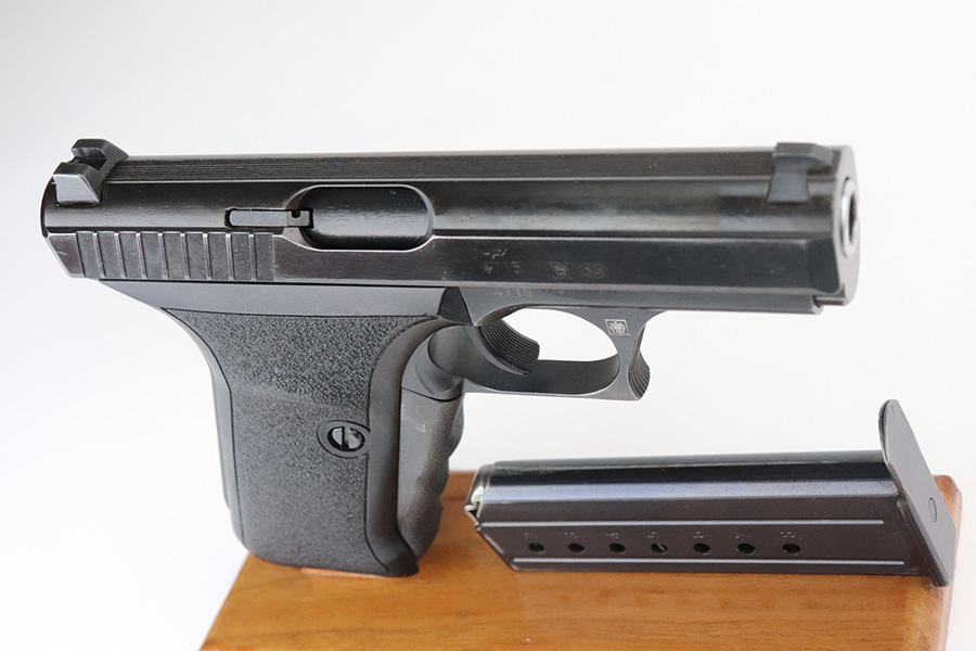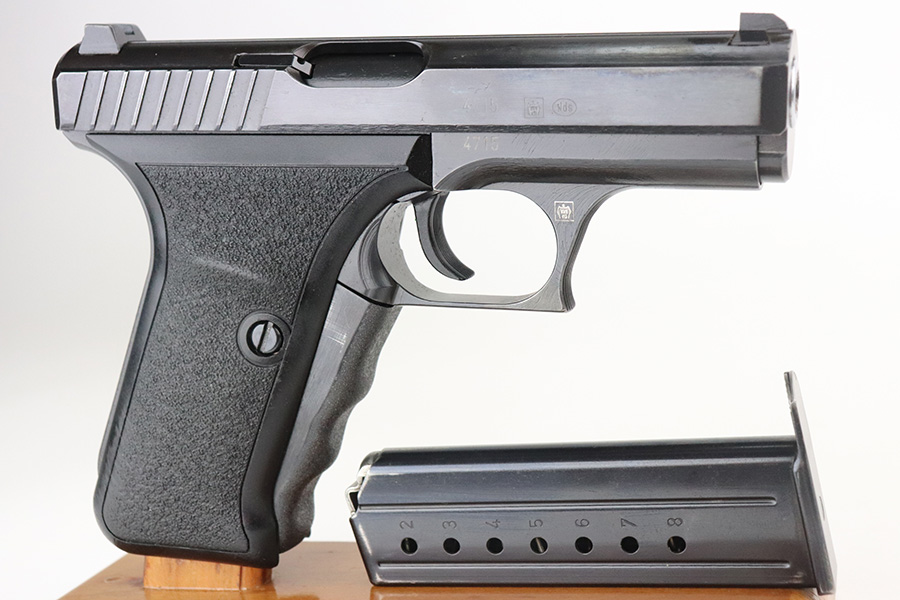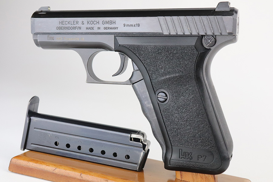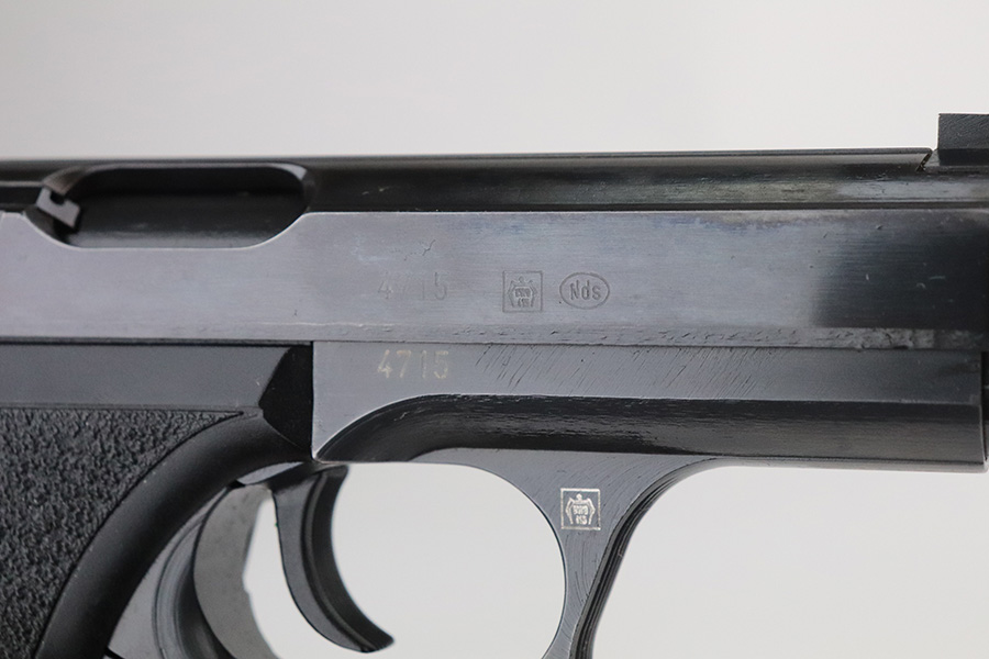 7/27/21 – This is a near-mint Heckler & Koch P7 in its original, matching box. The pistol has a hint of high edge wear but is otherwise in excellent condition with a minty bore. It’s NDS marked on the slide, which refers to a police trade-in P7 which was carried in the German state of “Niedersachsen” (Lower Saxony). It appears to have a low serial but we aren’t certain what year it was manufactured. The original box is numbered to the gun, and contains the manual and spare magazine. The box shows some wear but is structurally intact. FFL required.