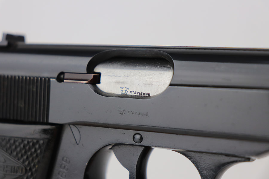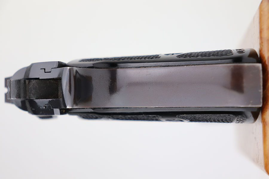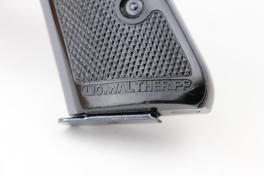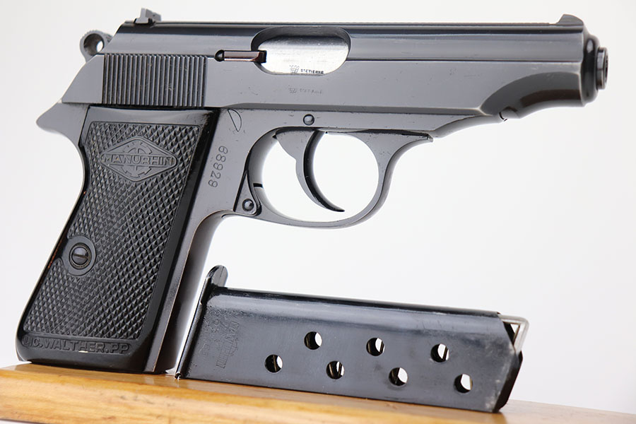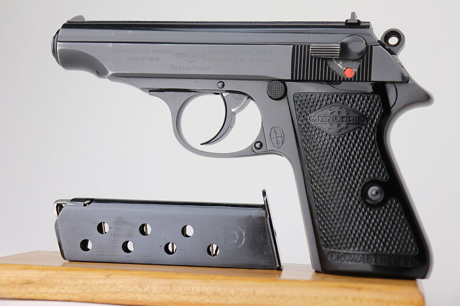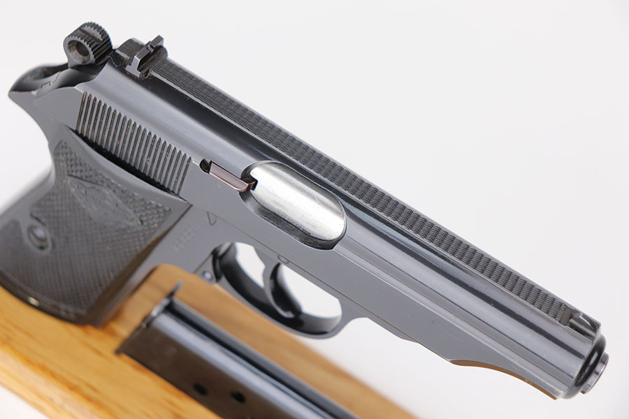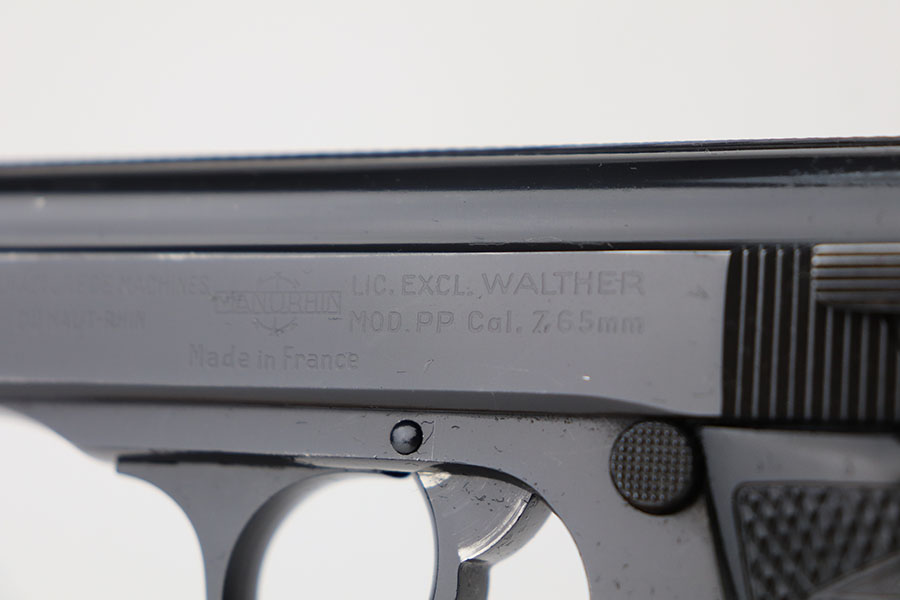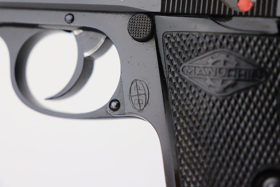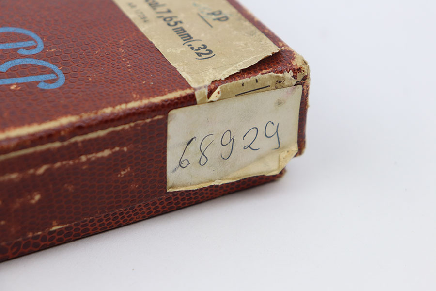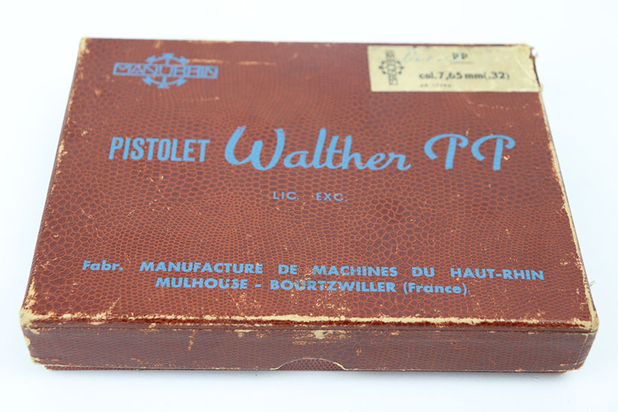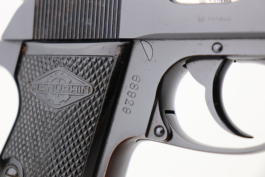 4/6/21 – This is an original Manurhin PP that went to the Bavarian police. It’s in an original Manurhin box, though the numbering on the label is not factory original. The gun has 95-97% of the original blue remaining, with minor high edge wear on the slide, and some patina throughout on the grip straps. Minty bore and grips. The slide and ejection port are marked ‘ST ETIENNE’, indicating the pistol went through the French proof house before going to Germany. The ‘Byp’ marking on the frame indicates the police use, but it was crossed out after the pistol was then released to the commercial market. No import mark.