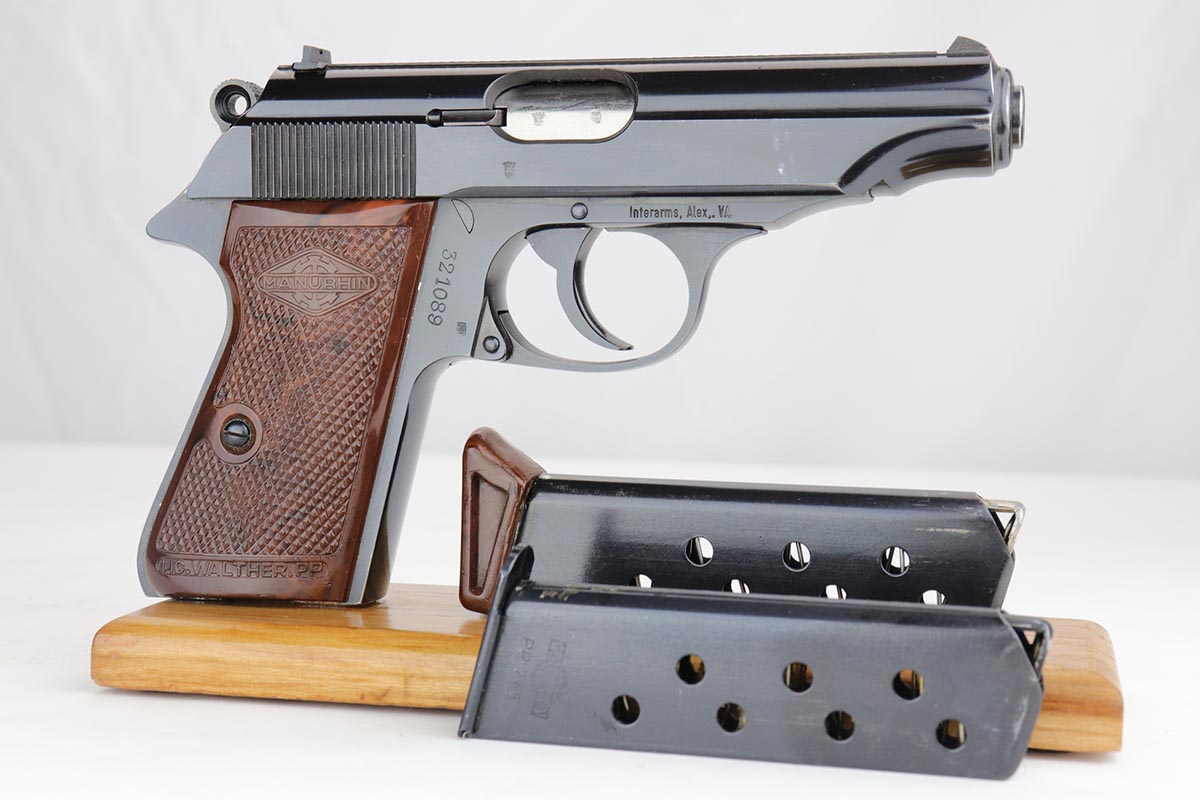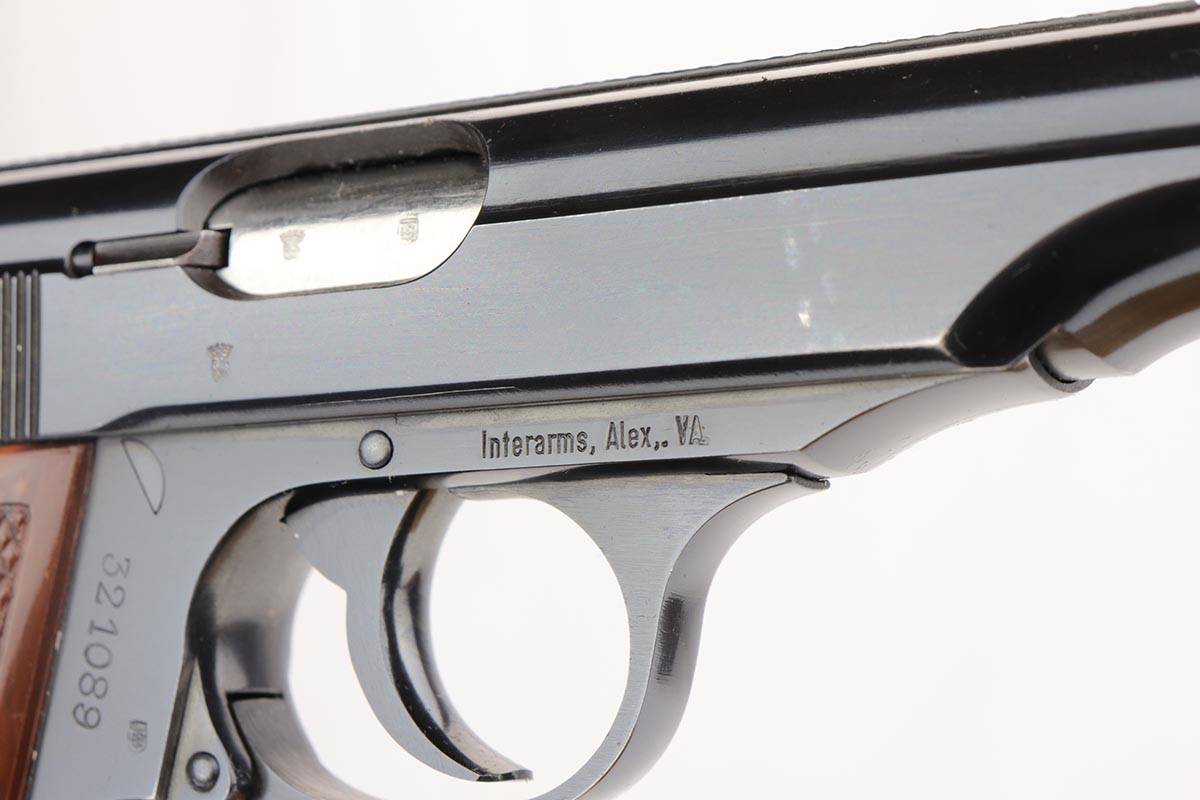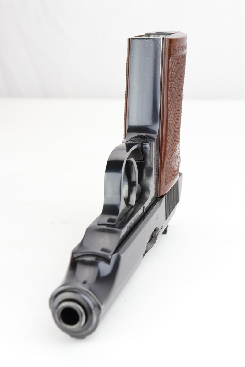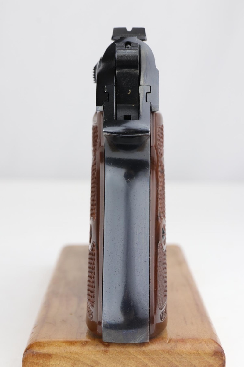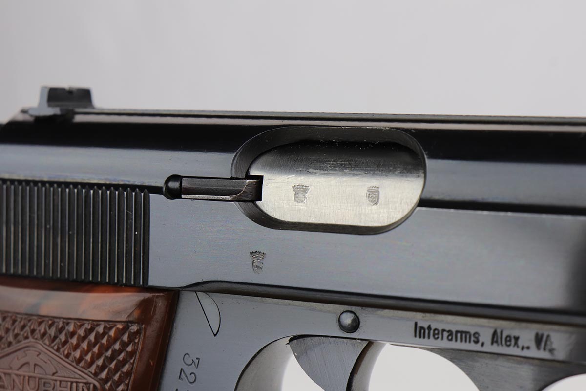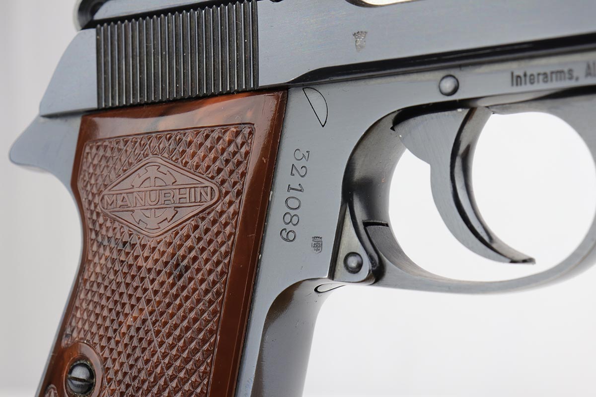 11/21/19 – This is an excellent Manurhin produced PP that was manufactured in the early 1970s. It has about 98% blue remaining, with minor edge thinning, and a little bit of thinning on the straps. The pistol is Interarms stamped, and comes in an original Manurhin box which has the Interarms label with matching serial to the pistol. Mint bore. Box has cleaning rod and manual inside. FFL required
