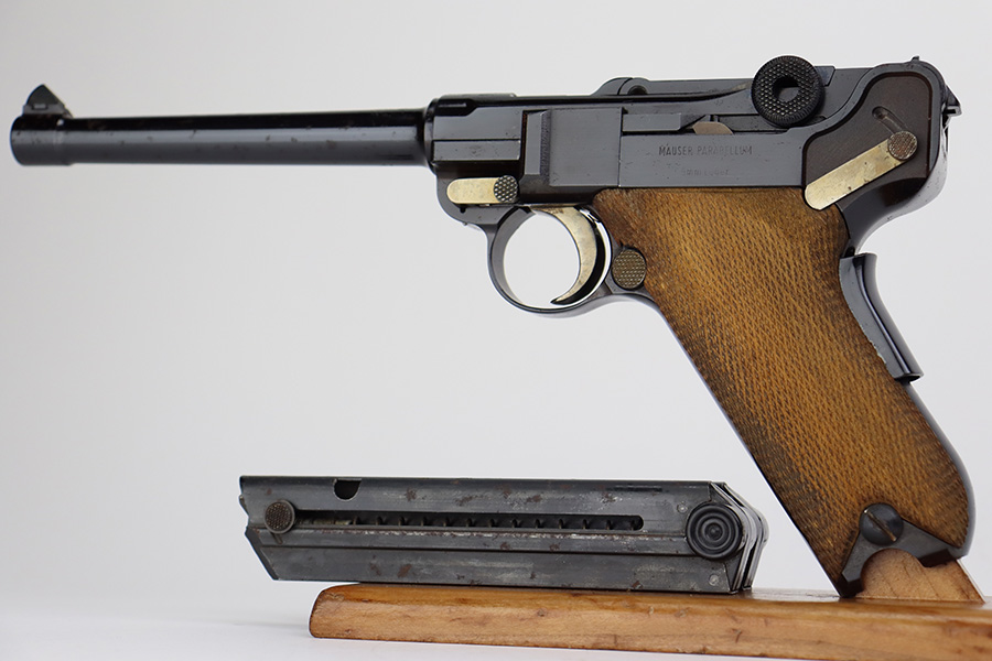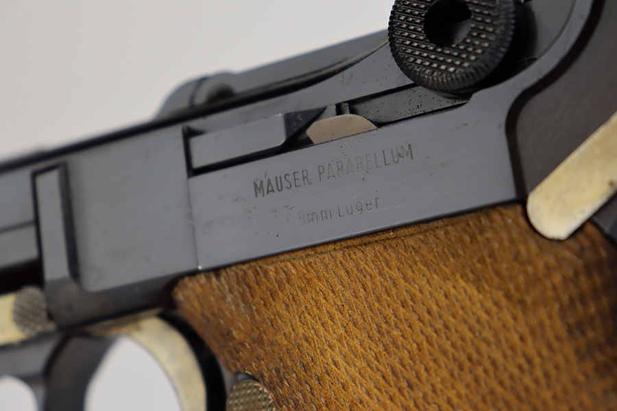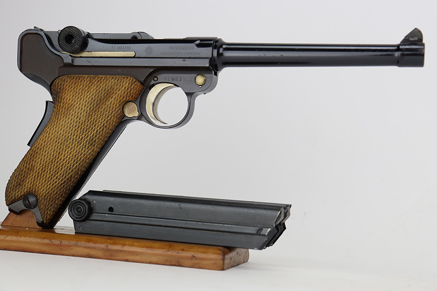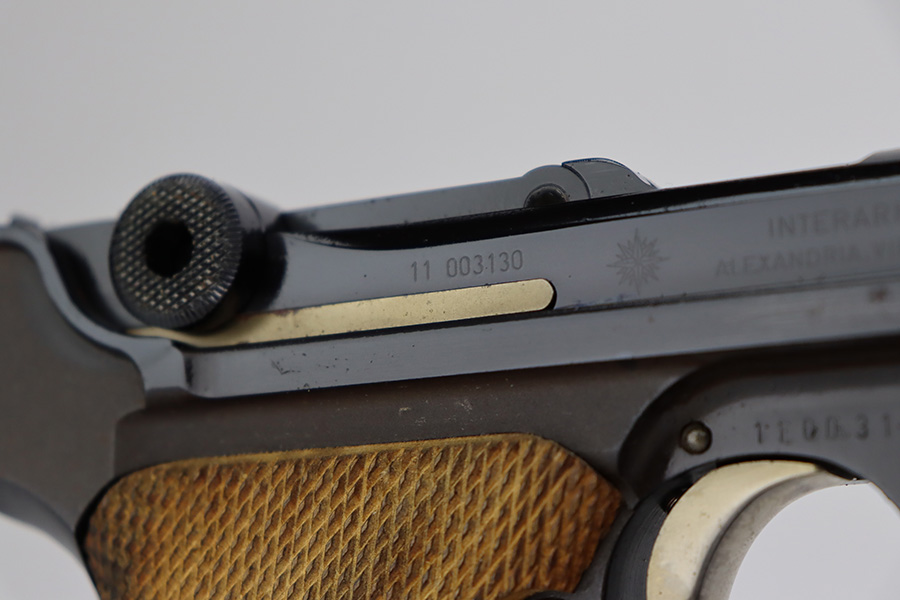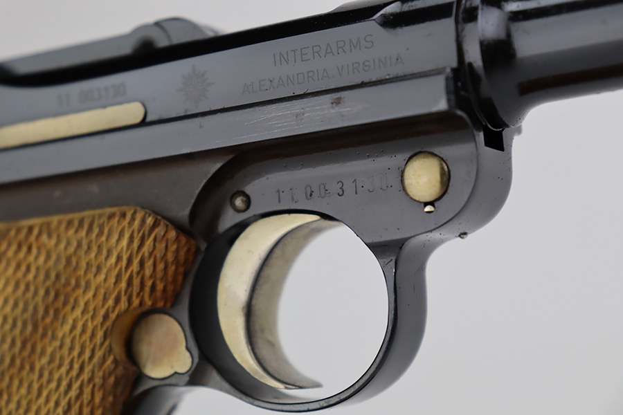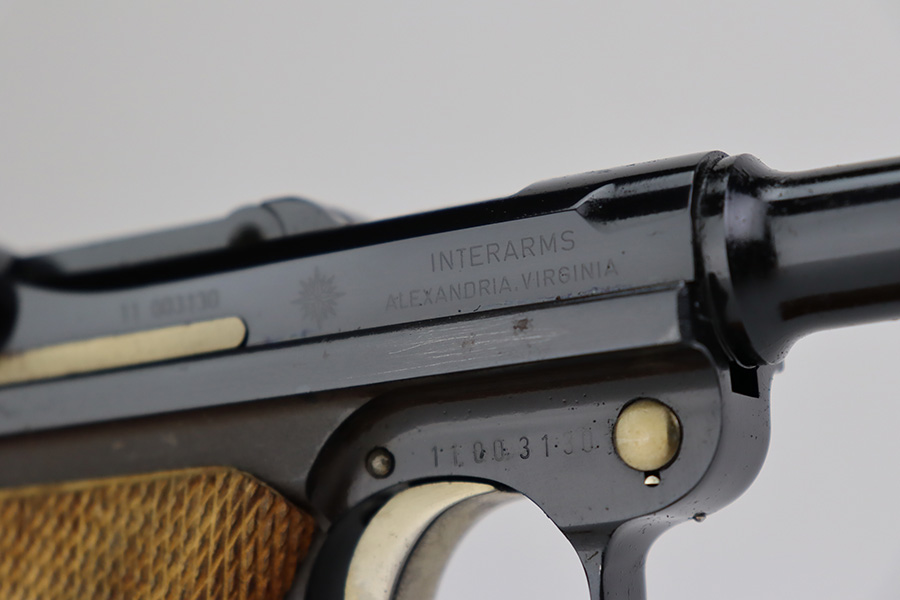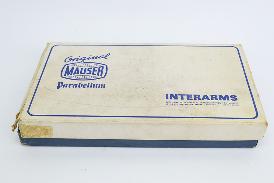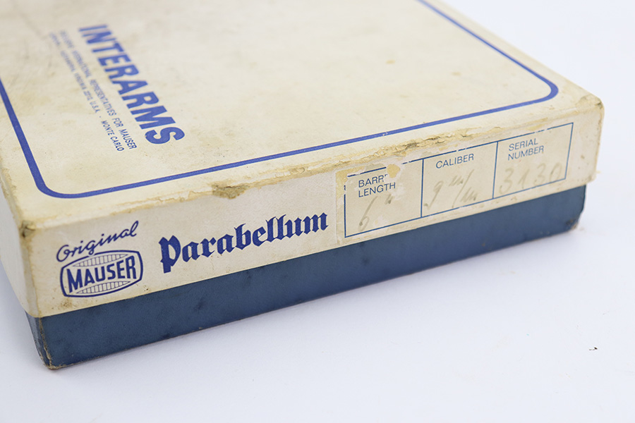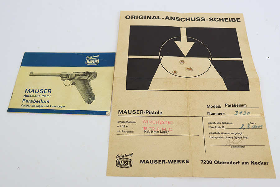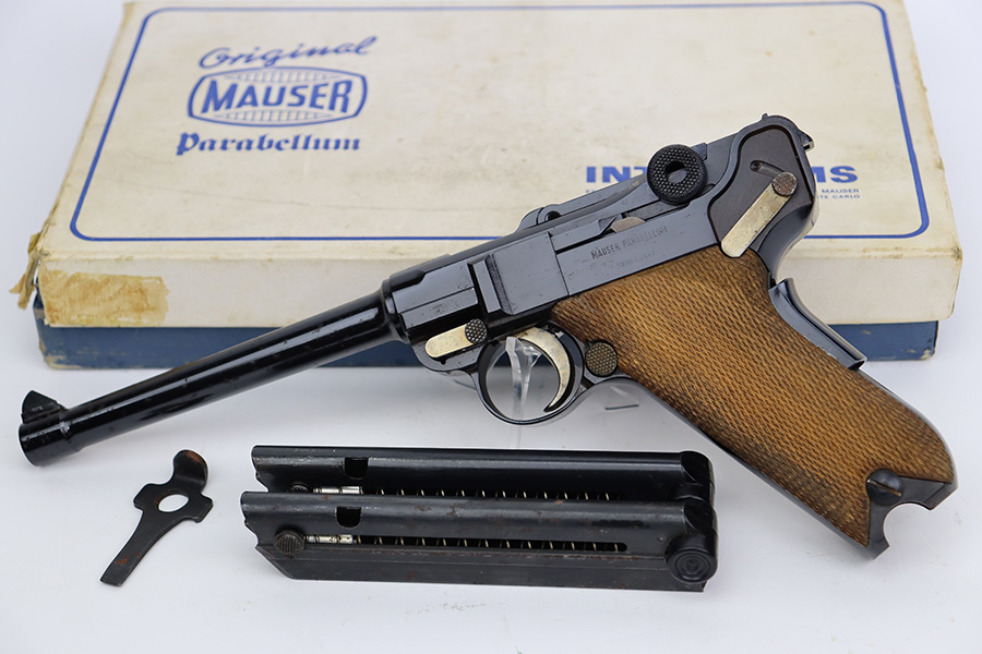 7/14/23 – This is an excellent example of a Mauser/Interarms Luger manufactured in the 1970’s and chambered in 9mm Luger. 5″ barrel. It is all matching, has the American Eagle seal on the chamber, and has an Interarms marking on the right side of the slide. It comes with its original matching box, original matching-numbered test target, owners manual, two magazines, a tool, and a cleaning brush. The gun has retained essentially all of its finish, but unfortunately there is minor spotty oxidation throughout. Fitted with minty wood grips. Mint bore.