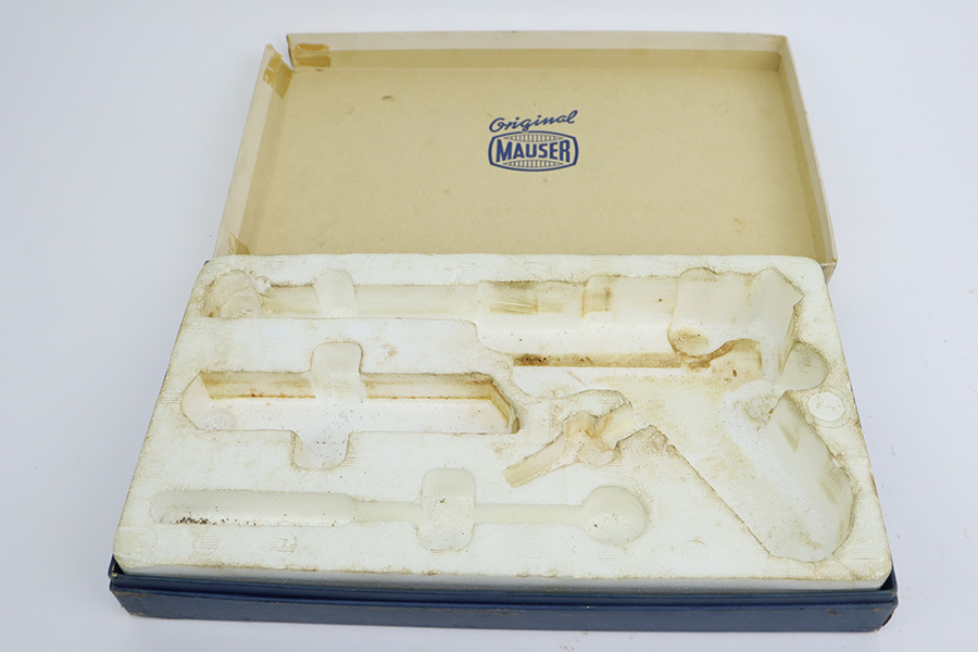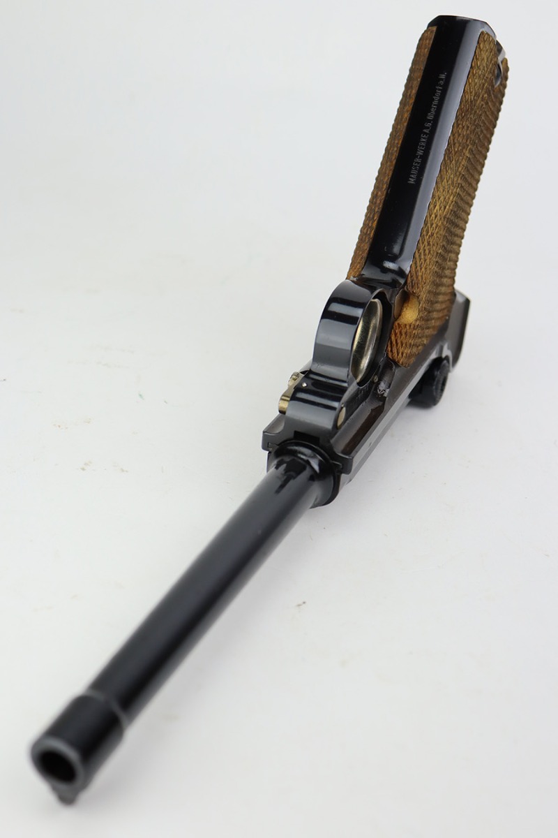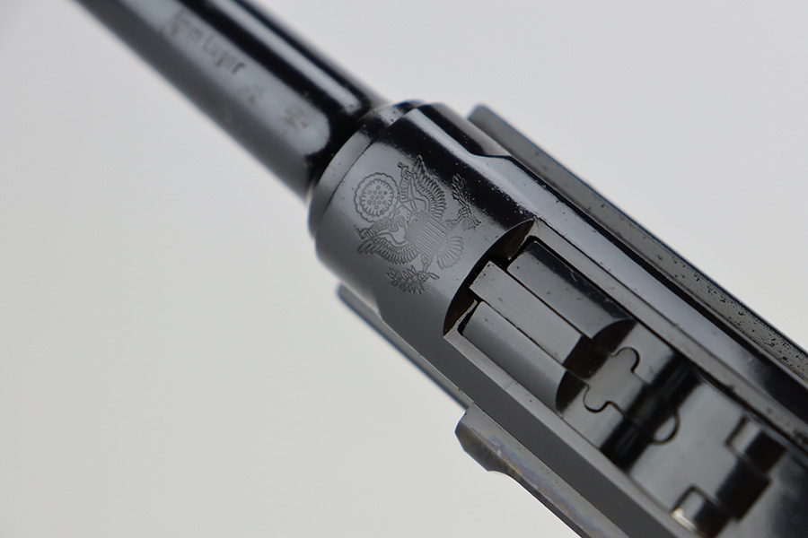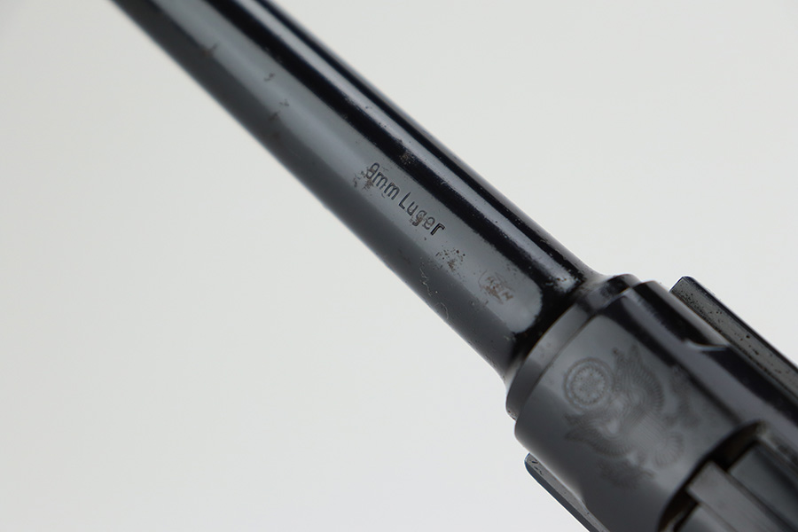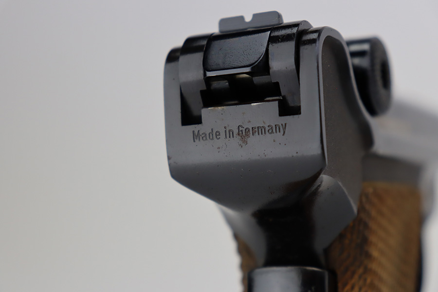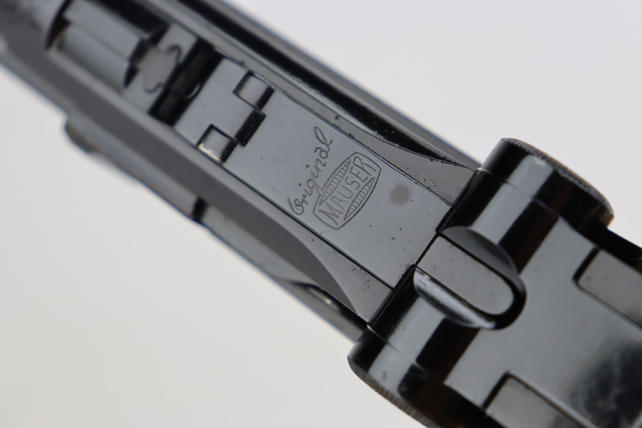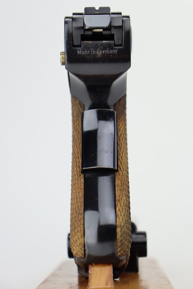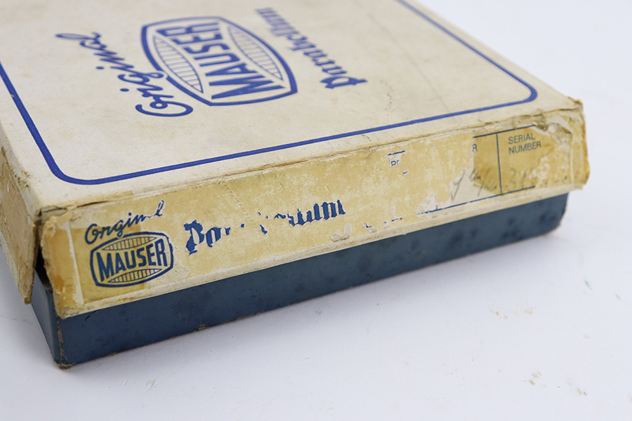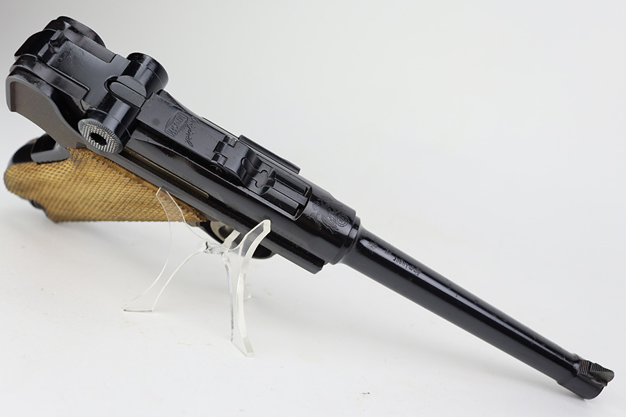 7/14/23 – This is an excellent example of a Mauser/Interarms Luger manufactured in the 1970’s and chambered in 9mm Luger. 5″ barrel. It is all matching, has the American Eagle seal on the chamber, and has an Interarms marking on the right side of the slide. It comes with its original matching box, original matching-numbered test target, owners manual, two magazines, a tool, and a cleaning brush. The gun has retained essentially all of its finish, but unfortunately there is minor spotty oxidation throughout. Fitted with minty wood grips. Mint bore.
