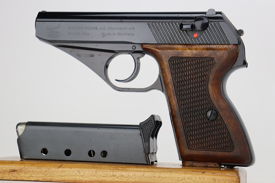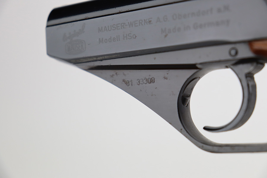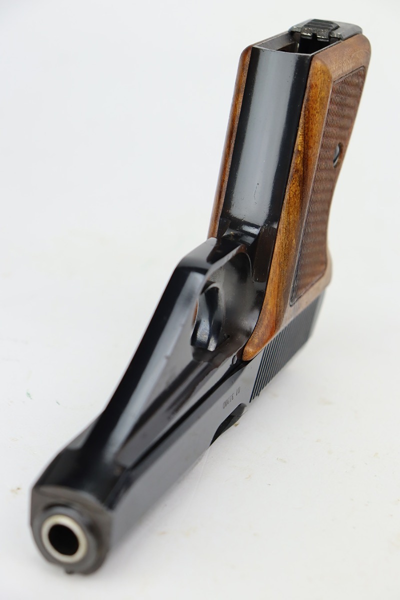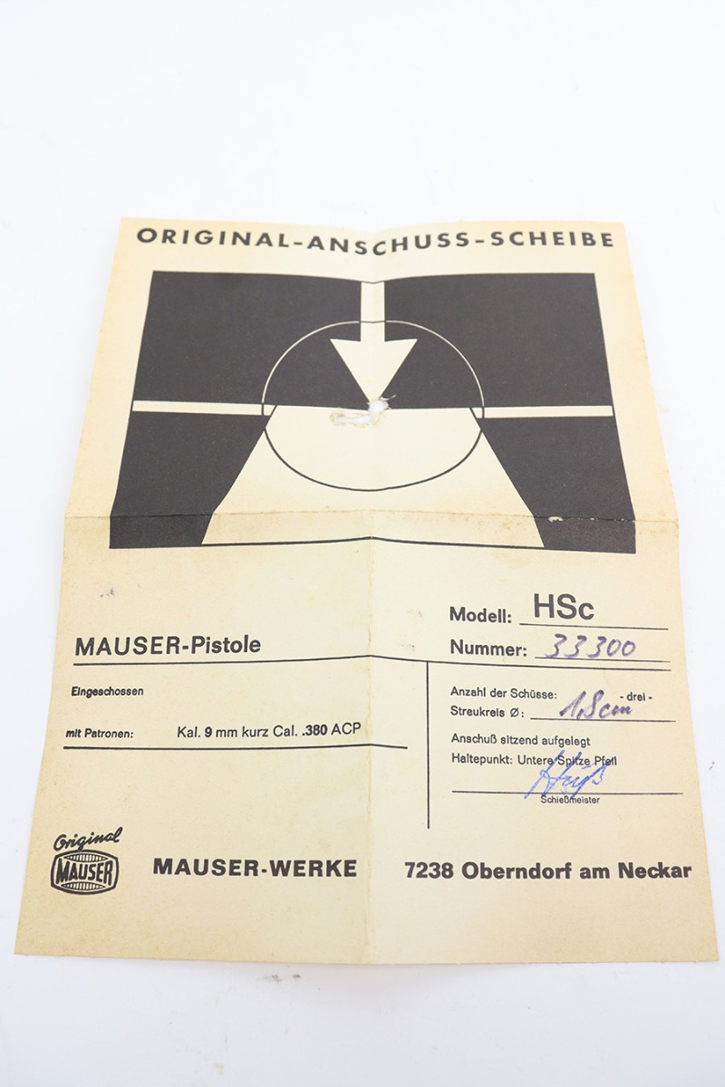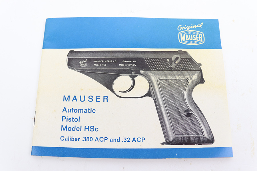 7/14/23 – This is an excellent example of a Mauser/Interarms HSC manufactured in the 1970’s and chambered in .380 ACP. It is all matching and has an Interarms marking on the right side of the slide. It comes with a period-correct box (not numbered), original matching-numbered test target, two finger extension magazines, a cleaning rod, and an owners manual. The gun has retained essentially all of its finish, but unfortunately there is minor spotty oxidation throughout. Fitted with minty wood grips. Mint bore.