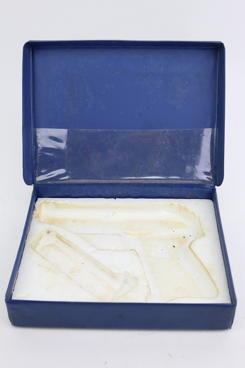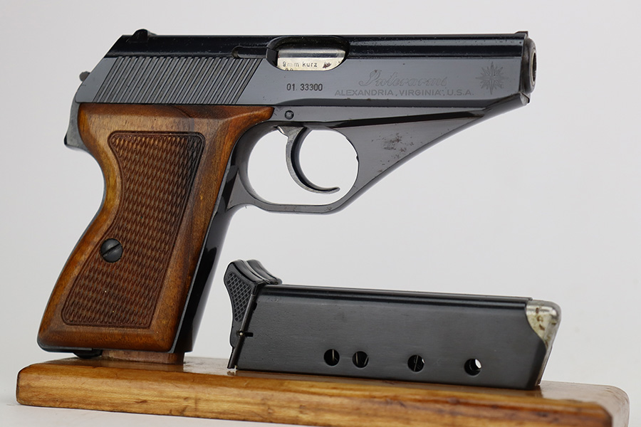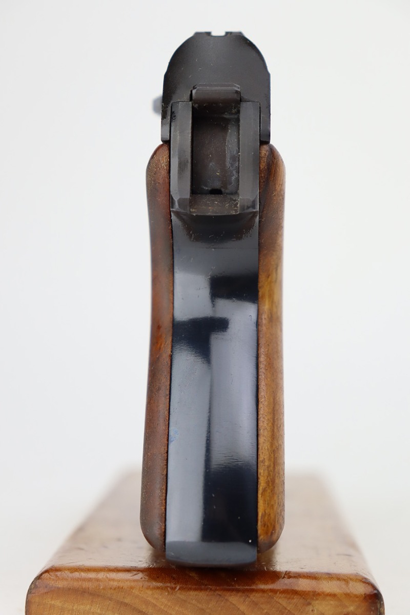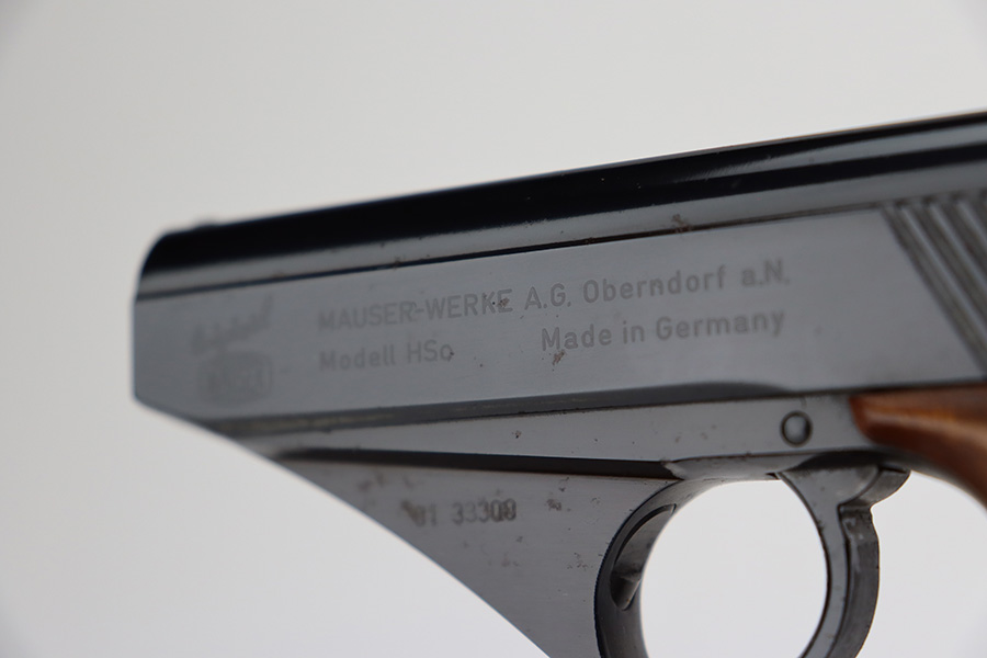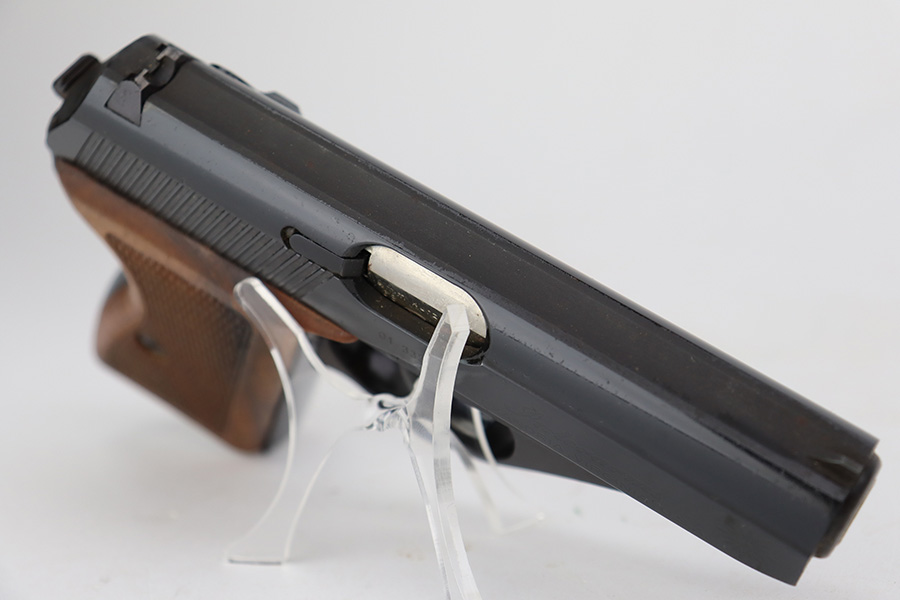7/14/23 – This is an excellent example of a Mauser/Interarms HSC manufactured in the 1970’s and chambered in .380 ACP. It is all matching and has an Interarms marking on the right side of the slide. It comes with a period-correct box (not numbered), original matching-numbered test target, two finger extension magazines, a cleaning rod, and an owners manual. The gun has retained essentially all of its finish, but unfortunately there is minor spotty oxidation throughout. Fitted with minty wood grips. Mint bore.