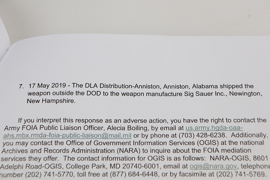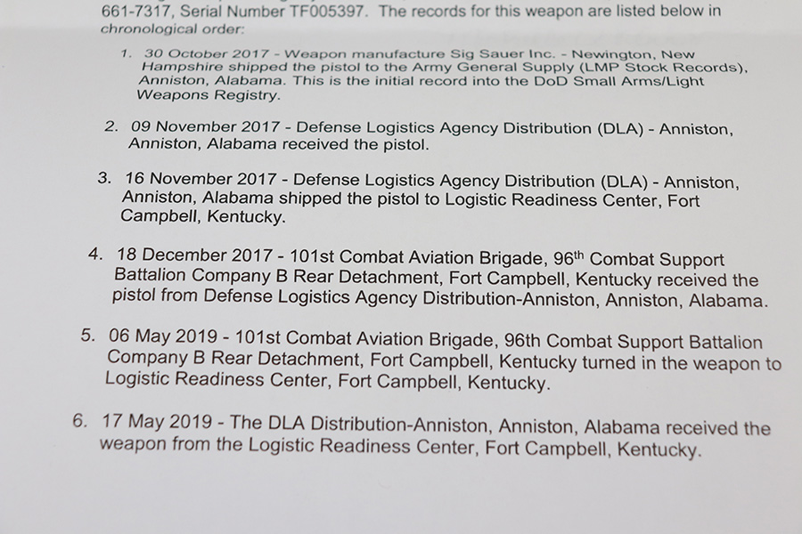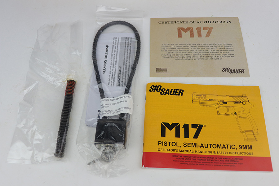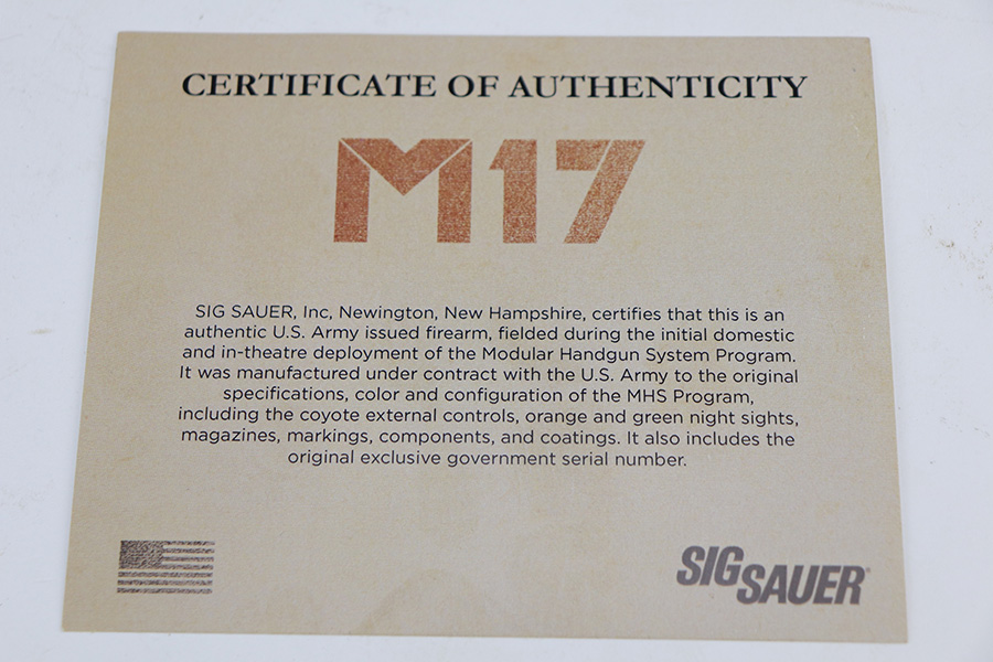 10/19/21 – This is an interesting and authentic U.S. Army issued Sig Sauer M17 pistol, with certificate of authenticity from Sig Sauer. This particular example is accompanied by a FOIA request by a previous owner, which indicates it was sent to the 101st Combat Aviation Brigade, 96th Combat Support Battalion Company B Rear Detachment. The FOIA document highlights every stop along the way for this pistol, from initial manufacture to its return to Sig Sauer years later. From the COA, “This pistol was fielded during the initial domestic and in-theatre deployment of the Modular Handgun System Program. It was manufactured under contract with the U.S. Army to the original specifications, color and configuration of the MHS Program, including the coyote external controls, orange and green night sights, magazines, markings, components and coatings. It also includes the original exclusive government serial number.” The gun itself shows minor signs of handling wear, and some wear along the top of slide and ejection port indicate it was fired some. Bore does not show it though, as it’s clean and has a mirror shine. It comes in the matching surplus box with two spare magazines, manual and gun lock. FFL required.