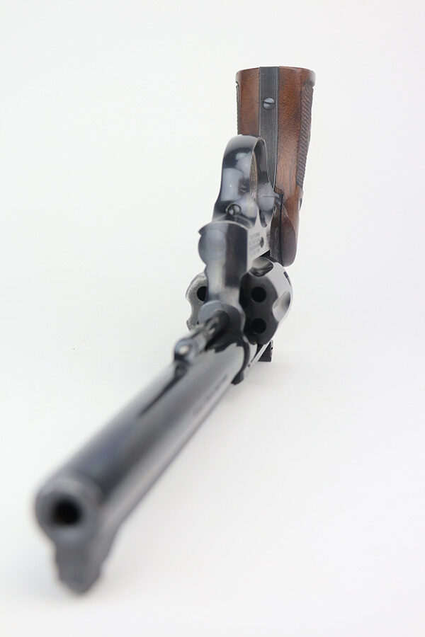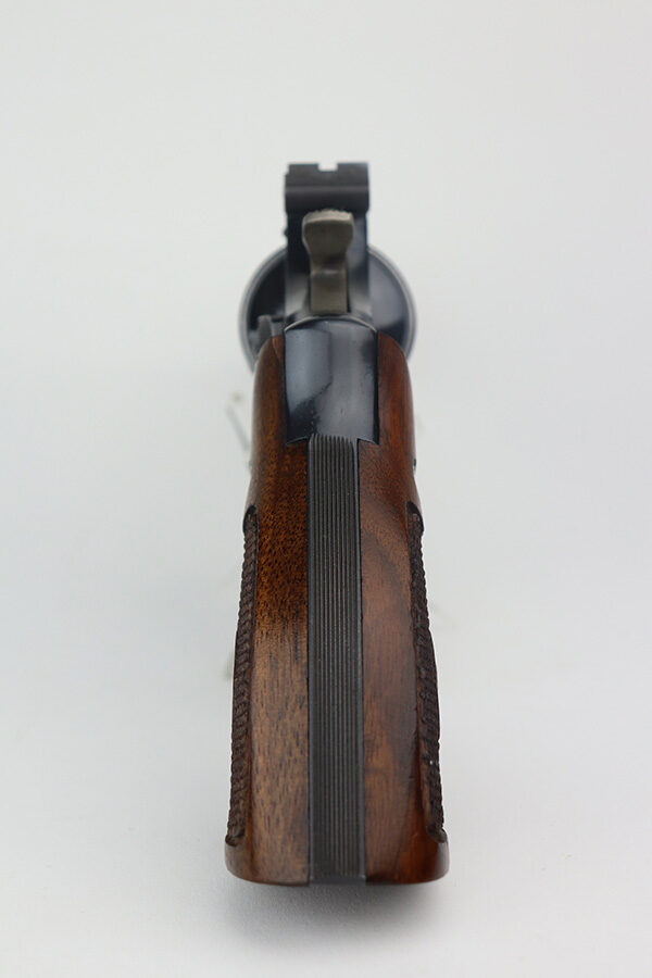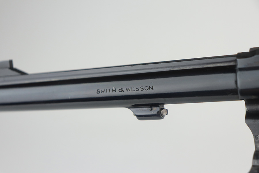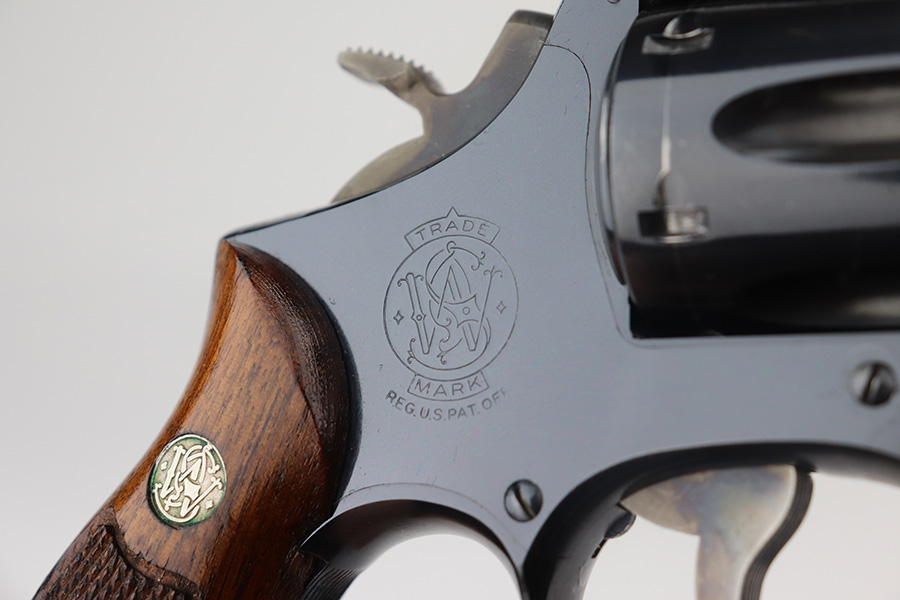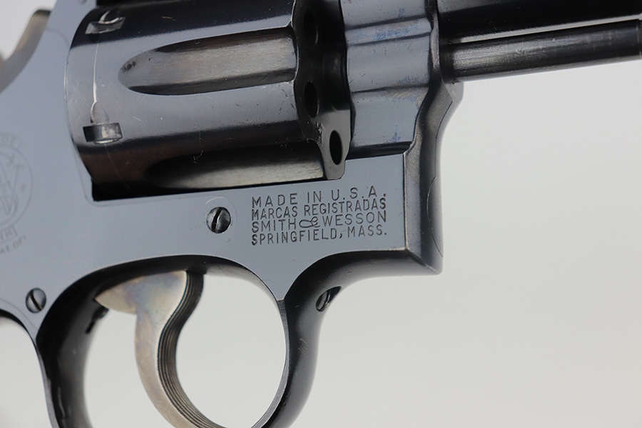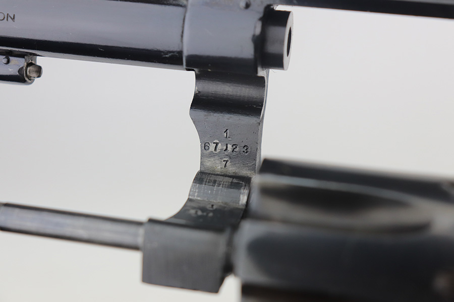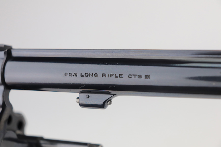 6/2/21 – This is a near-mint example of a Smith & Wesson Model K-22 manufactured in 1956. It comes with an original box that is numbered. The numbering is faint, and we can’t tell if it’s matching. The gun is all correct and has retained about 98% of its original bluing. There is just very minor wear around the muzzle, a few very light surface scratches on the underside of the trigger guard, and a light roll mark on the cylinder. The cylinder is tight and the action is smooth. Mint grips. Mint bore.
