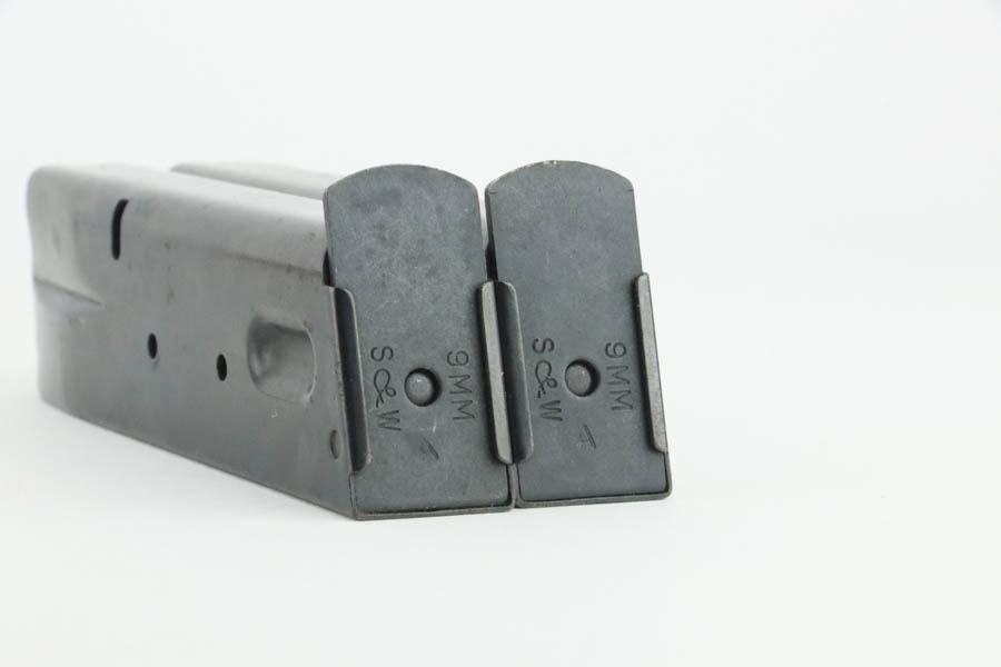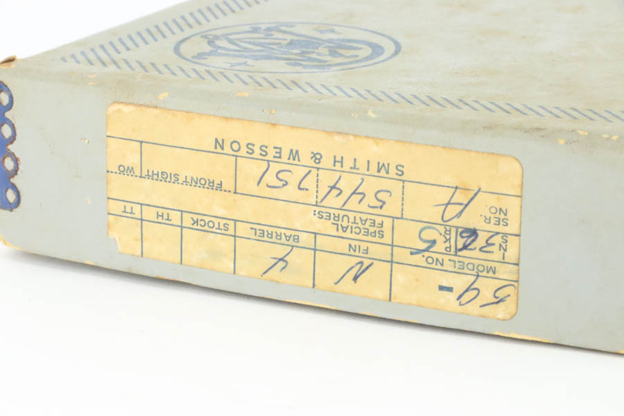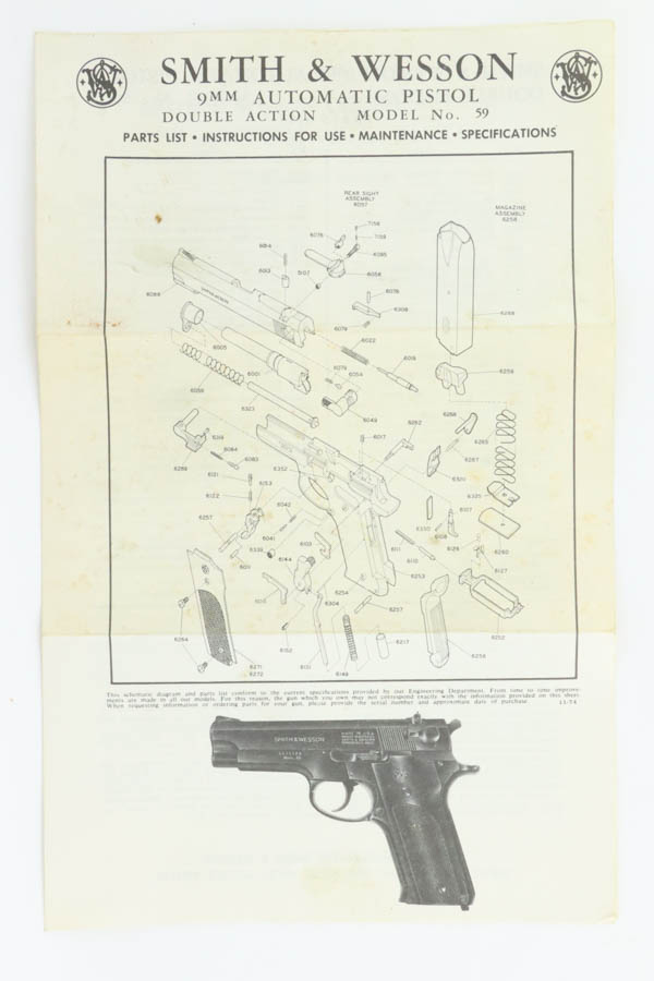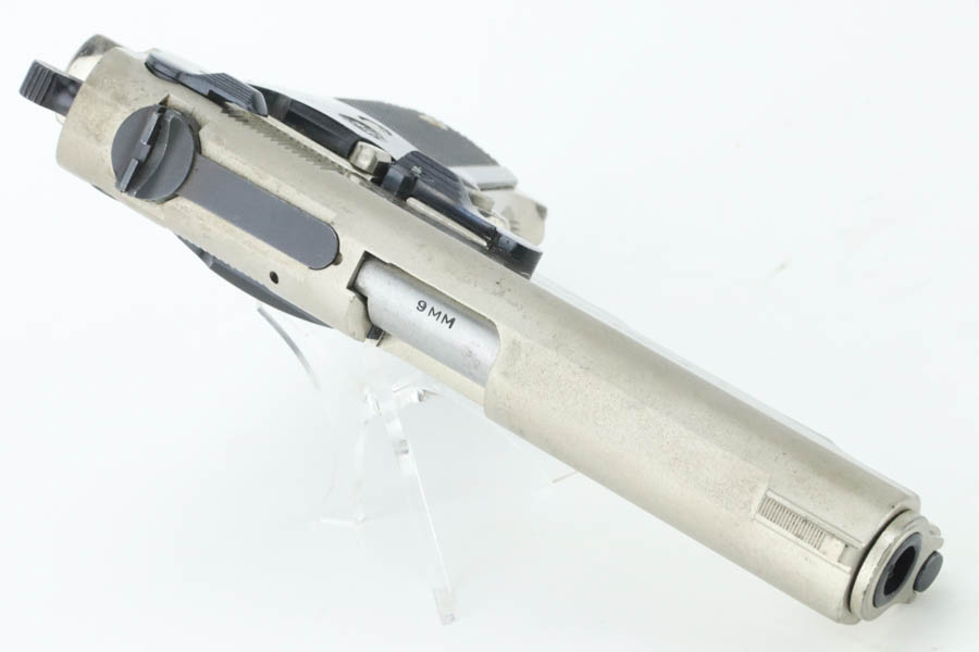 8/1/24 – This is a very nice example of a nickel Smith & Wesson Model 59, manufactured in the late 1970’s and chambered in 9mm. It comes with its original matching-numbered box, owners manual, two magazines, and cleaning rod. The gun shows essentially no finish loss, but there is light freckling throughout. Fitted with black plastic grips. Excellent bore with great rifling.