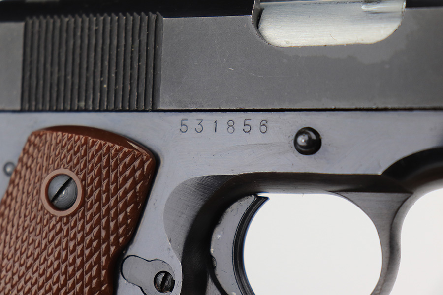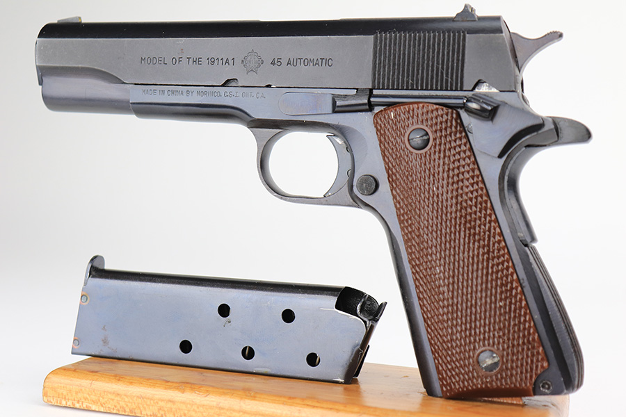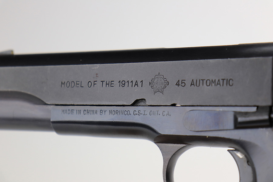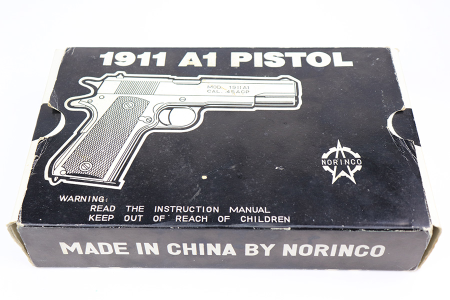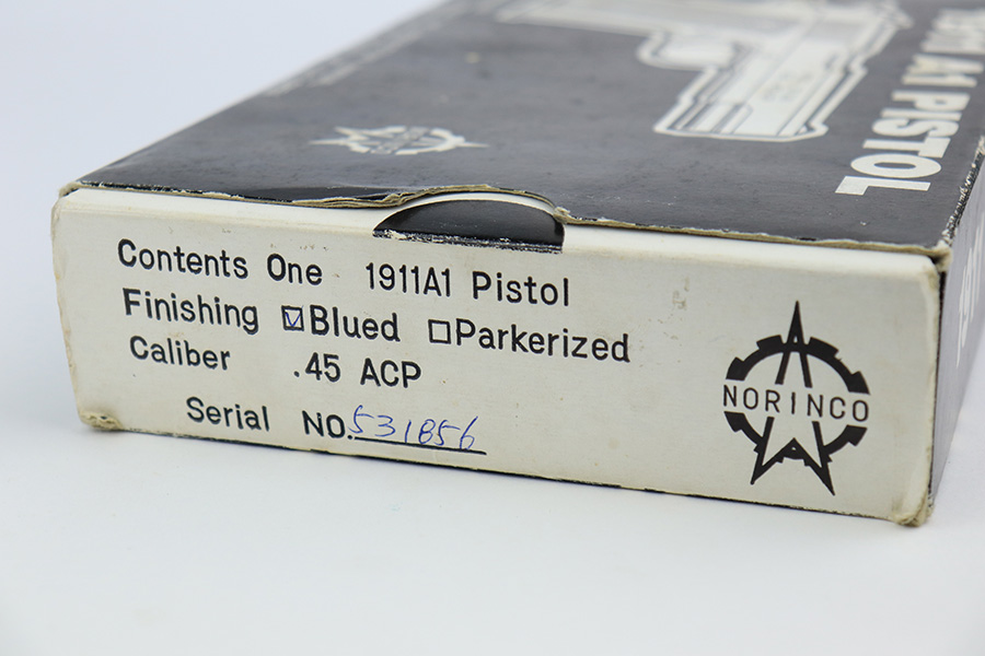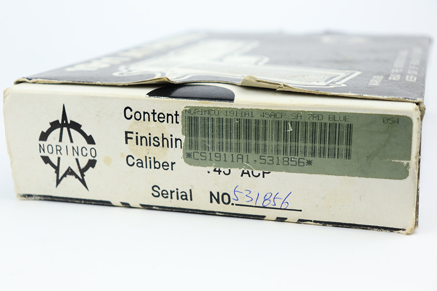 3/30/22 – This is an excellent Norinco 1911A1 in its original, matching box. It’s in minty condition aside from the front strap, where nearly all the wear is. It’s a Chinese copy of the Colt 1911A1, with import mark on frame. Excellent grips and mint bore. Magazine base is marked ‘COLT .45 AUTO’. Comes with the original box, Styrofoam insert and safety manual. FFL required.