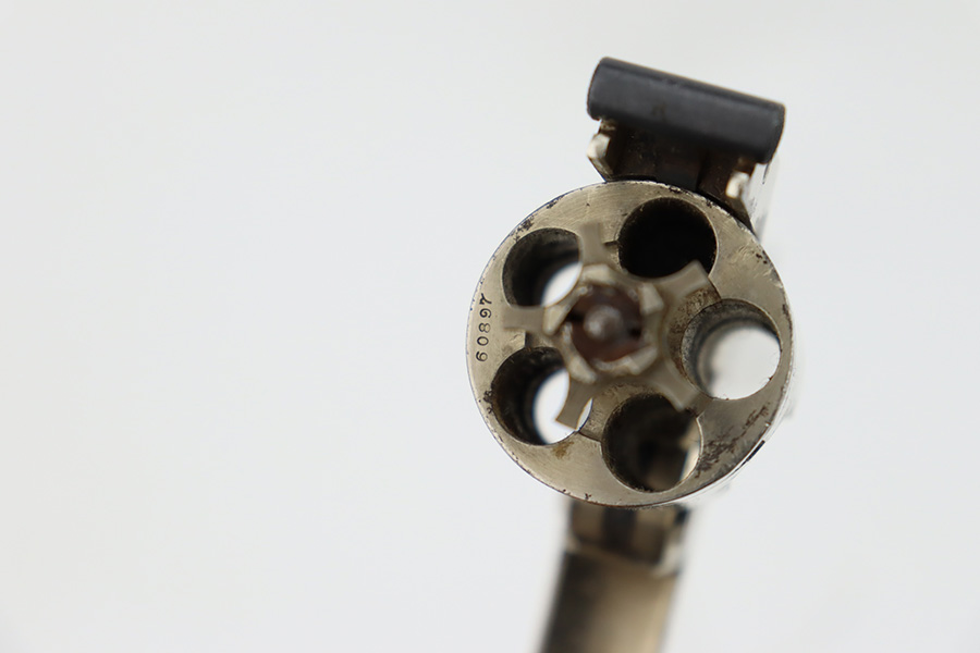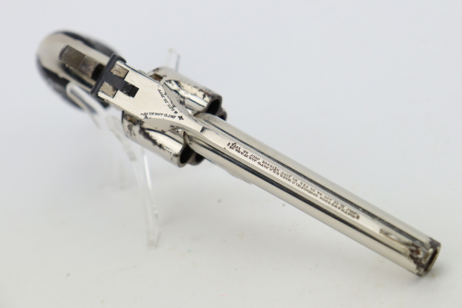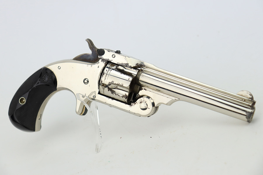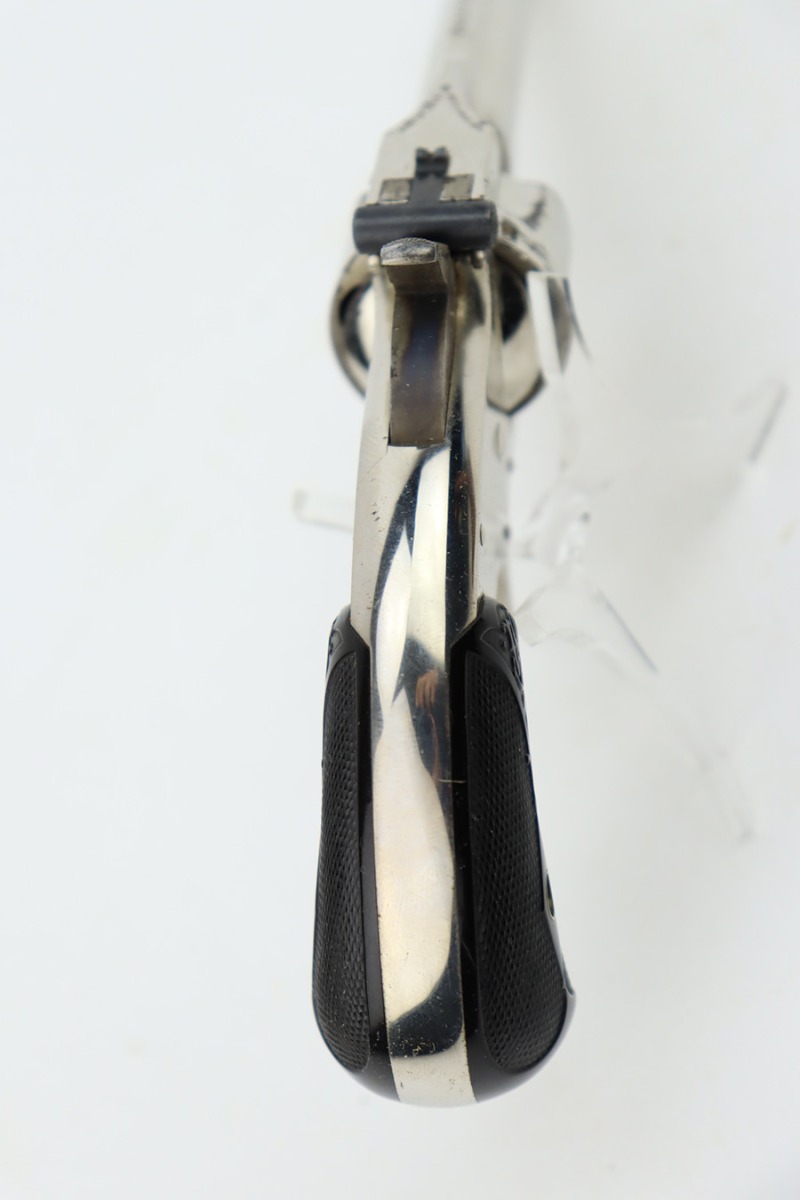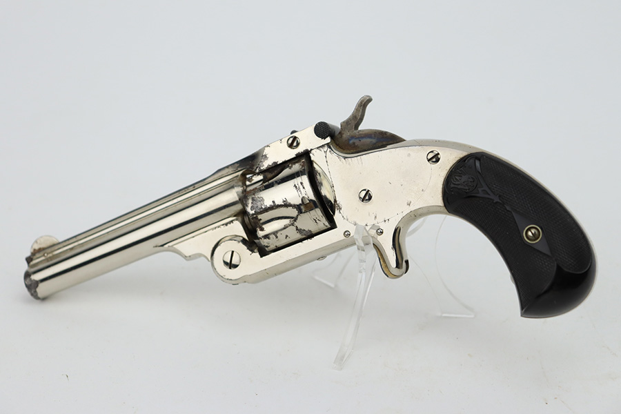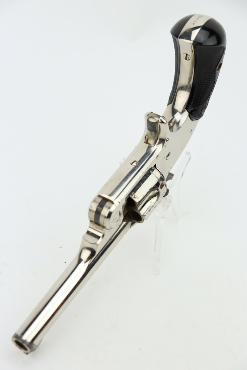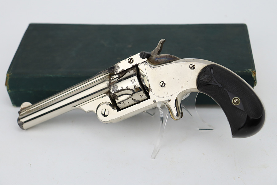 1/3/24 – This is a Smith & Wesson 2nd Model Top-Break Revolver from the late 1800’s, chambered in .32 Caliber. All matching. It has a factory-nickeled finish and comes with its original matching-numbered box. The finish rates somewhere between 85-90% with flaking and some oxidation on the cylinder and around the muzzle. Visible case-hardening on the hammer. Fitted with excellent black hard rubber grips. The bore has great rifling, but there is spotty surface oxidation throughout. Fully functional.