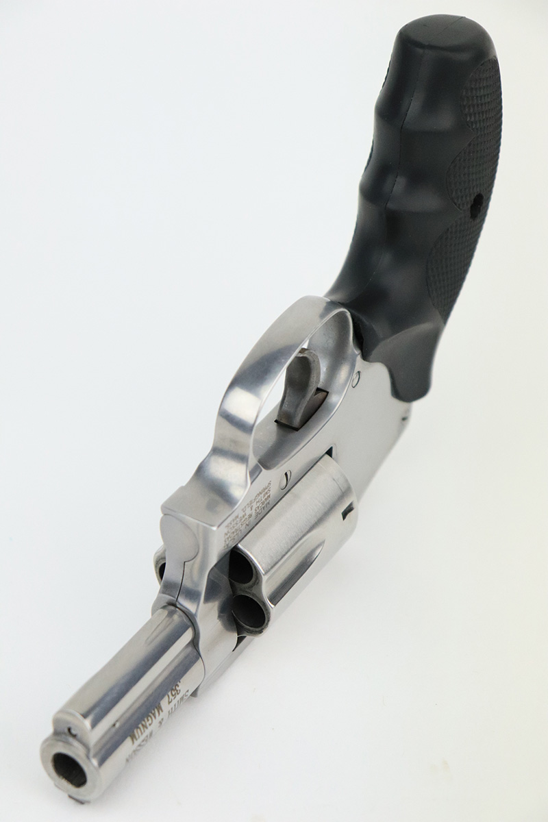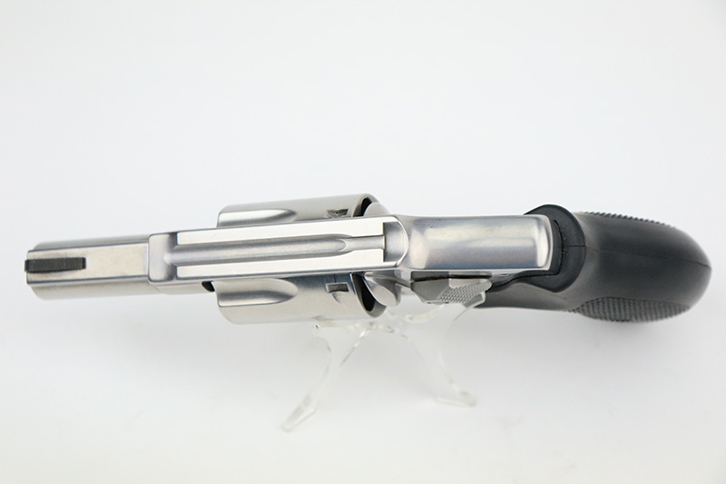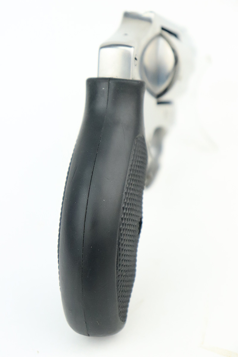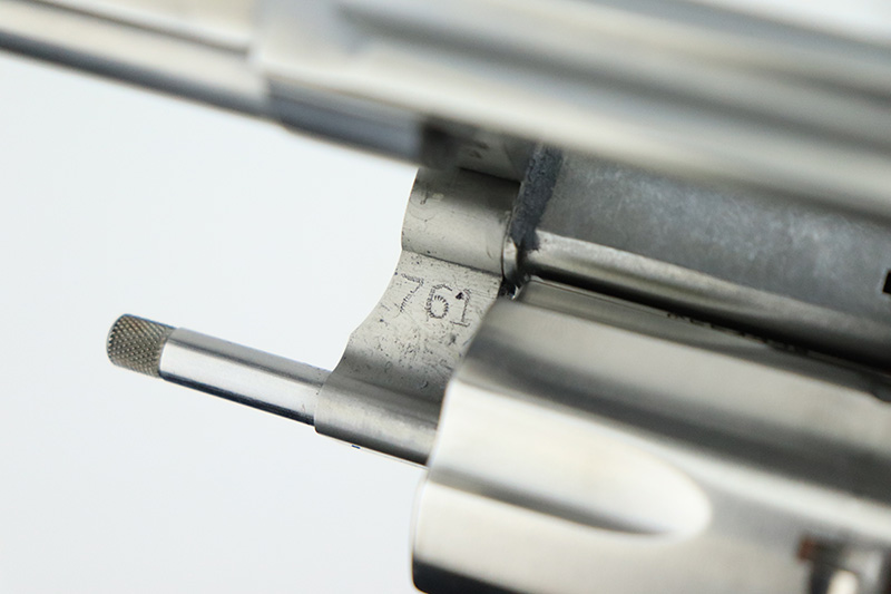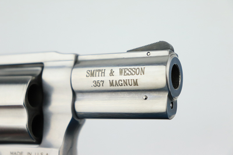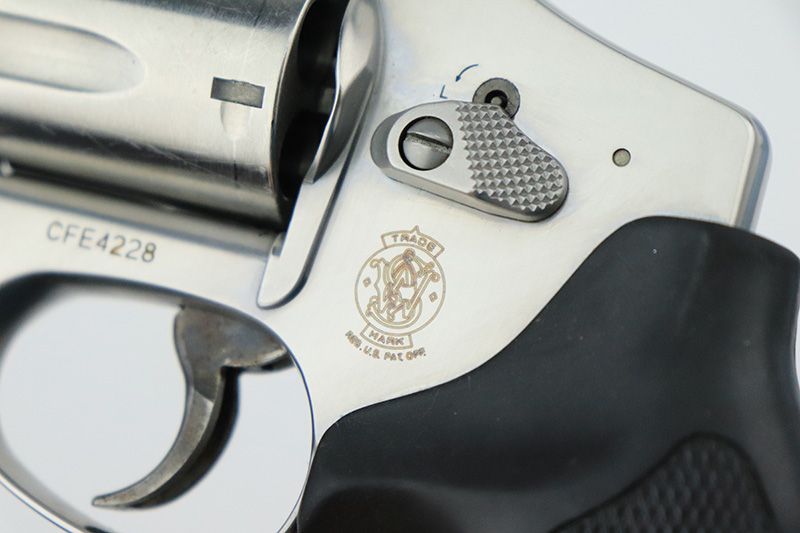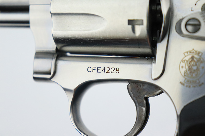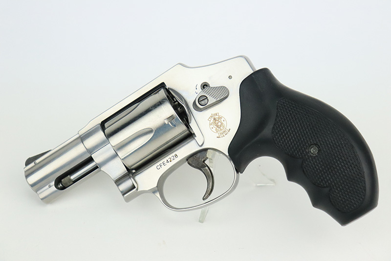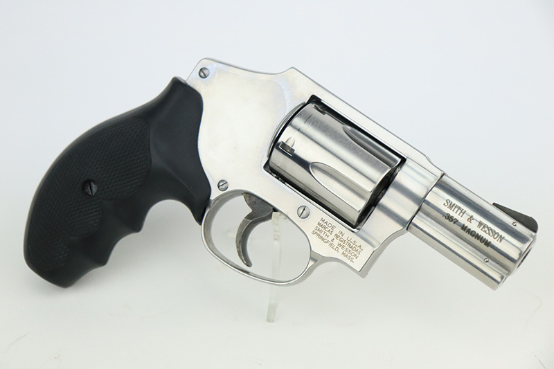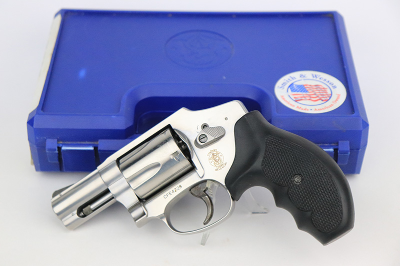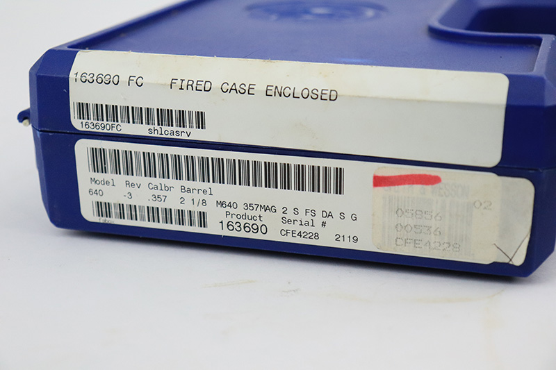 9/1/22 – This is a Smith & Wesson Model 640-3 revolver in the original, matching box. It’s chambered for .357 Magnum with a two inch barrel. The model 640 is a small-frame, concealed-hammer revolver that “packs a full-sized punch”. Stainless streel frame, barrel and cylinder. Black blade front sight. Rated for continuous +P use. Black rubber grips. Original box is matching numbered to the gun. Minor surface scuffs on cylinder. Excellent bore.
