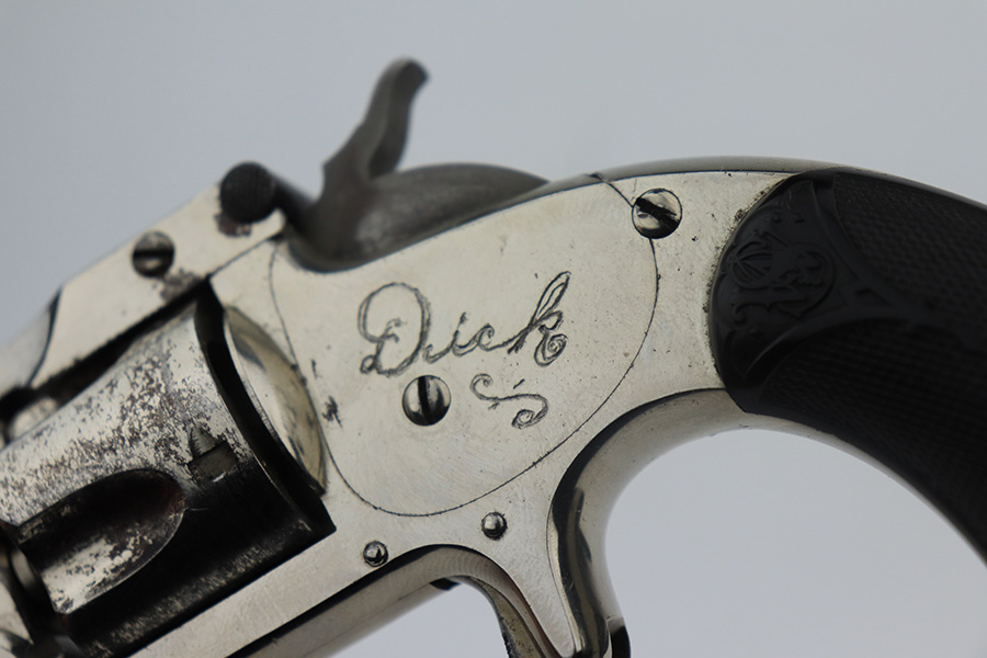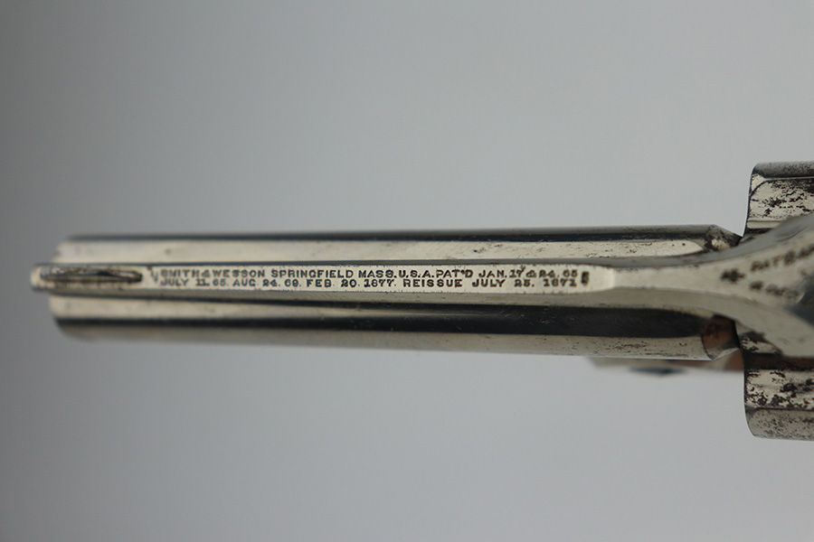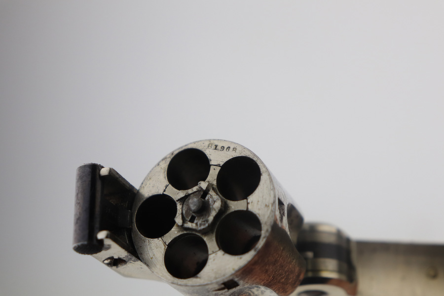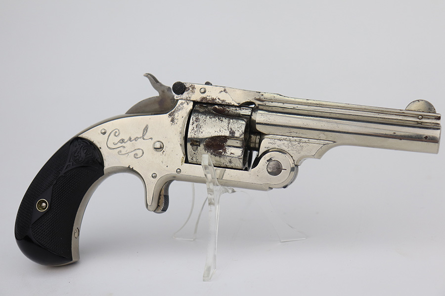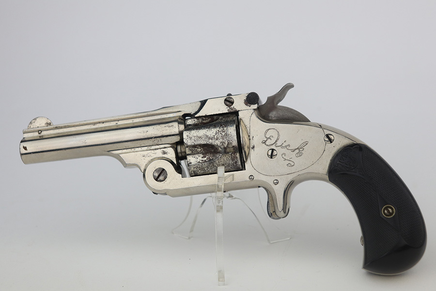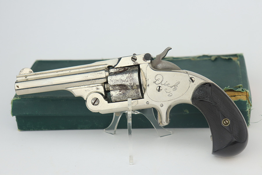 6/2/21 – This is a nice example of a Smith and Wesson Model 1 1/2 revolver, made in the late 1800’s. This one comes with an original box that is un-numbered (slight tearing along the edges). The gun is nickel-plated, and someone had their name engraved on the sides of the cylinder. It has retained roughly 85% of its original nickel-plating. There is chipping in the plating and spotty oxidation on the cylinder and the surrounding area. Comes with excellent hard rubber grips. The bore is shiny with good rifling and some areas of minor freckling.