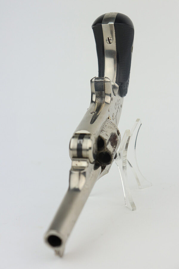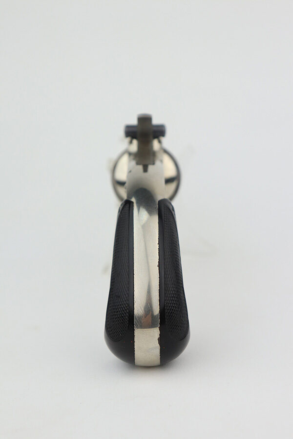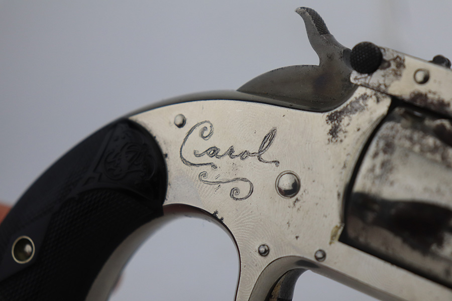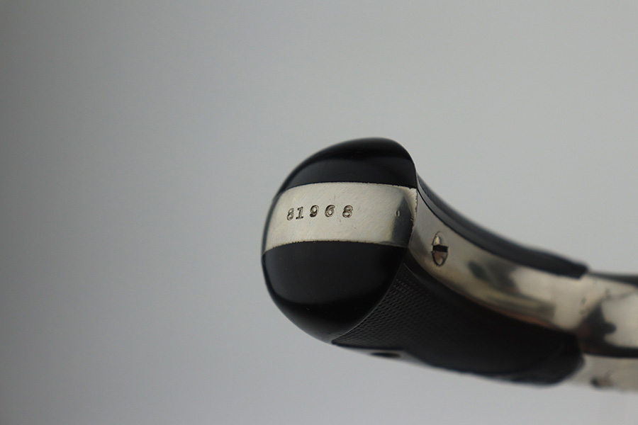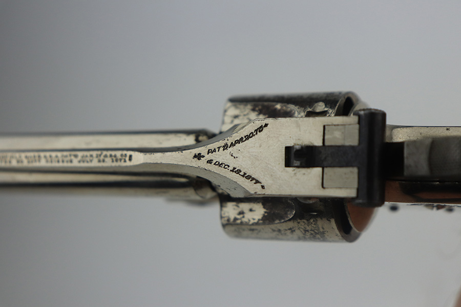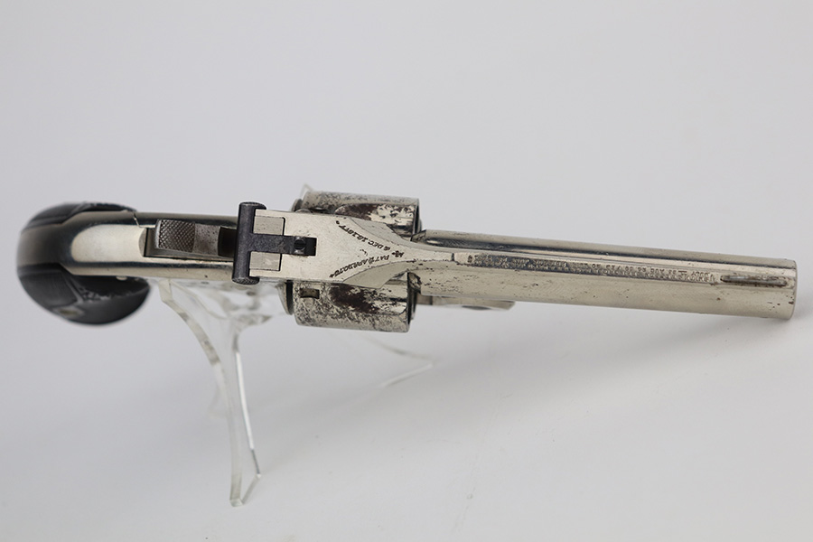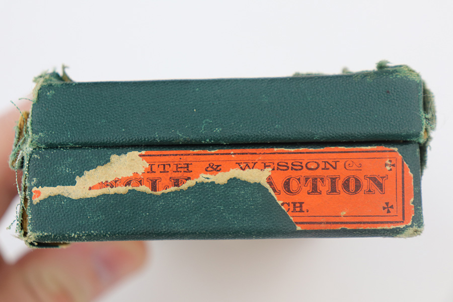 6/2/21 – This is a nice example of a Smith and Wesson Model 1 1/2 revolver, made in the late 1800’s. This one comes with an original box that is un-numbered (slight tearing along the edges). The gun is nickel-plated, and someone had their name engraved on the sides of the cylinder. It has retained roughly 85% of its original nickel-plating. There is chipping in the plating and spotty oxidation on the cylinder and the surrounding area. Comes with excellent hard rubber grips. The bore is shiny with good rifling and some areas of minor freckling.