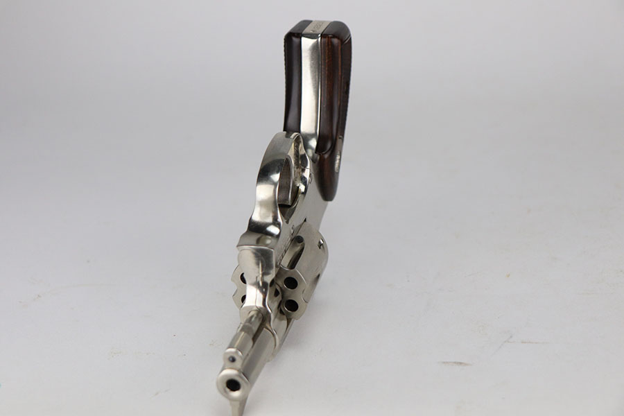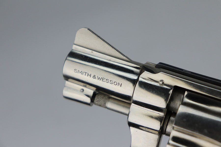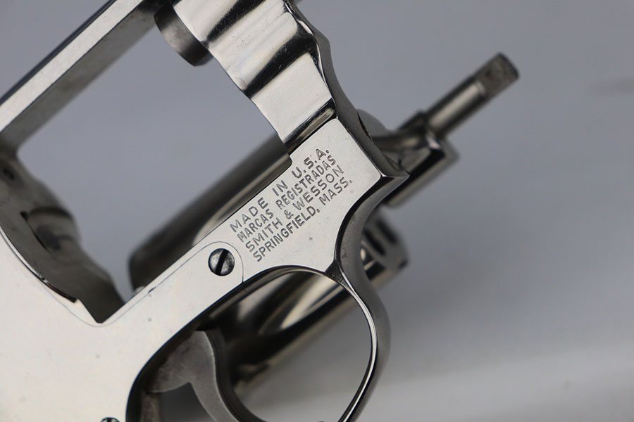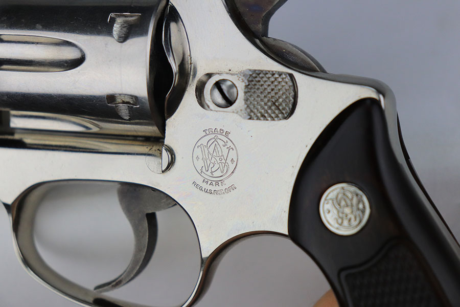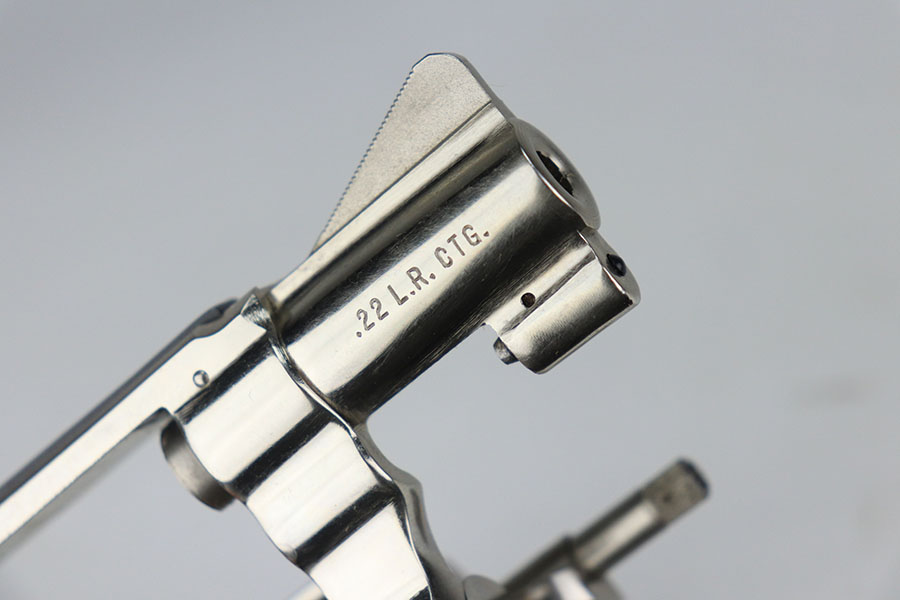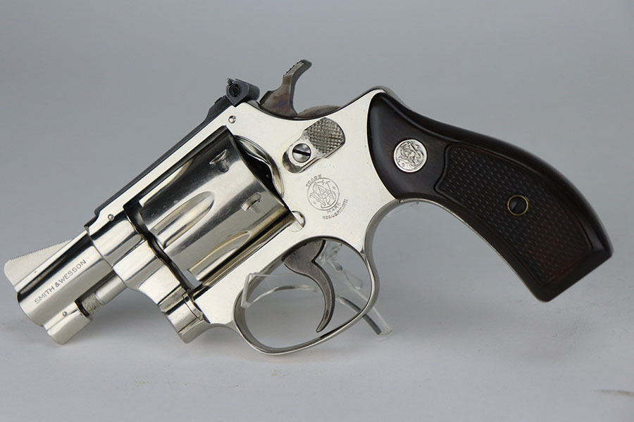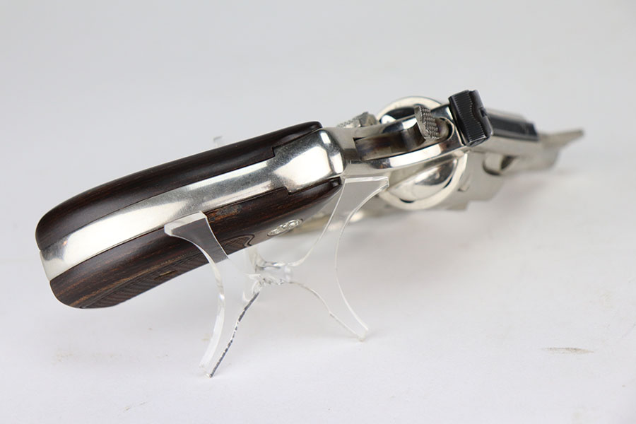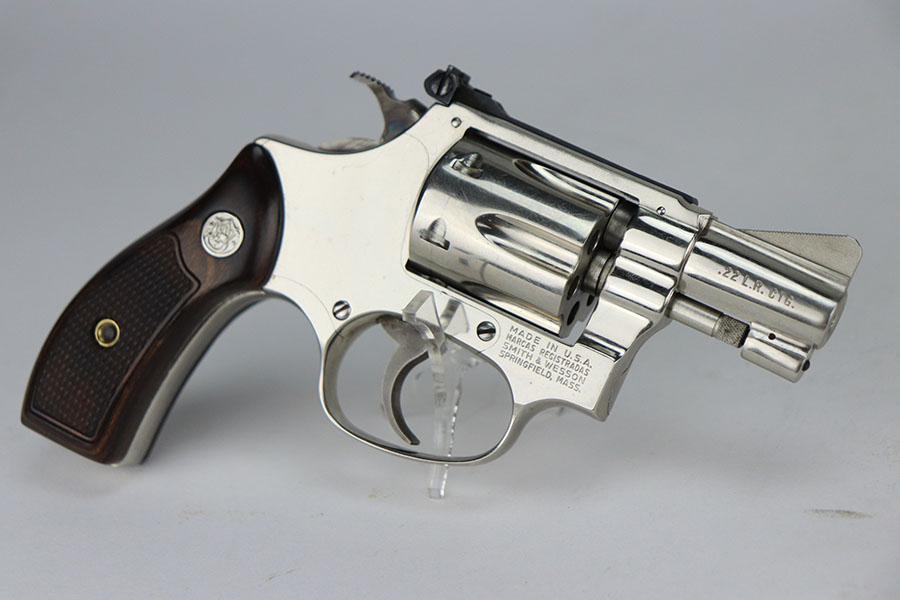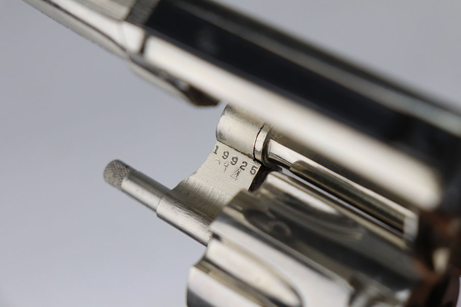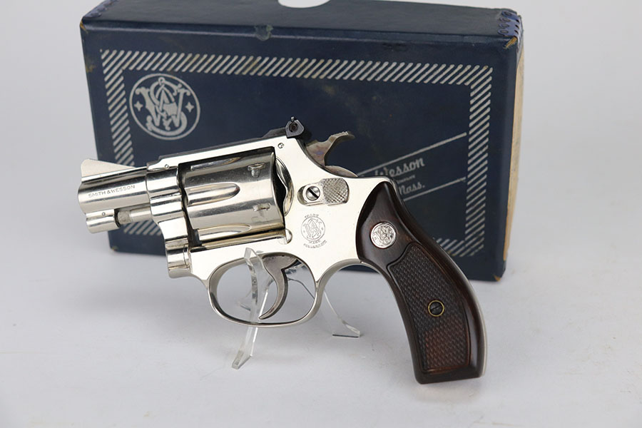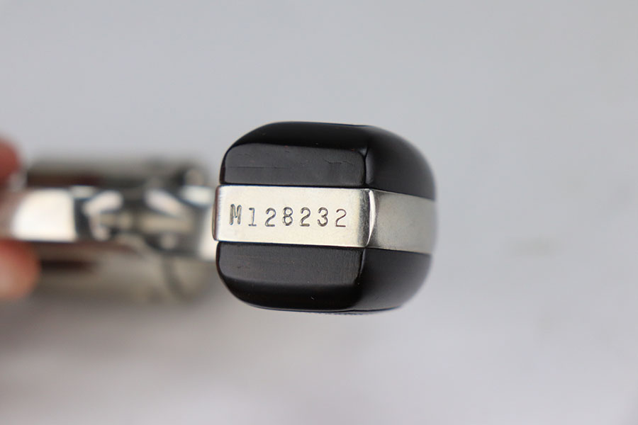 4/22/21 – This is an excellent Smith & Wesson Model 34-1 “Kit Gun” in its original, matching box. It’s got factory nickel finish, which is considerably less common than the blued variation. Two inch barrel with a mint bore. Tiny scuffs here or there but no flaking. This model was designed originally be easily packed in a hunting or fishing “kit” for small game hunting, plinking, pest control and self defense. Serial dates this one to the 80s. The gun comes in the matching numbered box. Grips are in excellent shape.