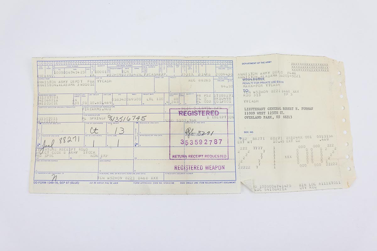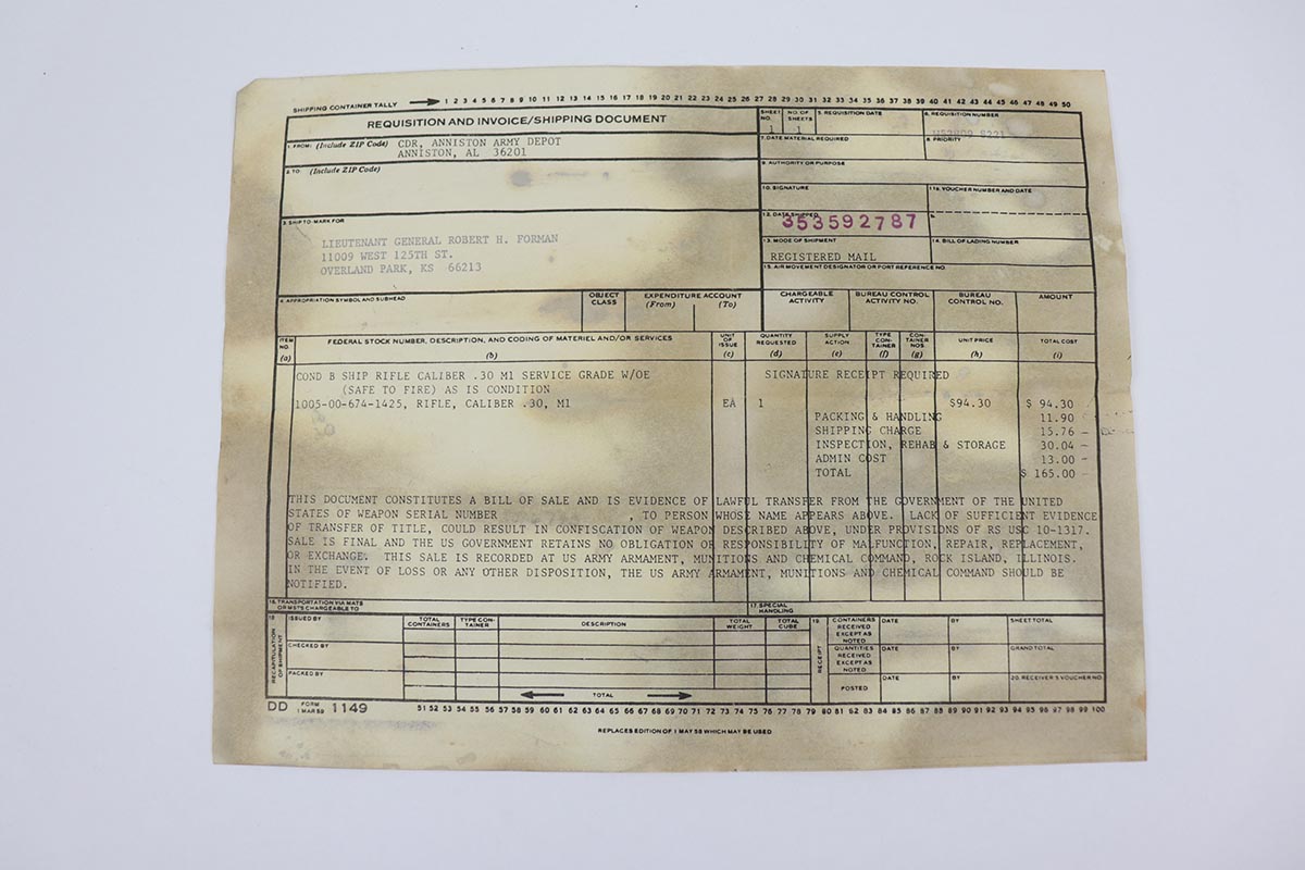 1/15/20 – This is a beautiful Springfield M1 Garand with a rich and interesting history. This rifle comes with the original box, shipping document/invoice, and registration, all of which denote that the gun was shipped from the Anniston Army Depot to Lieutenant General Robert H. Forman. The serial dates the gun to 1945, so it was likely made for use during World War II and later sent back to the army depot and re-worked. The rifle itself shows minimal wear to the parkerized finish on the metal, and the stock is in fantastic shape with just just speckling of oil or some other liquid on the right side. Minty bore with a muzzle reading of about 1.5, and throat reading of less than 1. The box includes the original army field manual and the original sling, still in its wrapping. Over the course of his long career, General Forman served as a commander, military instructor, staff officer and trainer who fought in the Korean War and served two tours in Vietnam.