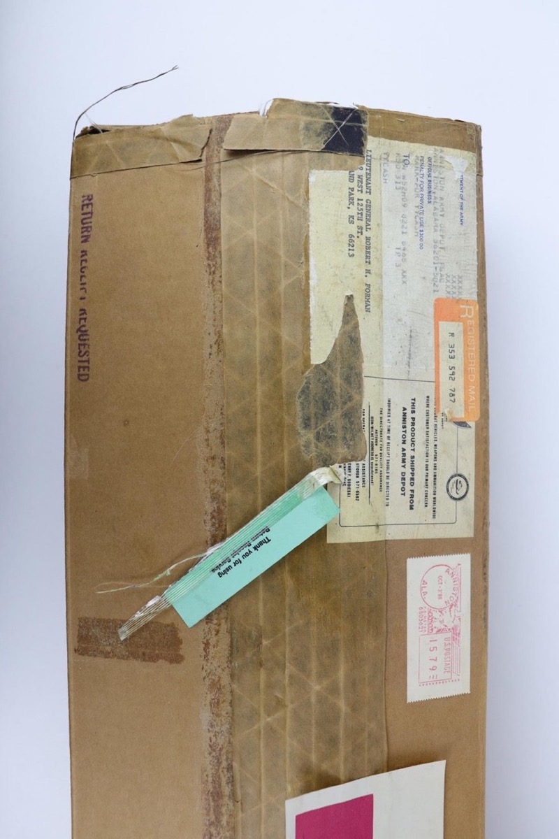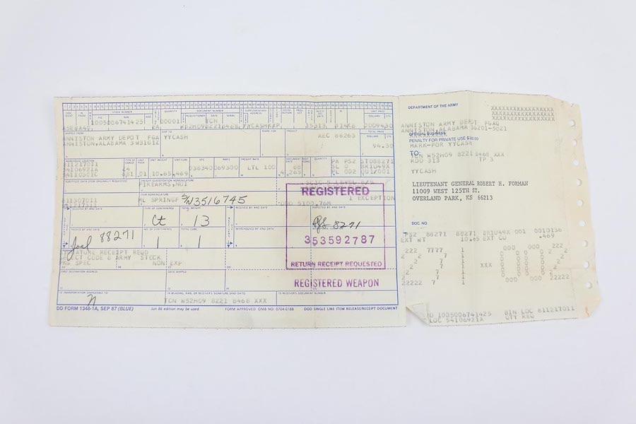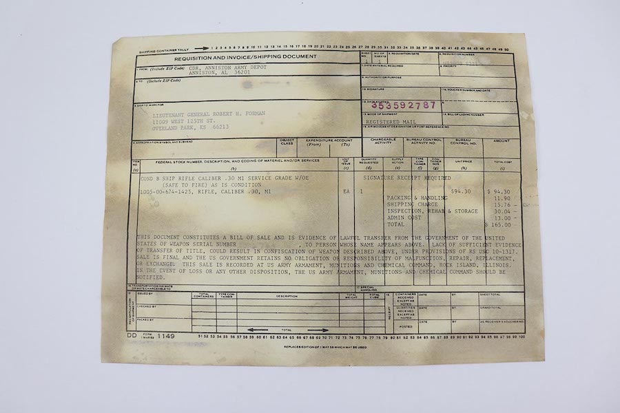 4/1/22 – This is a beautiful Springfield M1 Garand with a rich and interesting history. This rifle comes with the original box, shipping document/invoice, and registration, all of which denote that the gun was shipped from the Anniston Army Depot to Lieutenant General Robert H. Forman. The serial dates the gun to 1945, so it was likely made for use during World War II and later sent back to the army depot and re-worked. The rifle itself shows minimal wear to the parkerized finish on the metal, and the stock is in fantastic shape with just just speckling of oil or some other liquid on the right side. Minty bore with a muzzle reading of about 1.5, and throat reading of less than 1. The box includes the original army field manual and the original sling, still in its wrapping. Also includes reproduction canvas carry case.Over the course of his long career, General Forman served as a commander, military instructor, staff officer and trainer who fought in the Korean War and served two tours in Vietnam.
