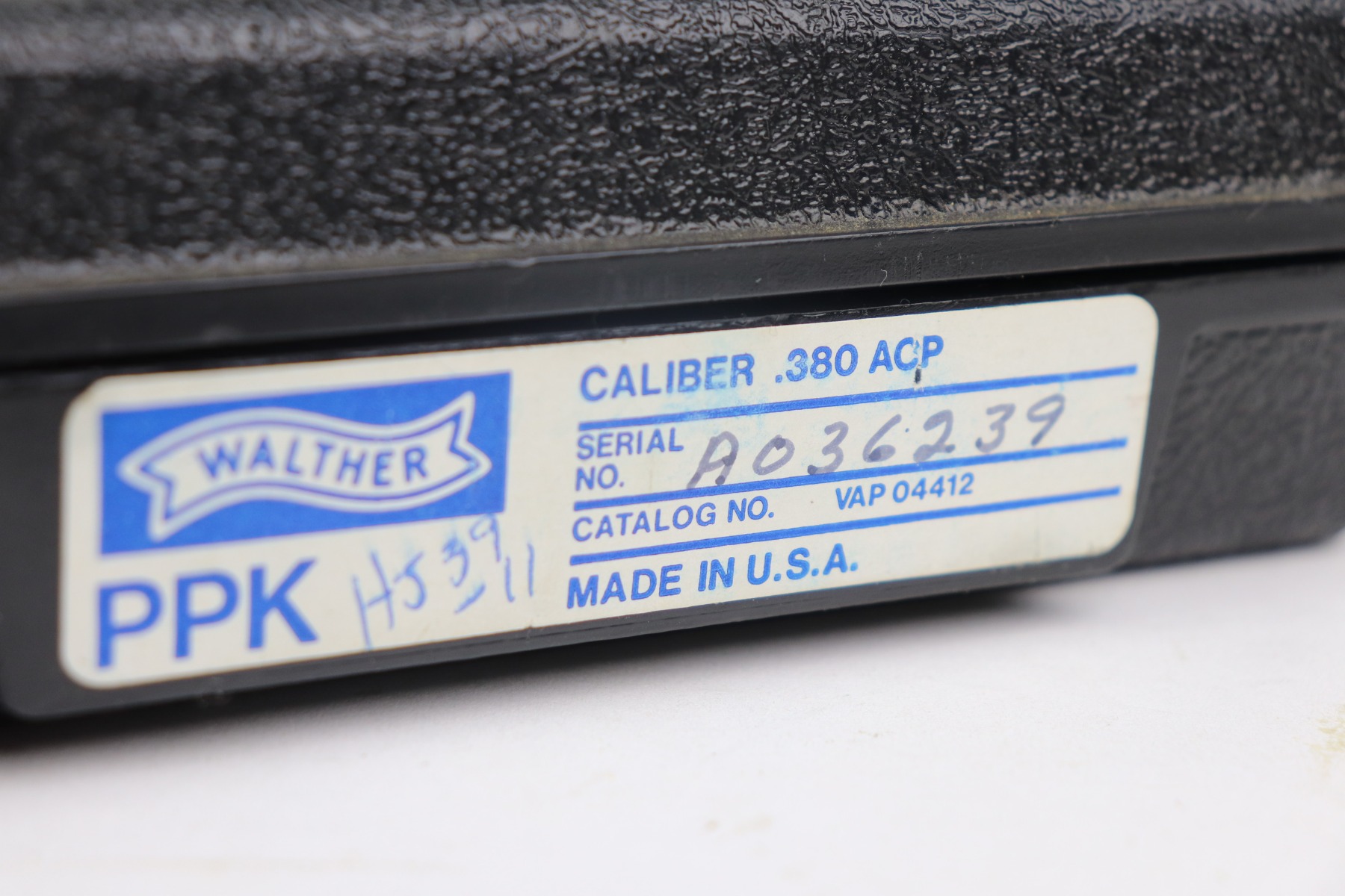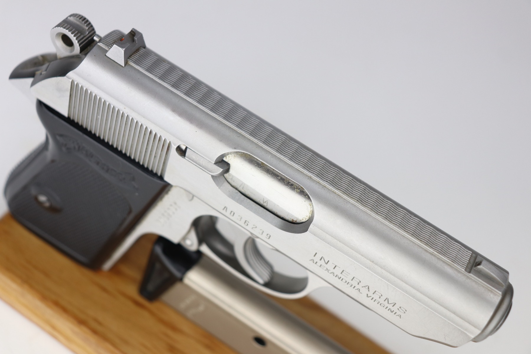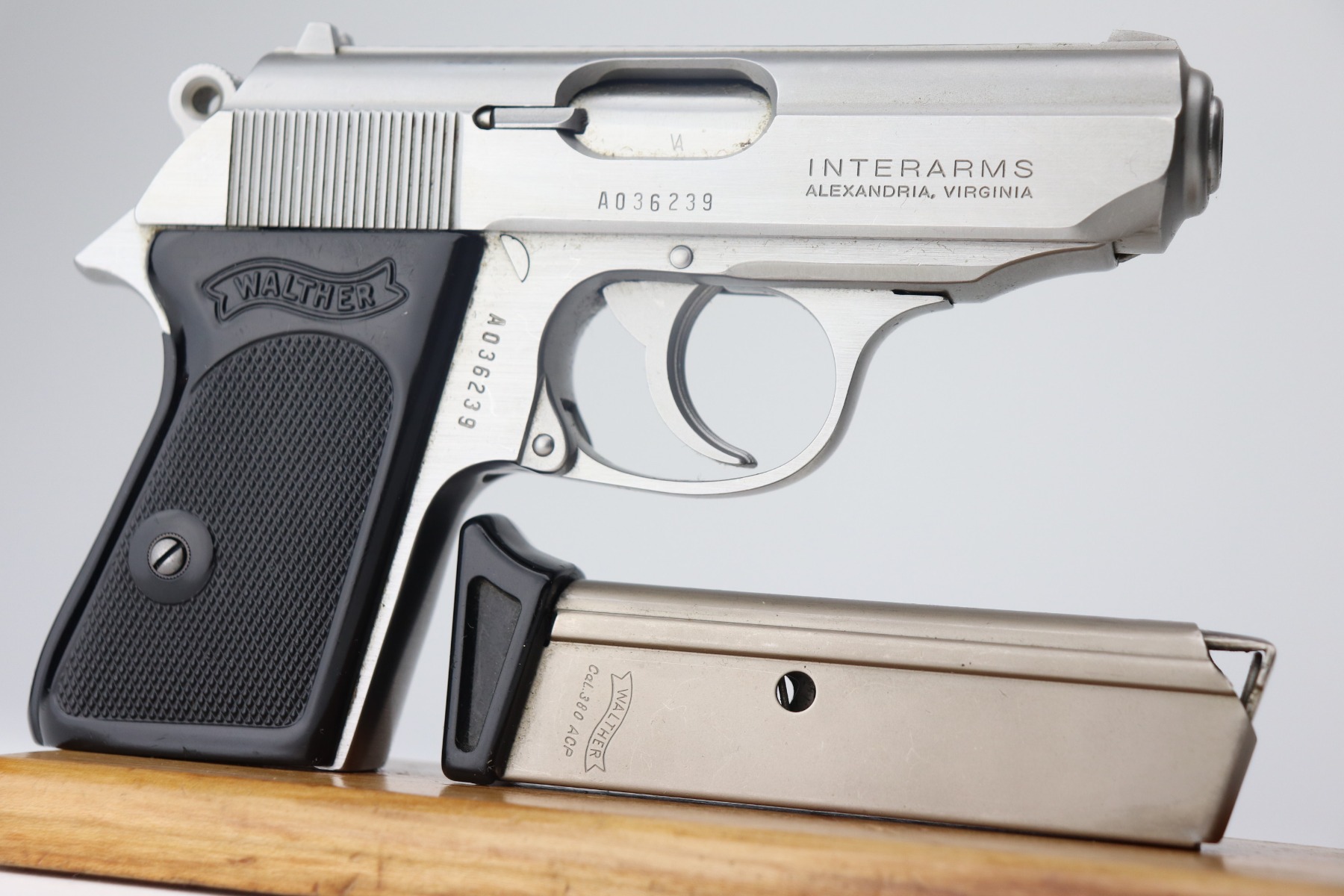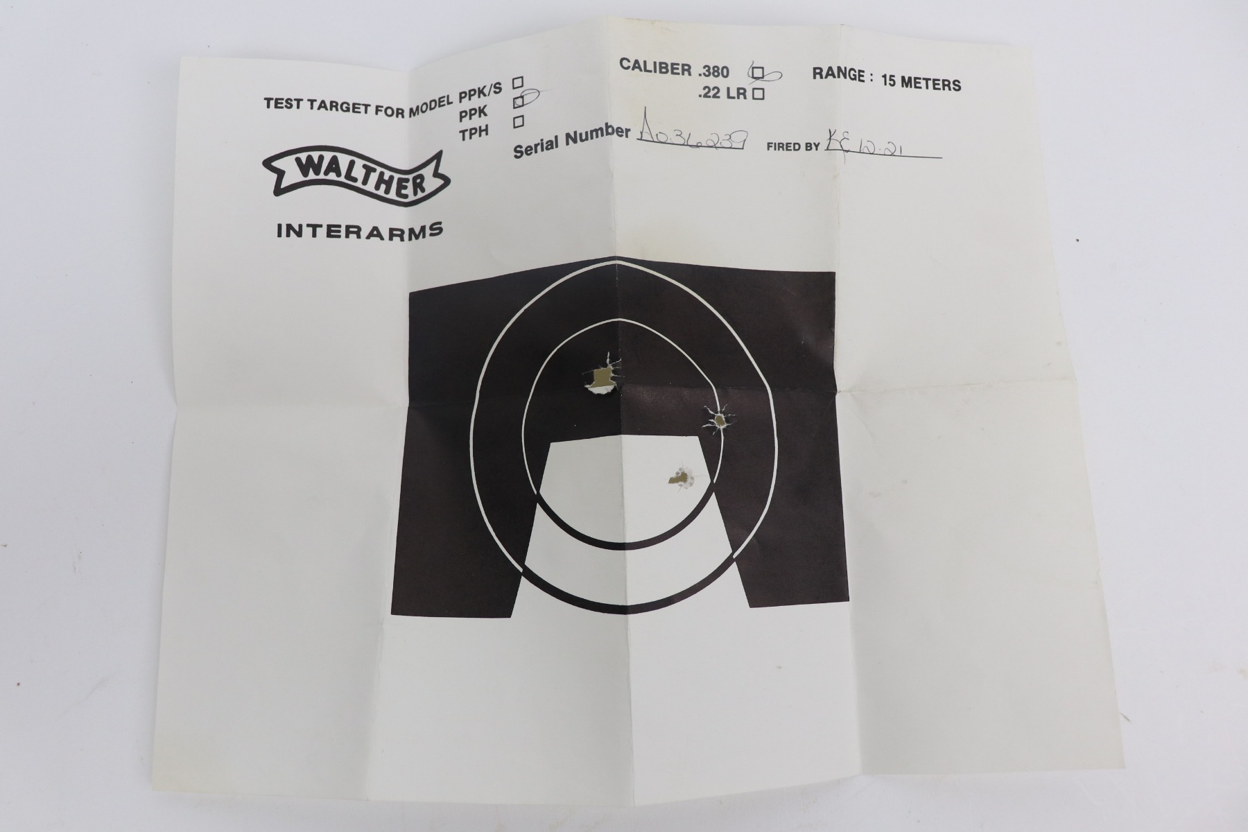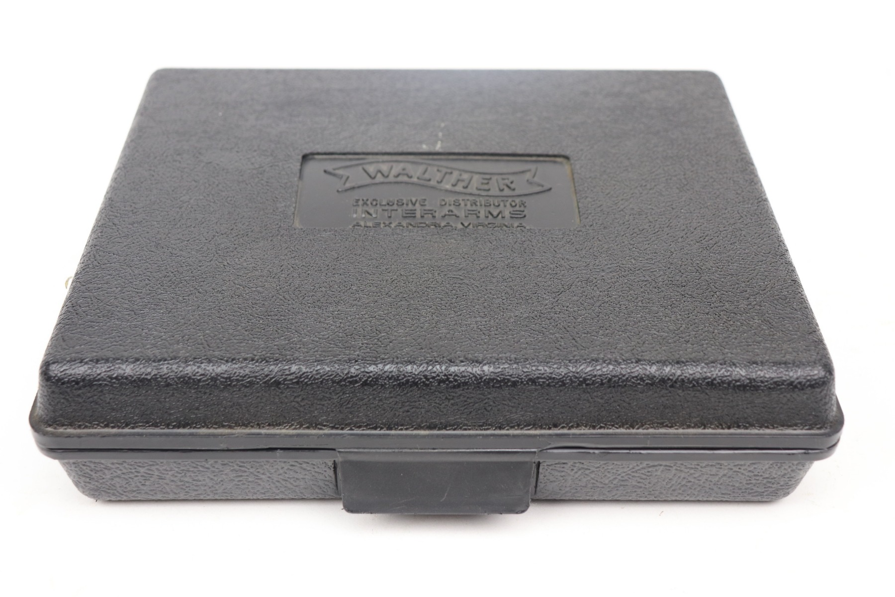 2/24/21 – This is an excellent example of a Walther / Interarms PPK made in the US in the 1980’s. This one comes with the original box (serialized to the gun), test target (serialized to the gun). owners manual, a finger extension magazine, and a flat-bottom magazine. Overall, the gun is in excellent condition. There are just some micro scratches along the right side of the slide. It has an excellent black Walther grip. The bore is mint.