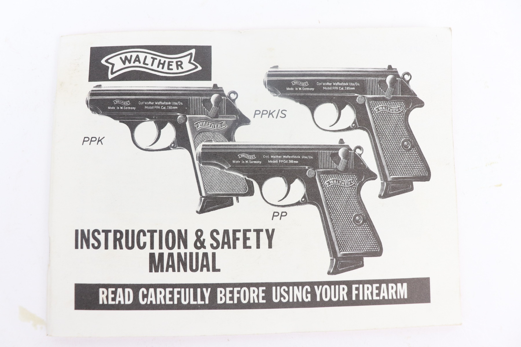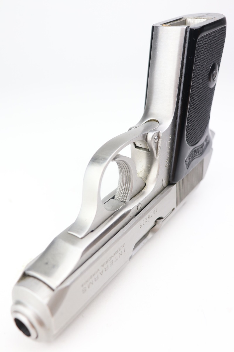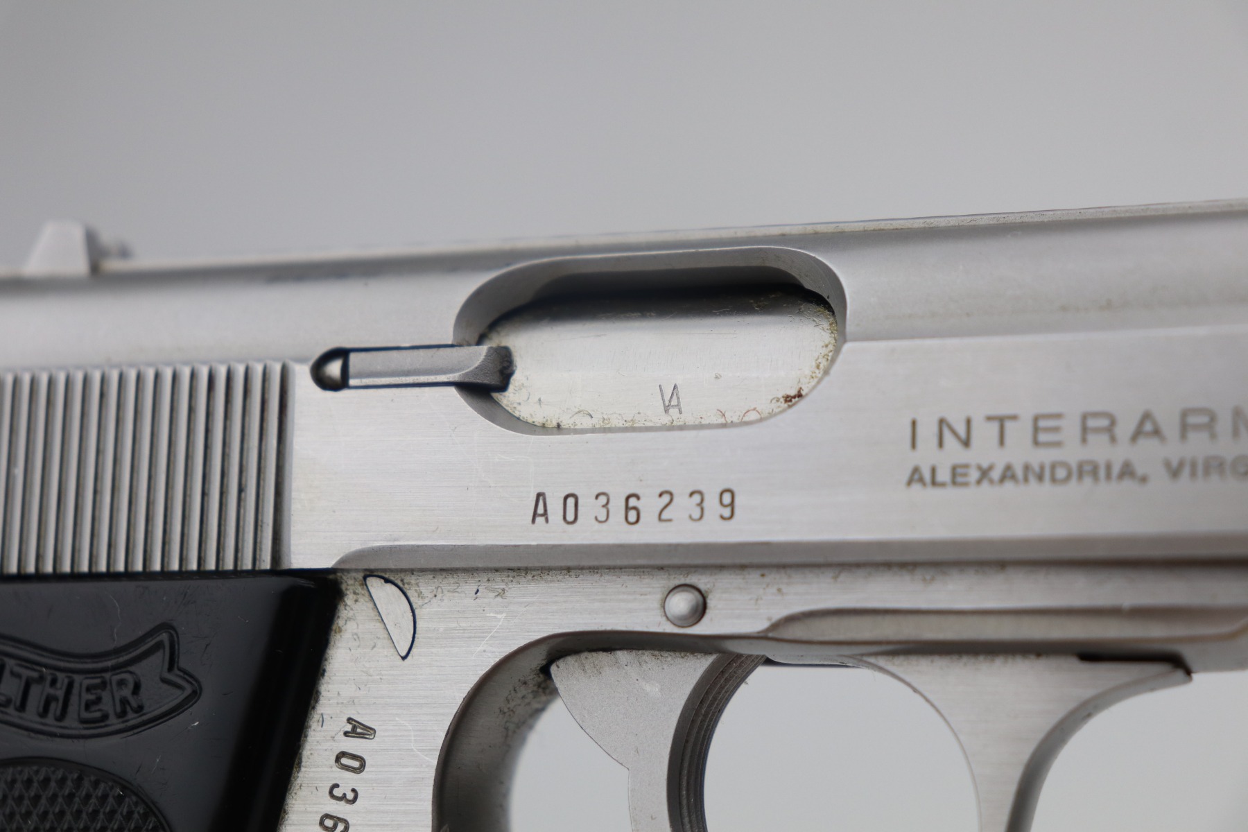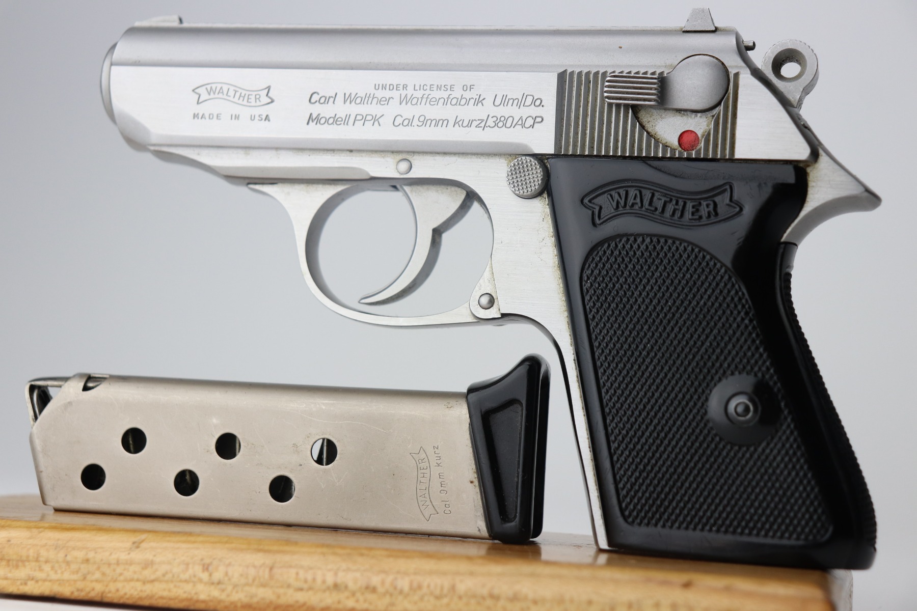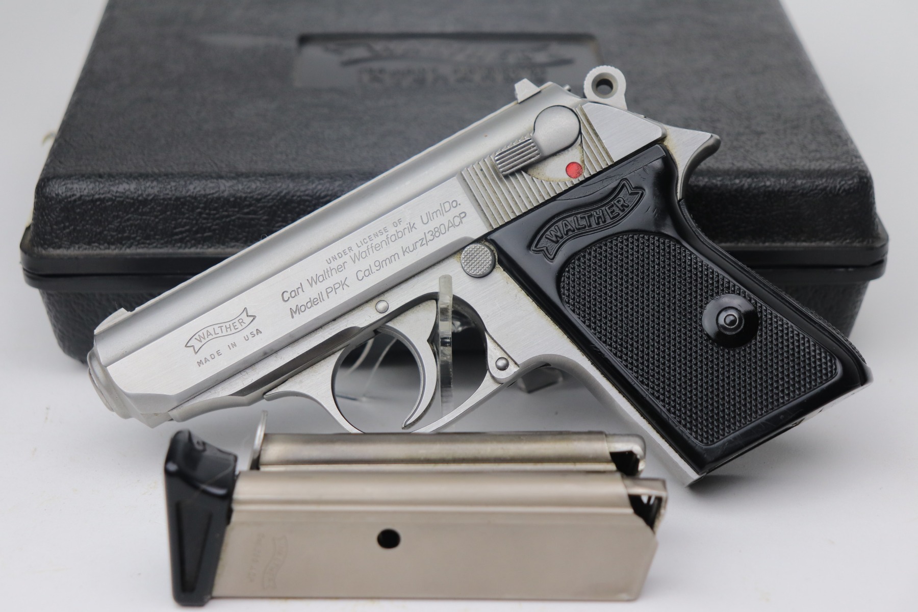 2/24/21 – This is an excellent example of a Walther / Interarms PPK made in the US in the 1980’s. This one comes with the original box (serialized to the gun), test target (serialized to the gun). owners manual, a finger extension magazine, and a flat-bottom magazine. Overall, the gun is in excellent condition. There are just some micro scratches along the right side of the slide. It has an excellent black Walther grip. The bore is mint.