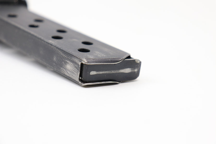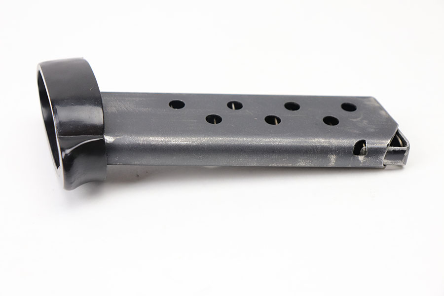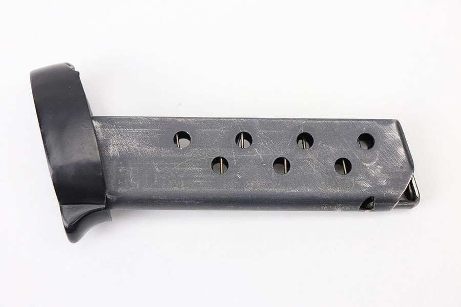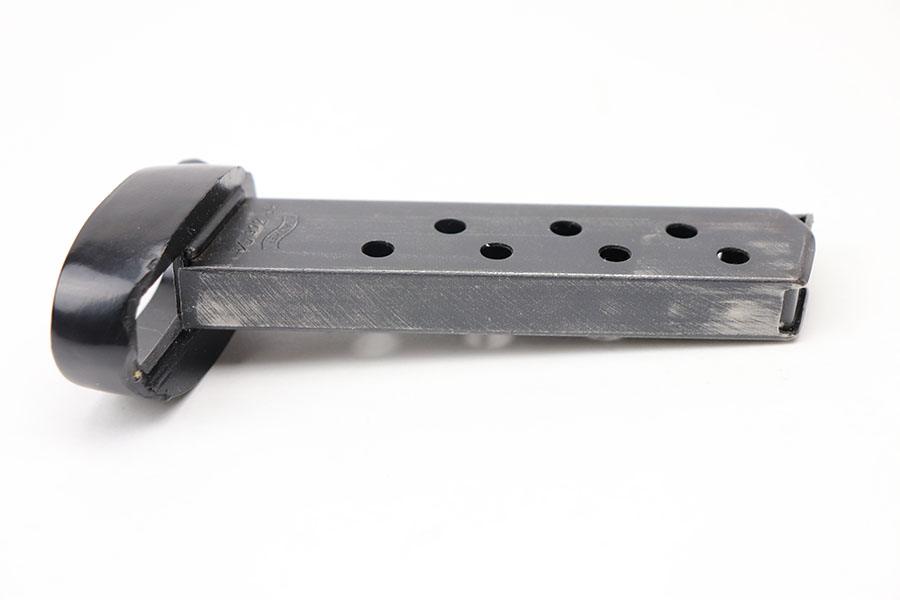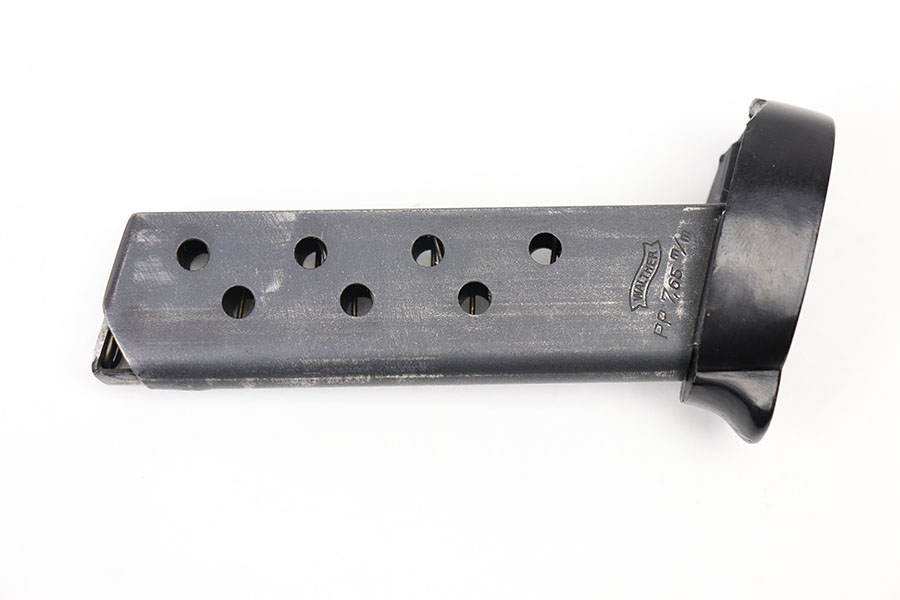4/5/21 – This is an original WW2 production, rare variation “boxed” finger extension Walther PP magazine. The magazine has a wartime blued finish and caliber information under the Walther banner stamped on the frame. The bakelite finger extension was added for grip comfort and is seldom found in today’s PPs. Unfortunately, the back “hump” of the magazine has chipped off. This is a common flaw however, and otherwise the magazine is in great condition. Strong, fully functional spring.