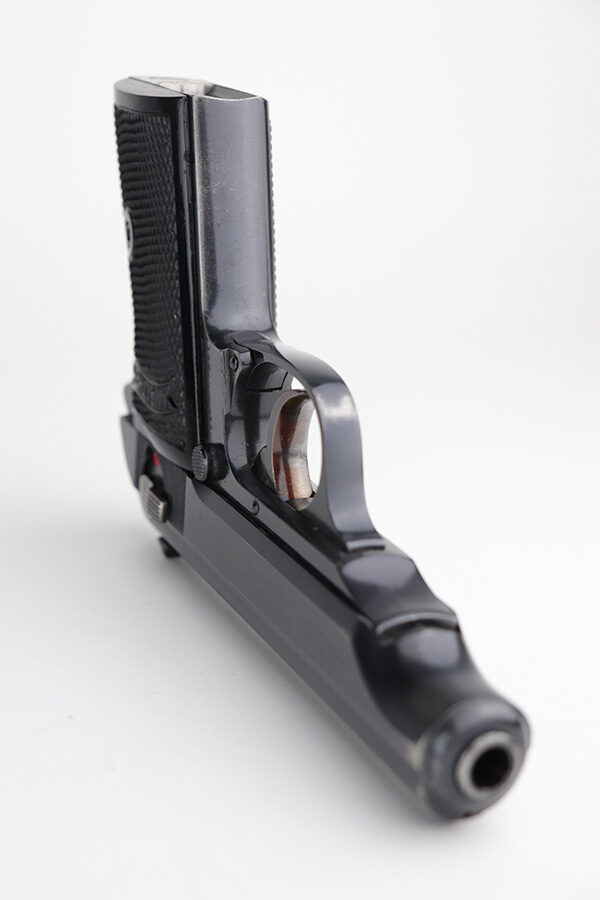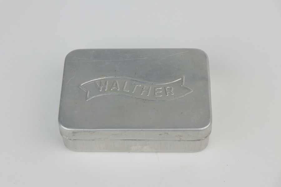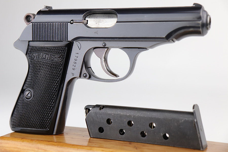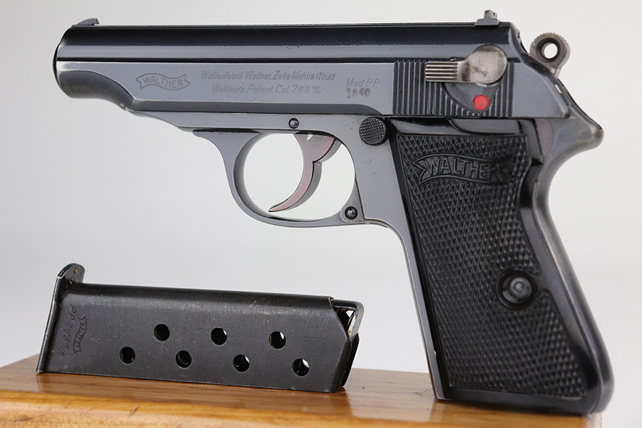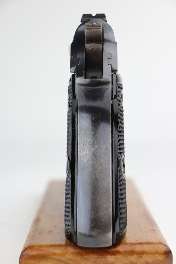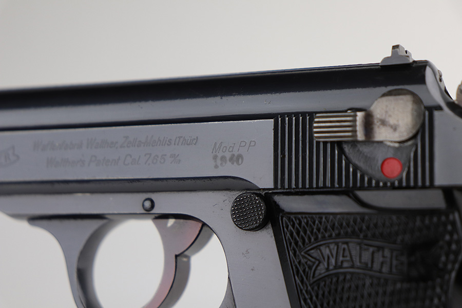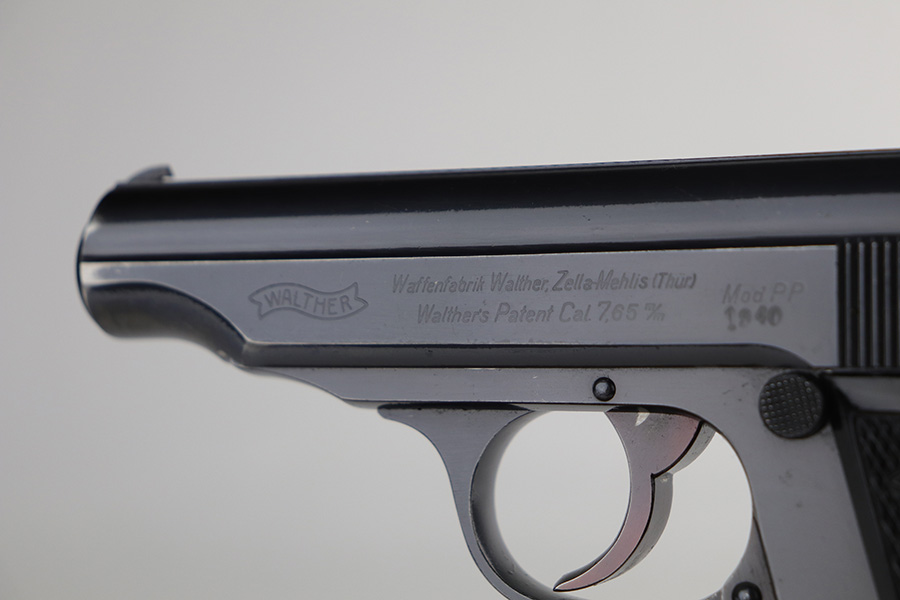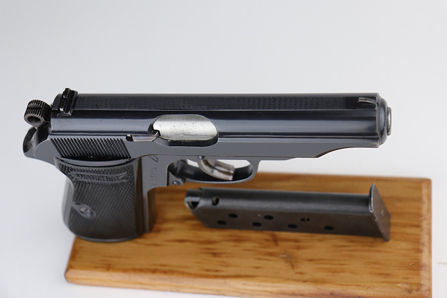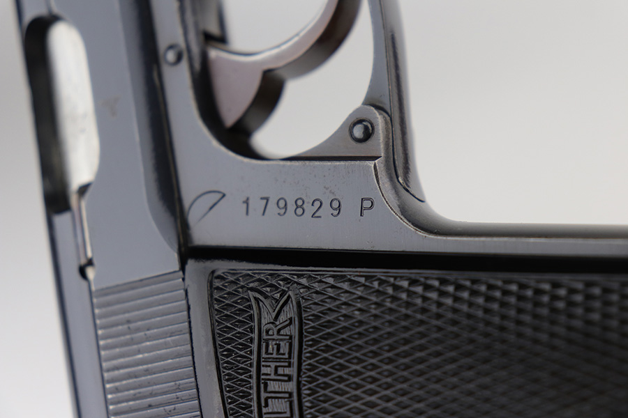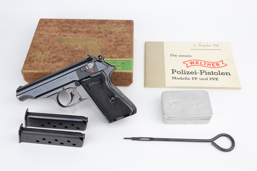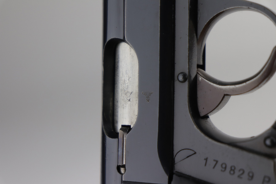 9/7/21 – This is a very nice example of a Walther PP issued to the Nazi Railway Police force. It is all matching and has the proper “1940” railway style date marking on the left side of the slide. It comes with an almost-matching box (the serial is only 4 digits away!), two minty wartime magazines, an original cleaning rod, a 1939-dated manual, and an original cleaning tin (nothing inside). The edges of the bottom portion are torn and the cardboard separator on the inside is in three pieces. The gun has retained about 92% of its original high polish finish. The profile views are excellent, as most of the wear is on the straps. Very minor wear around the muzzle and high edges of the slide. Excellent bore – shiny with strong rifling.