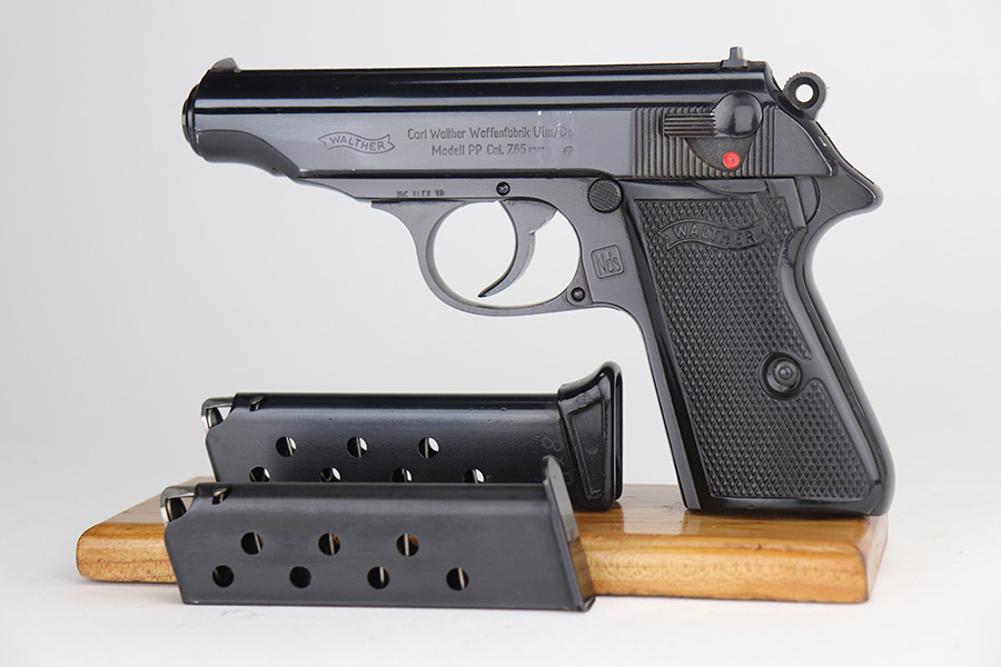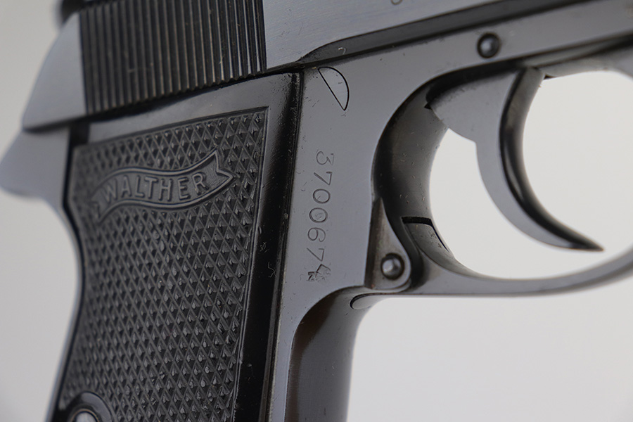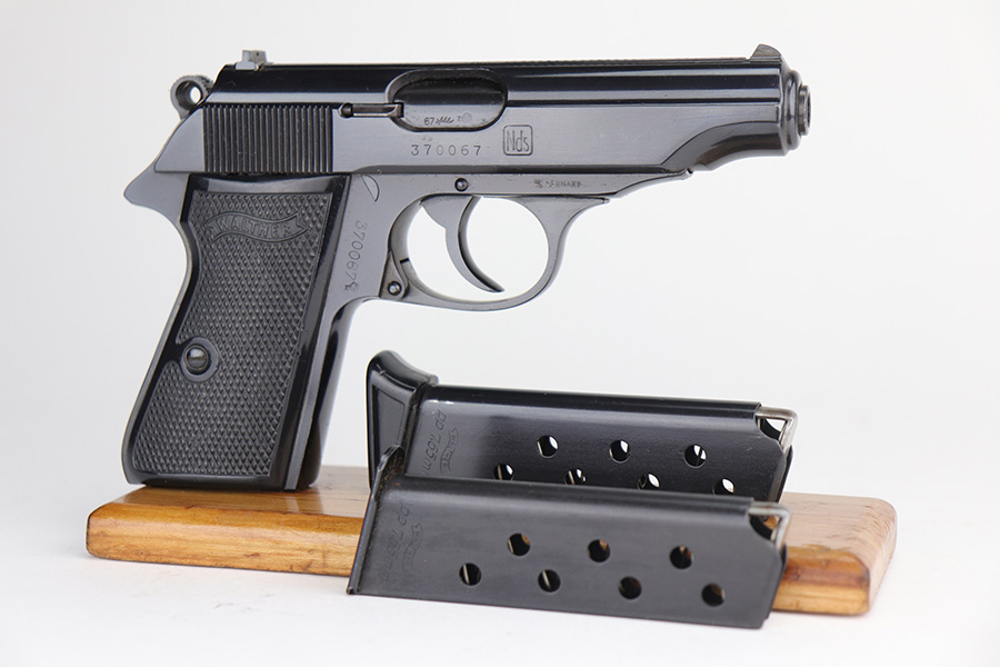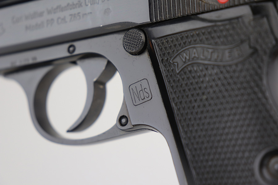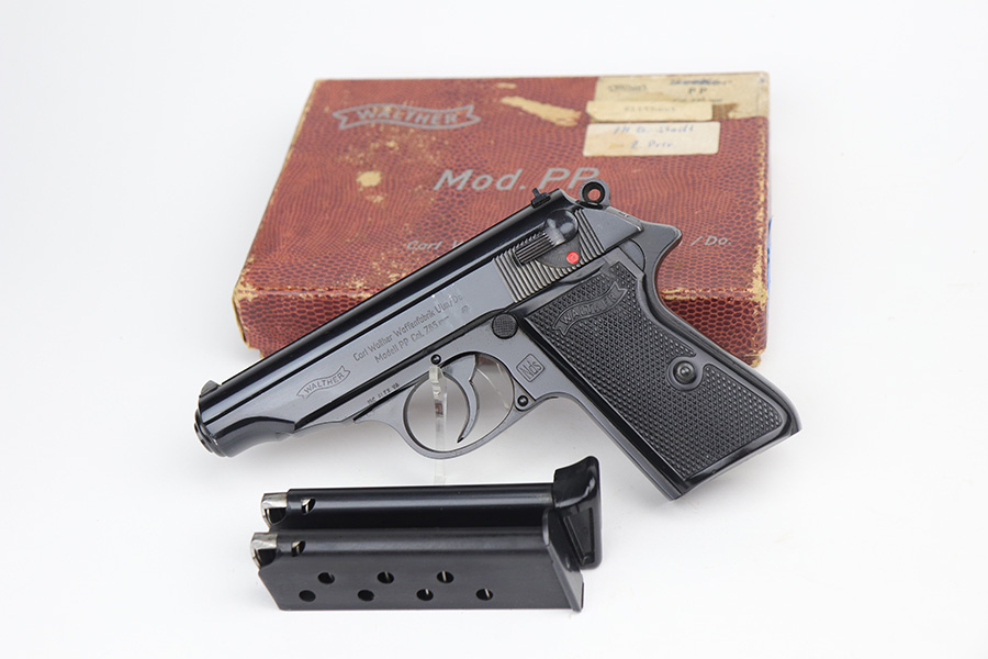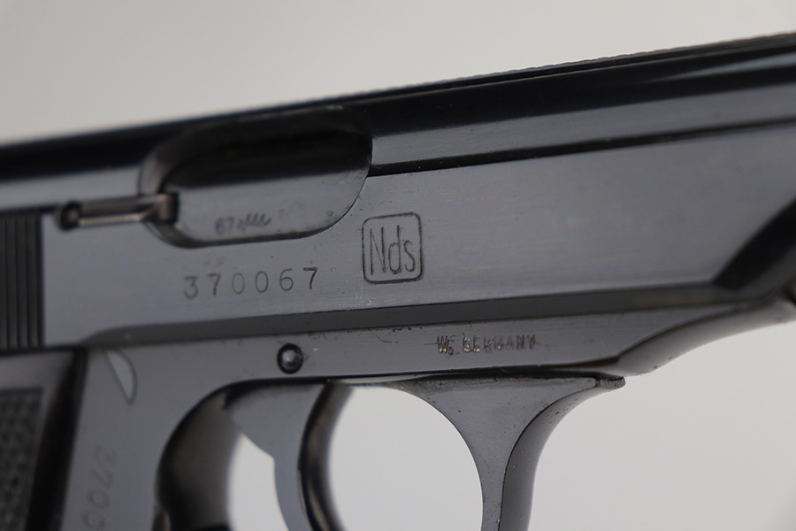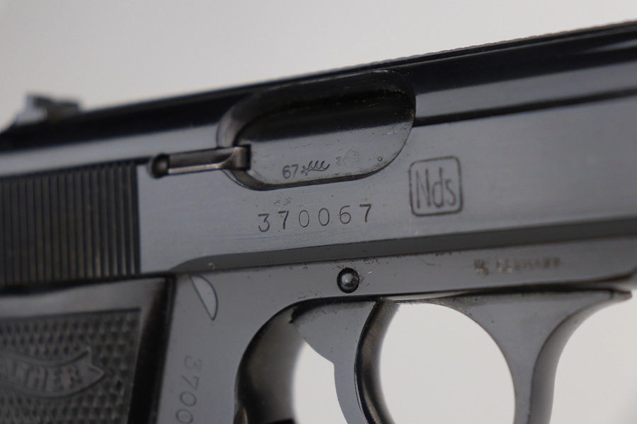 10/28/21 – This is a minty example of a Walther PP manufactured in 1967. It is all matching and has the proper West German proofs. The slide and frame are marked “NDS”, indicating that the gun was issued to the State Police of Niedersachsen in West Germany. There is a small import mark on the left side of the frame and a small export marking on the right side of the frame. It comes with a mismatched but period-correct Walther PP box, a finger extension magazine that is numbered but mismatched, and a flat bottom magazine that matches the gun. It has retained about 98% of its high polish bluing. There is a small area of very minor spotty wear on the left side of the slide and a few tiny handling marks on the front strap. Comes with excellent black plastic grips. The bore is near-mint.