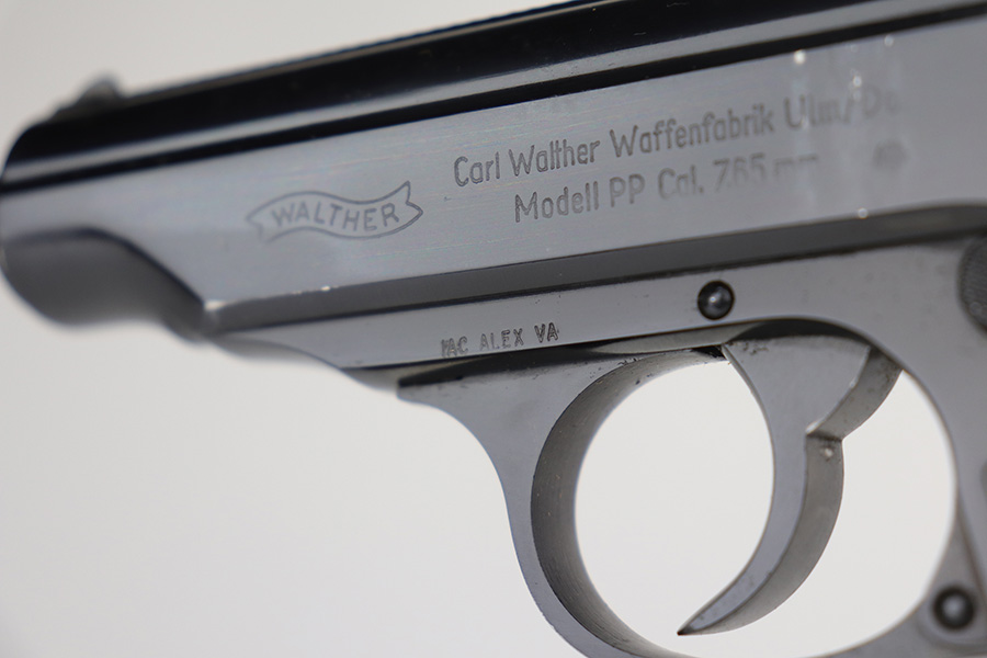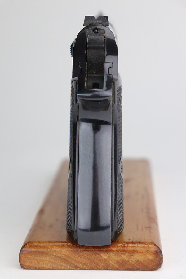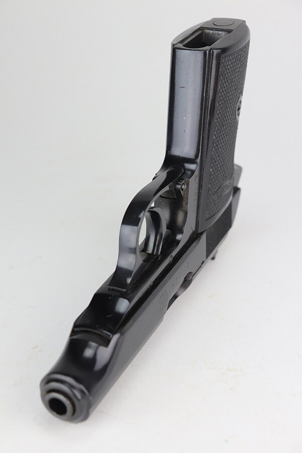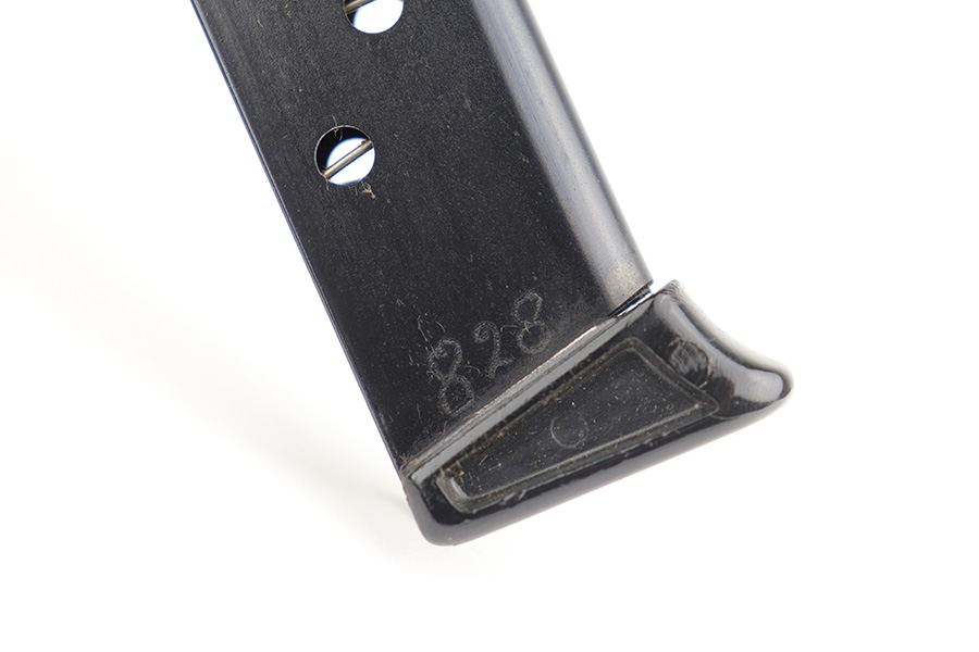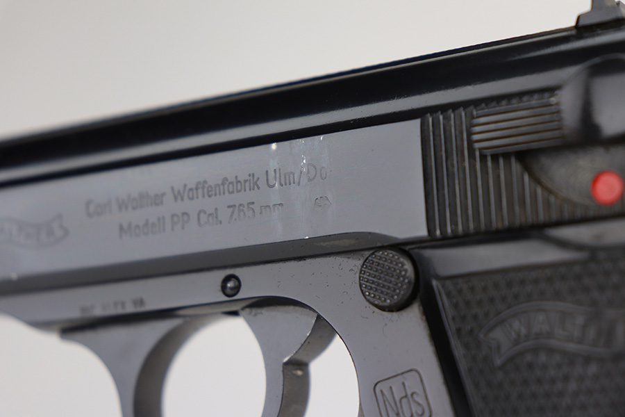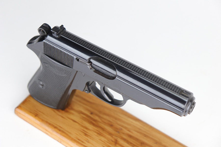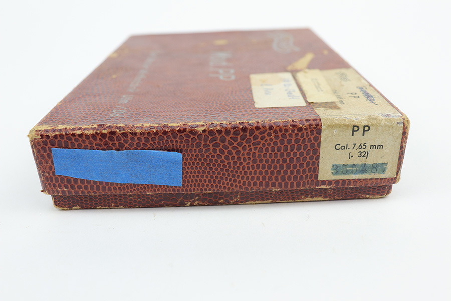 10/28/21 – This is a minty example of a Walther PP manufactured in 1967. It is all matching and has the proper West German proofs. The slide and frame are marked “NDS”, indicating that the gun was issued to the State Police of Niedersachsen in West Germany. There is a small import mark on the left side of the frame and a small export marking on the right side of the frame. It comes with a mismatched but period-correct Walther PP box, a finger extension magazine that is numbered but mismatched, and a flat bottom magazine that matches the gun. It has retained about 98% of its high polish bluing. There is a small area of very minor spotty wear on the left side of the slide and a few tiny handling marks on the front strap. Comes with excellent black plastic grips. The bore is near-mint.