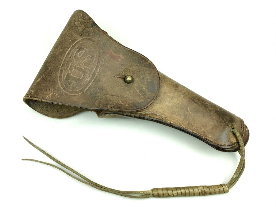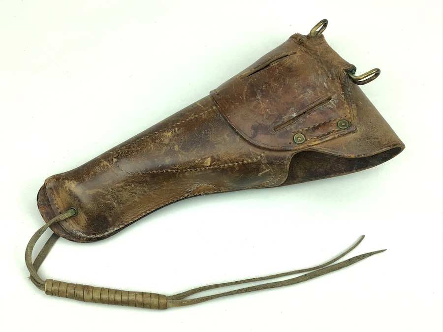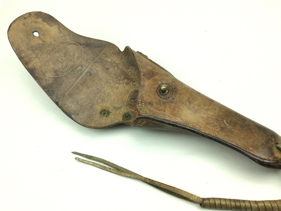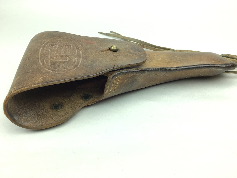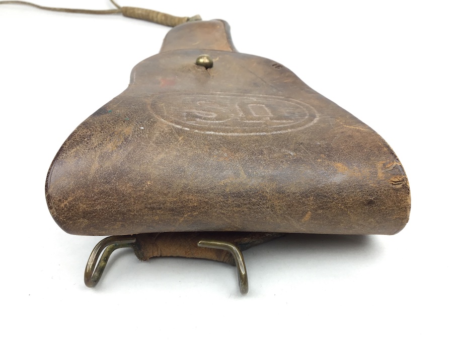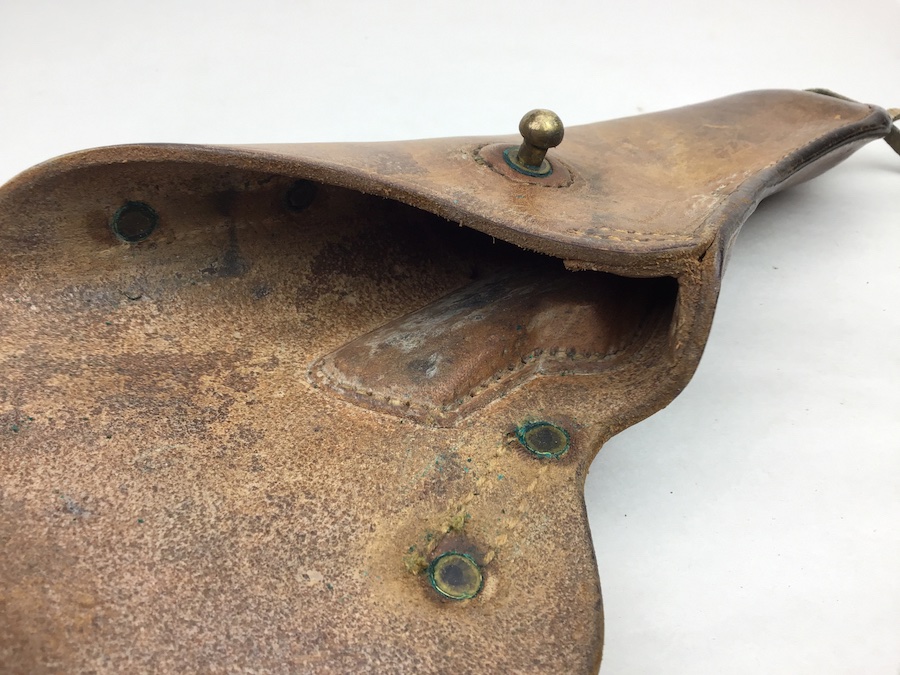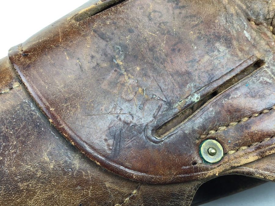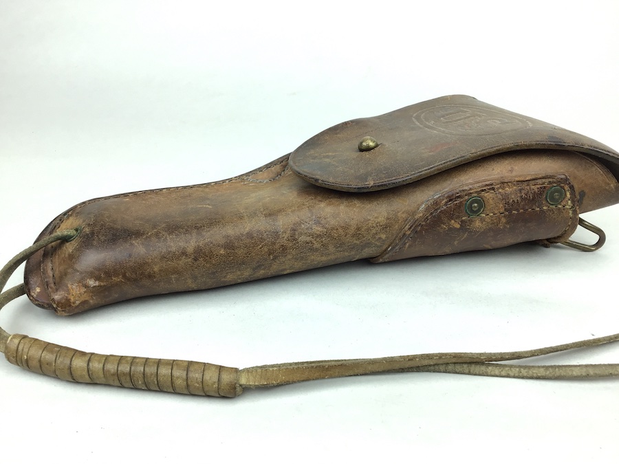 1/20/20 – This is an original 1911A1 holster made by BOYT. The back of the holster is BOYT stamped with a “MS” underneath. The leather is fairly strong and clean, yet somewhat pliable. There is some minor wrinkling on the top leather and around the front flap where the button hole is. The interior leather is very clean. Closure flap has a faint red mark next to the embossed “US” initials. Intact leg lanyard. The stitching is excellent and completely in tact.