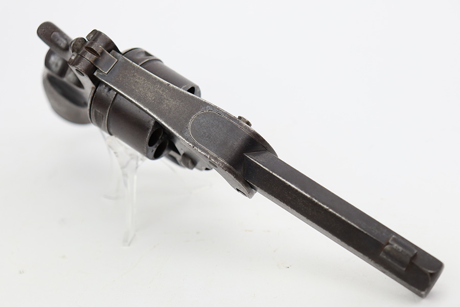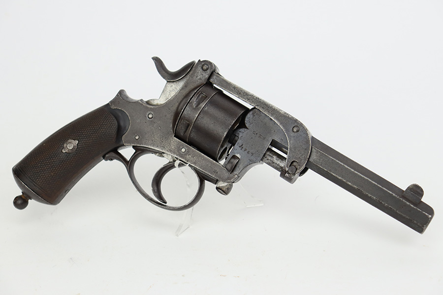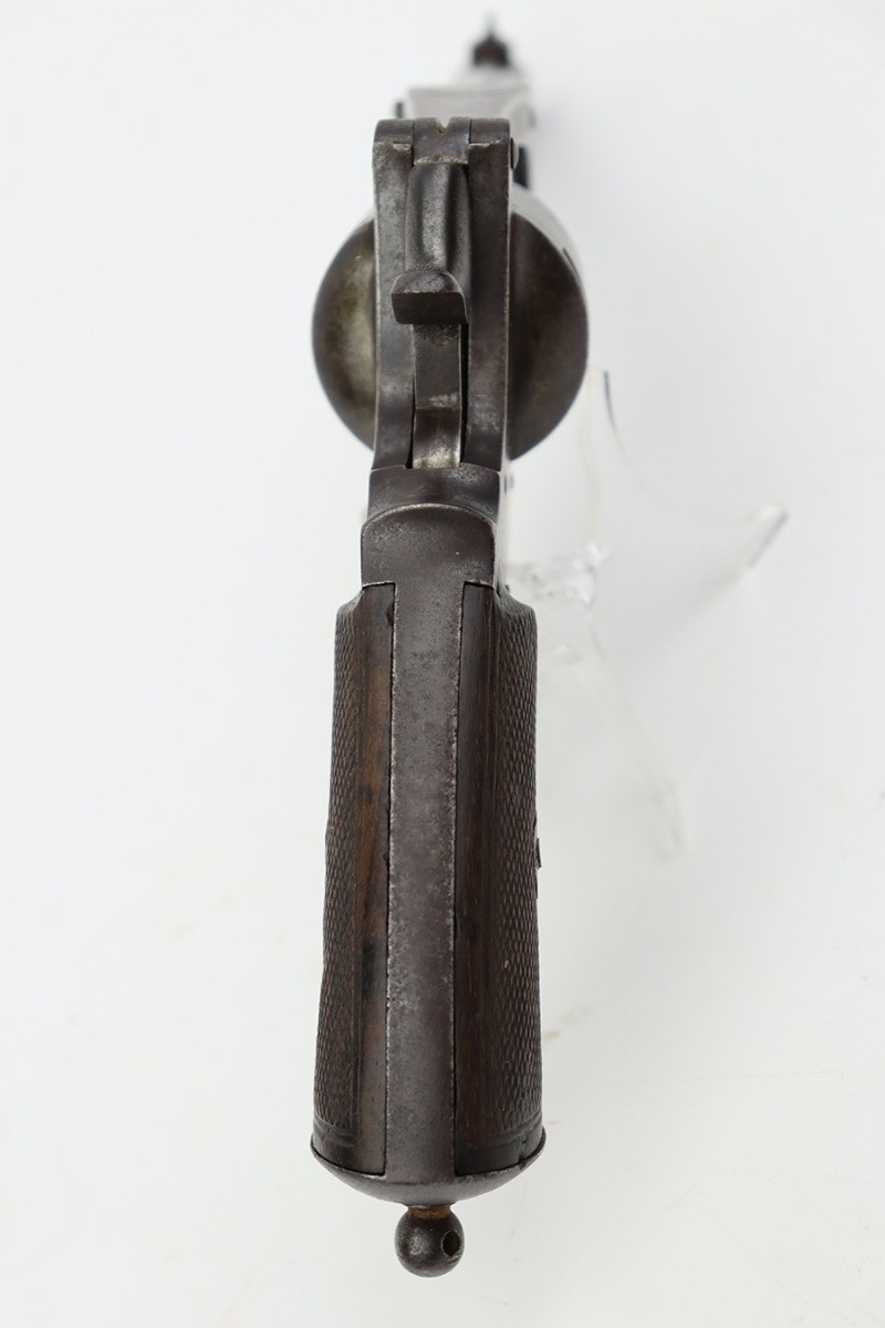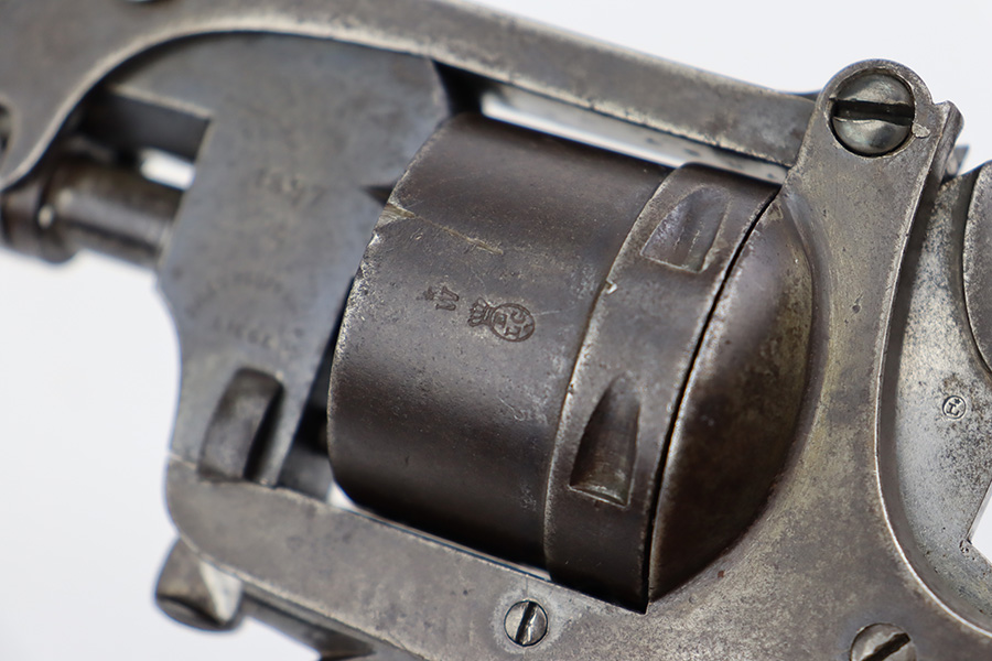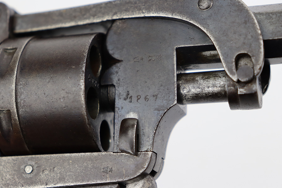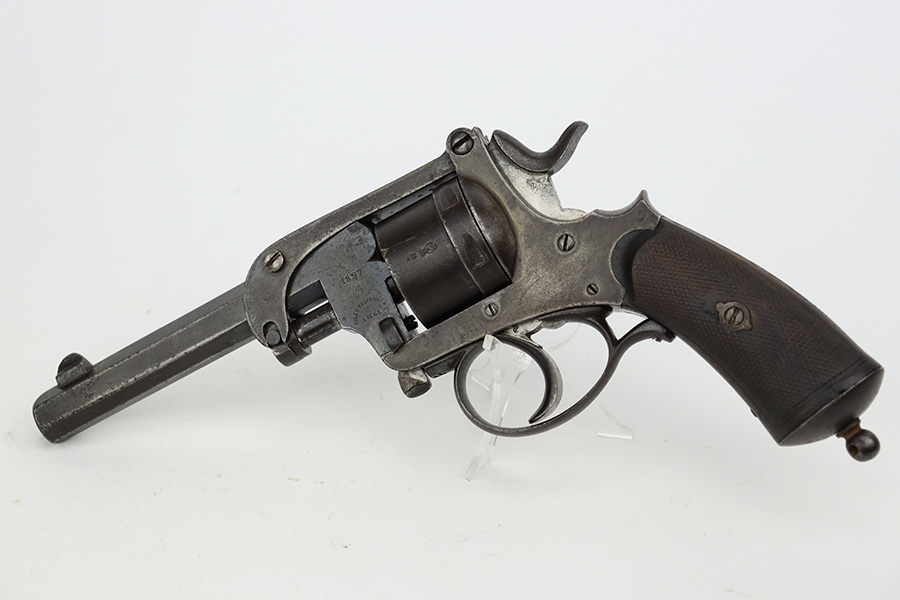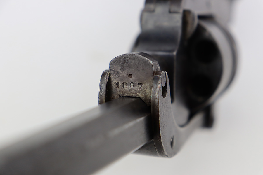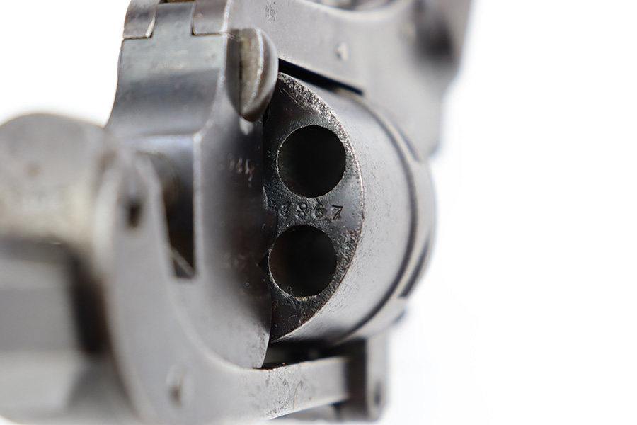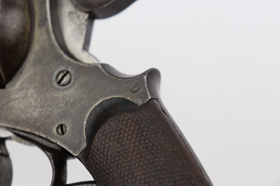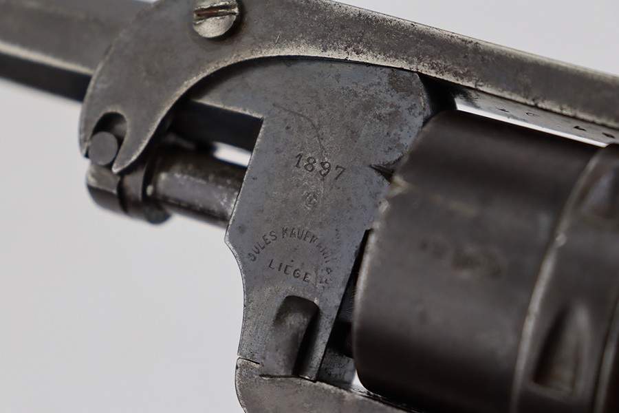 7/28/23 – This is a nice example of a Jules Kaufman double action top-break revolver manufactured for the Brazilian government in 1897. The gun is dated 1897 on the left side of the receiver and has an 1867 serial number on the right side. All matching with Liege proofs throughout. The original lanyard ring on the butt of the frame is missing. There isn’t a ton of actual finish loss, but there is noticeable brown patina and spotty oxidation covering the whole gun. Some areas of minor pitting here and there. Fitted with nice period-correct wood grips. The bore has strong rifling for the most part with a few areas of pitting.