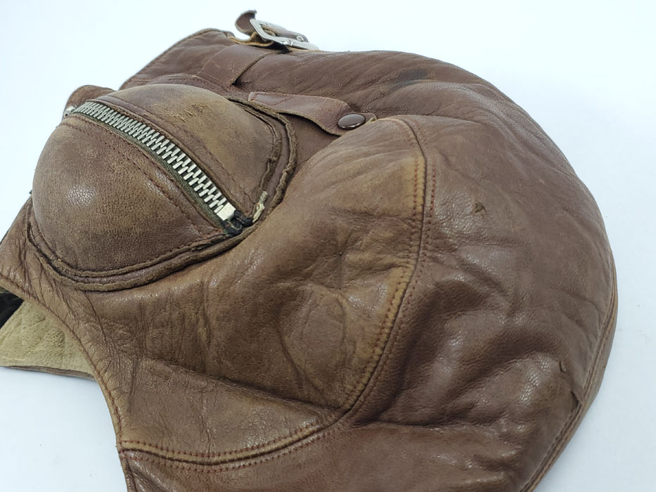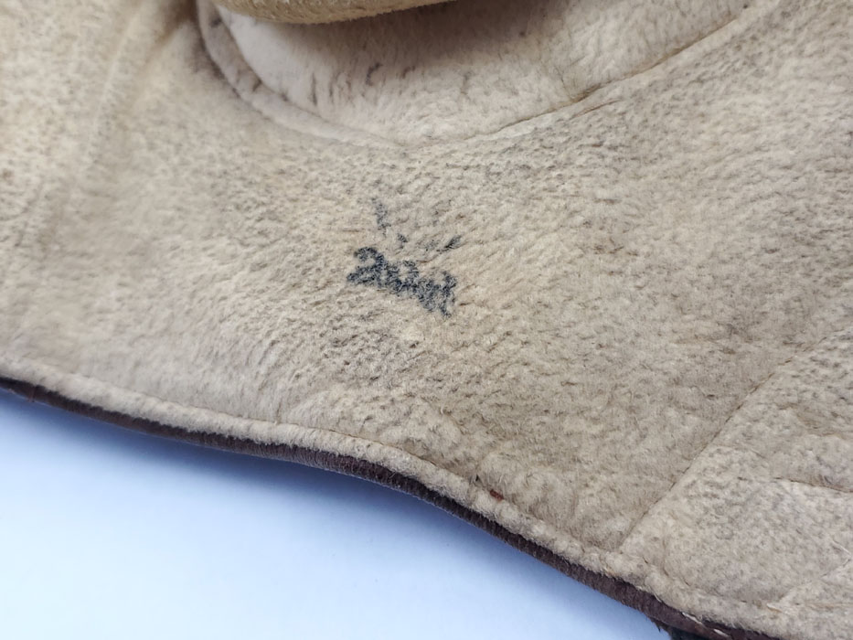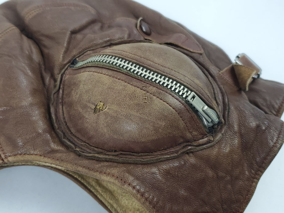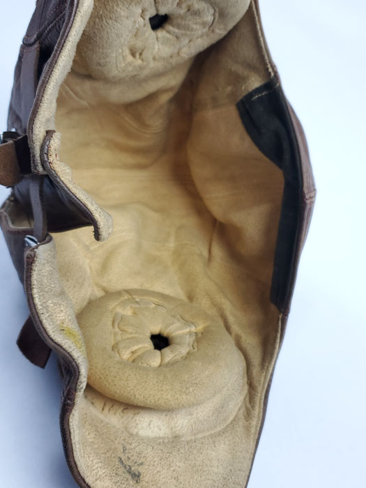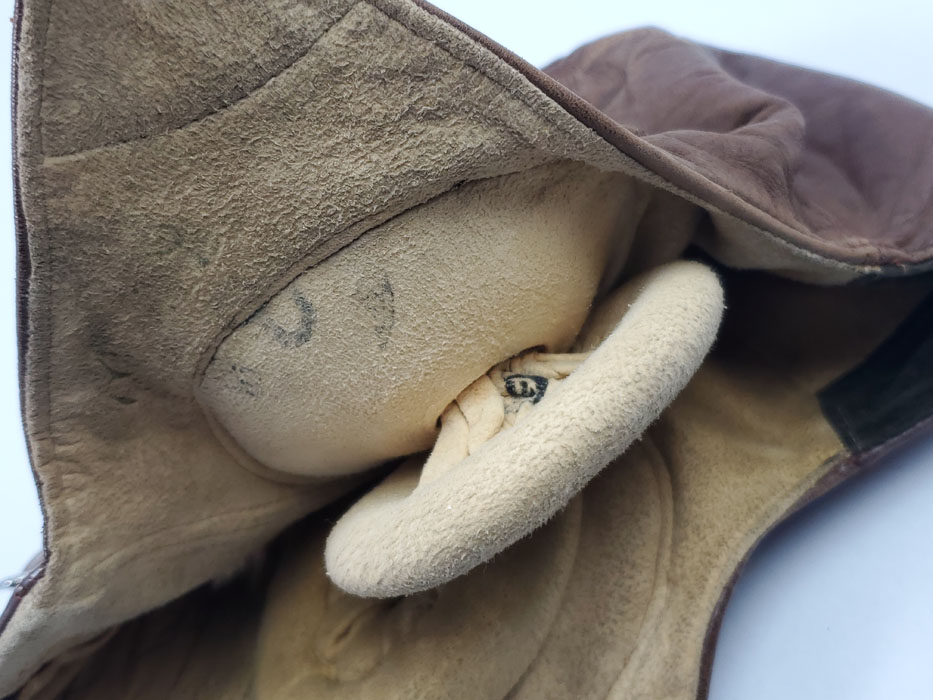 3/25/20 – This is an original British Air Fleet Type C flying helmet from WW2. The helmet has supple, soft leather that’s in excellent condition. Only some very minor surface scuffs on one of the ear pieces – shown in photos. Excellent stitching throughout the helmet, and the zippers function without any snags. The interior has a few light / fading ink stamps, but one appears to be a Royal Air Force ink stamp. The interior is very soft with only light darkening from use.