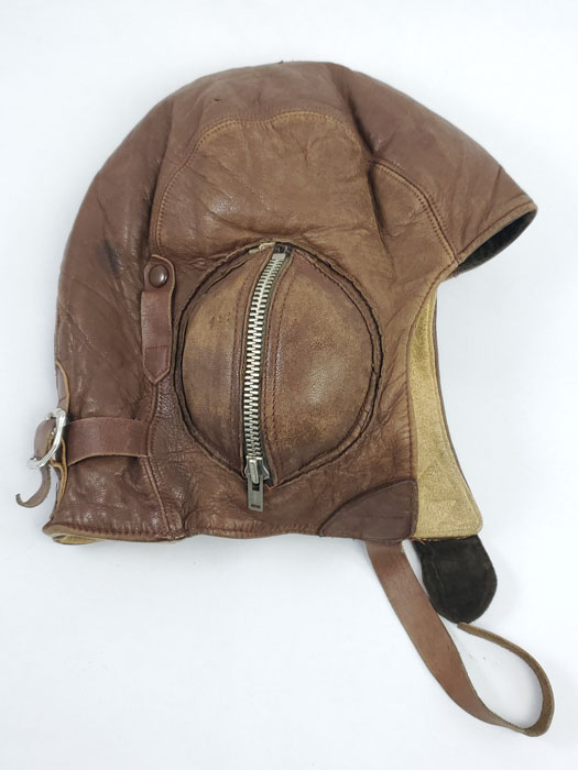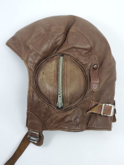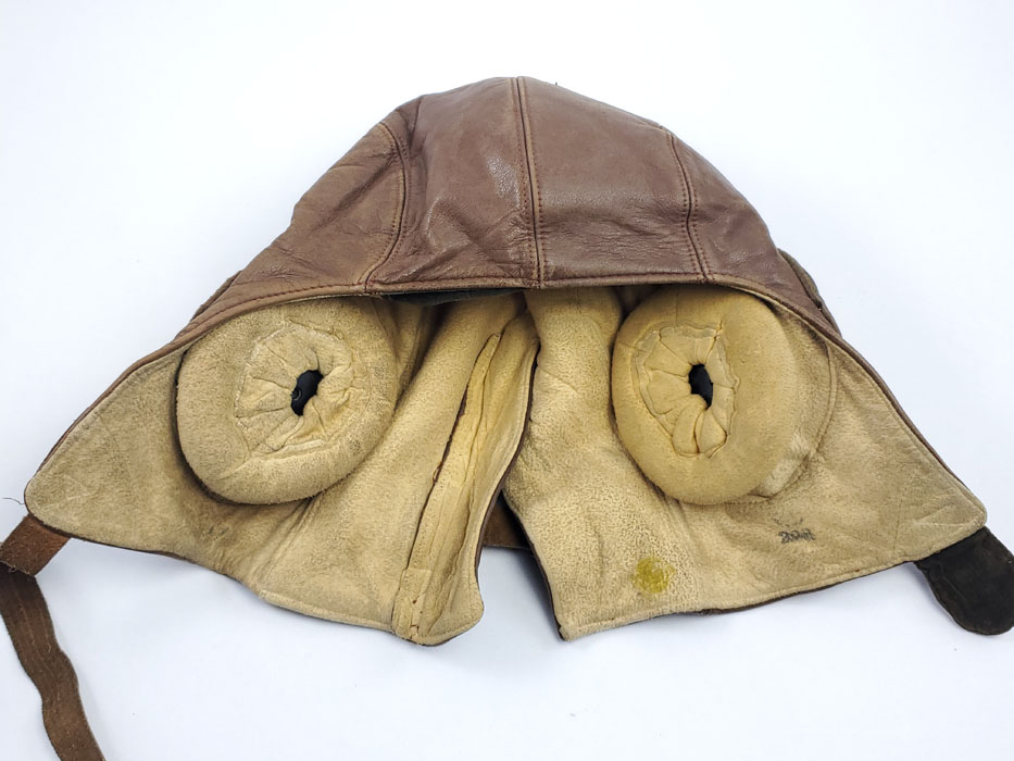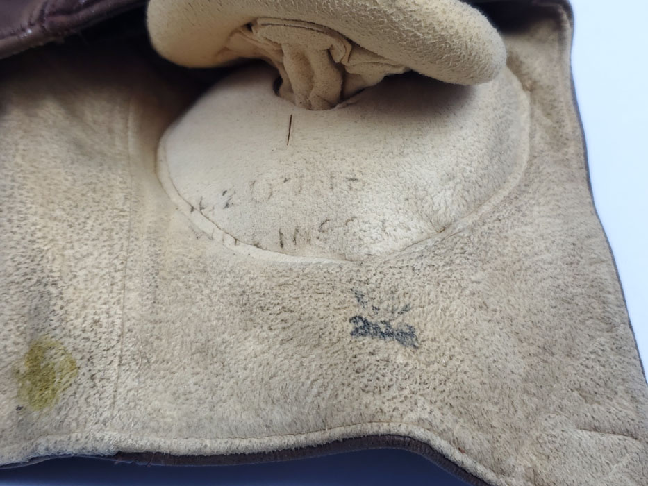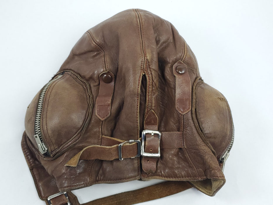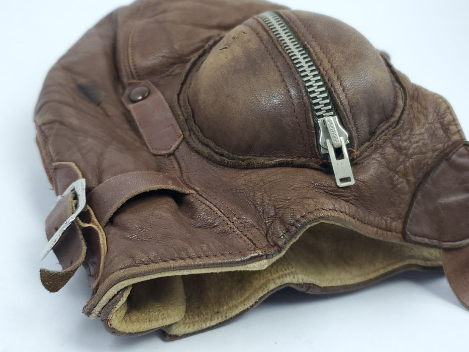 3/25/20 – This is an original British Air Fleet Type C flying helmet from WW2. The helmet has supple, soft leather that’s in excellent condition. Only some very minor surface scuffs on one of the ear pieces – shown in photos. Excellent stitching throughout the helmet, and the zippers function without any snags. The interior has a few light / fading ink stamps, but one appears to be a Royal Air Force ink stamp. The interior is very soft with only light darkening from use.