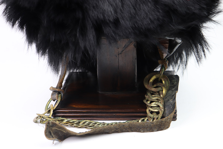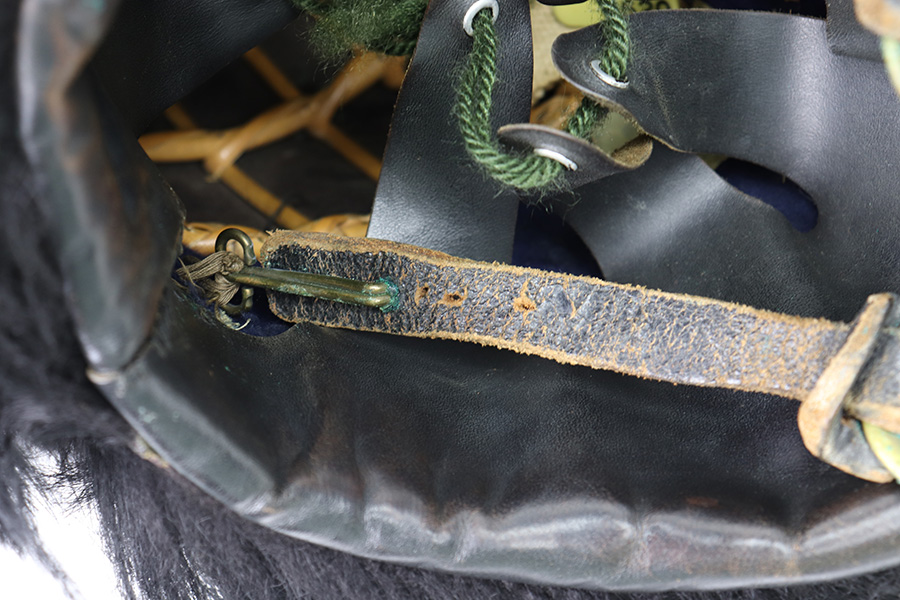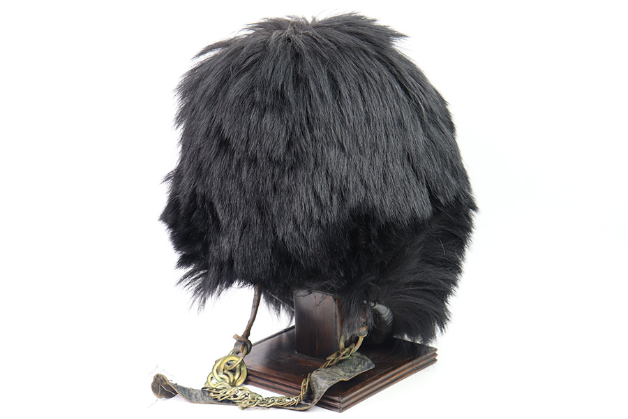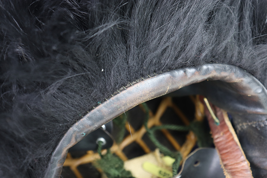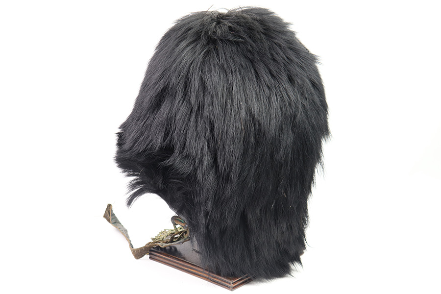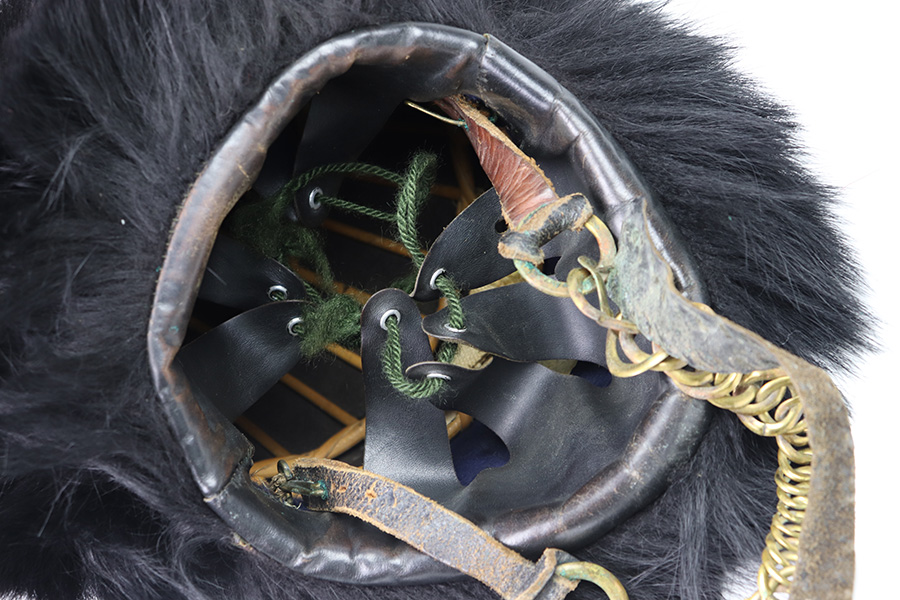 10/10/22 – This is a very nice example of a British Coldstream Guards bearskin helmet. Overall the cap is in very good condition. The bearskin fur is mostly intact and consistent in color. The interior bamboo wicket is in great condition with no signs of structural damage. The black leather liner is in good condition with no major defects. The leather of the chinstrap does unfortunately have some broken stitches as shown and the brass ring scales have patina throughout. The leather pieces securing the chinstrap to the interior are cracked and do show wear and age. There is a label stitched within the interior, but the ink has mostly faded. The cap includes a wooden display stand that is topped with a leather base for the inside of the cap. Overall, an interesting display piece in nice condition. Note that this helmet should be handled with care as the fur exterior is prone to shedding!
