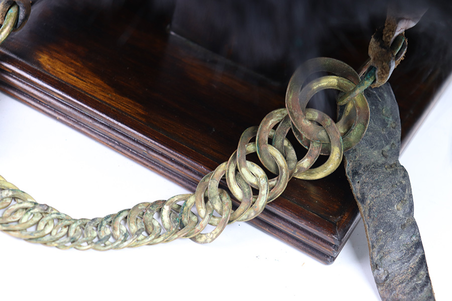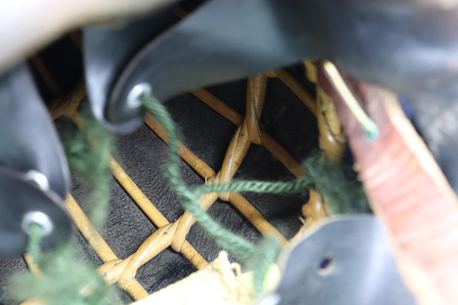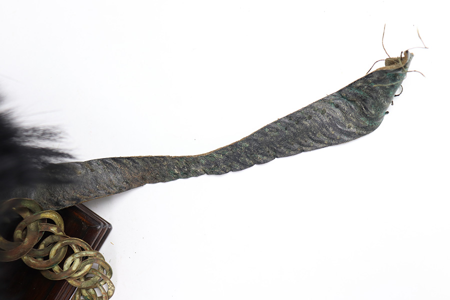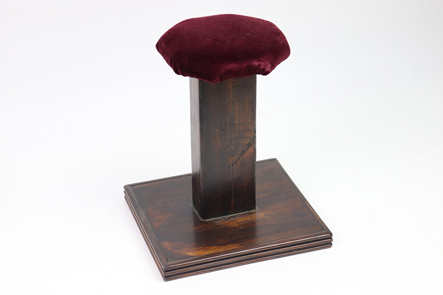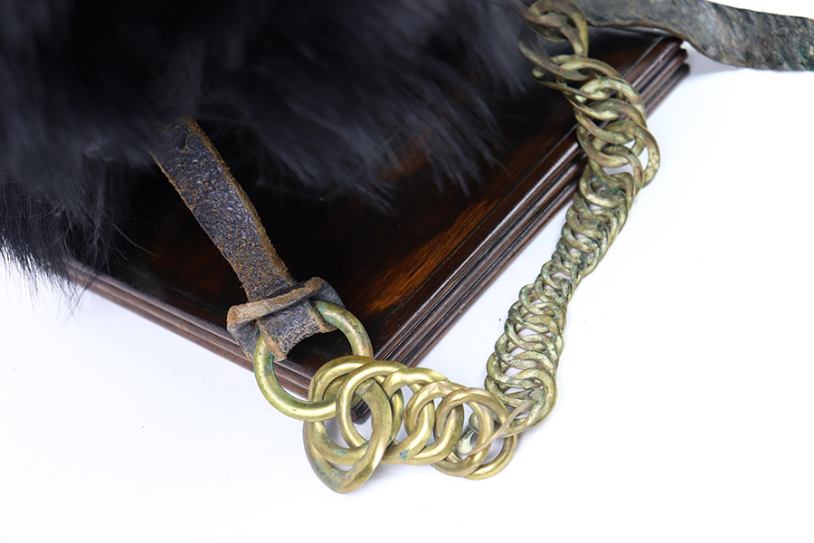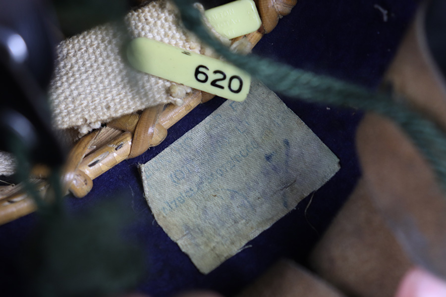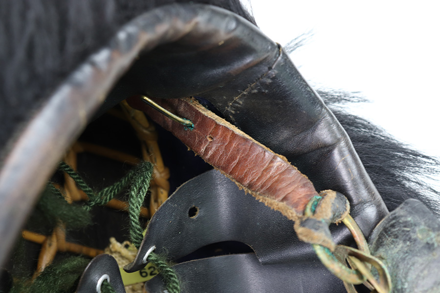 10/10/22 – This is a very nice example of a British Coldstream Guards bearskin helmet. Overall the cap is in very good condition. The bearskin fur is mostly intact and consistent in color. The interior bamboo wicket is in great condition with no signs of structural damage. The black leather liner is in good condition with no major defects. The leather of the chinstrap does unfortunately have some broken stitches as shown and the brass ring scales have patina throughout. The leather pieces securing the chinstrap to the interior are cracked and do show wear and age. There is a label stitched within the interior, but the ink has mostly faded. The cap includes a wooden display stand that is topped with a leather base for the inside of the cap. Overall, an interesting display piece in nice condition. Note that this helmet should be handled with care as the fur exterior is prone to shedding!