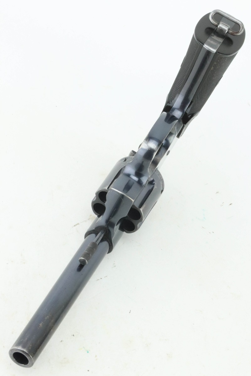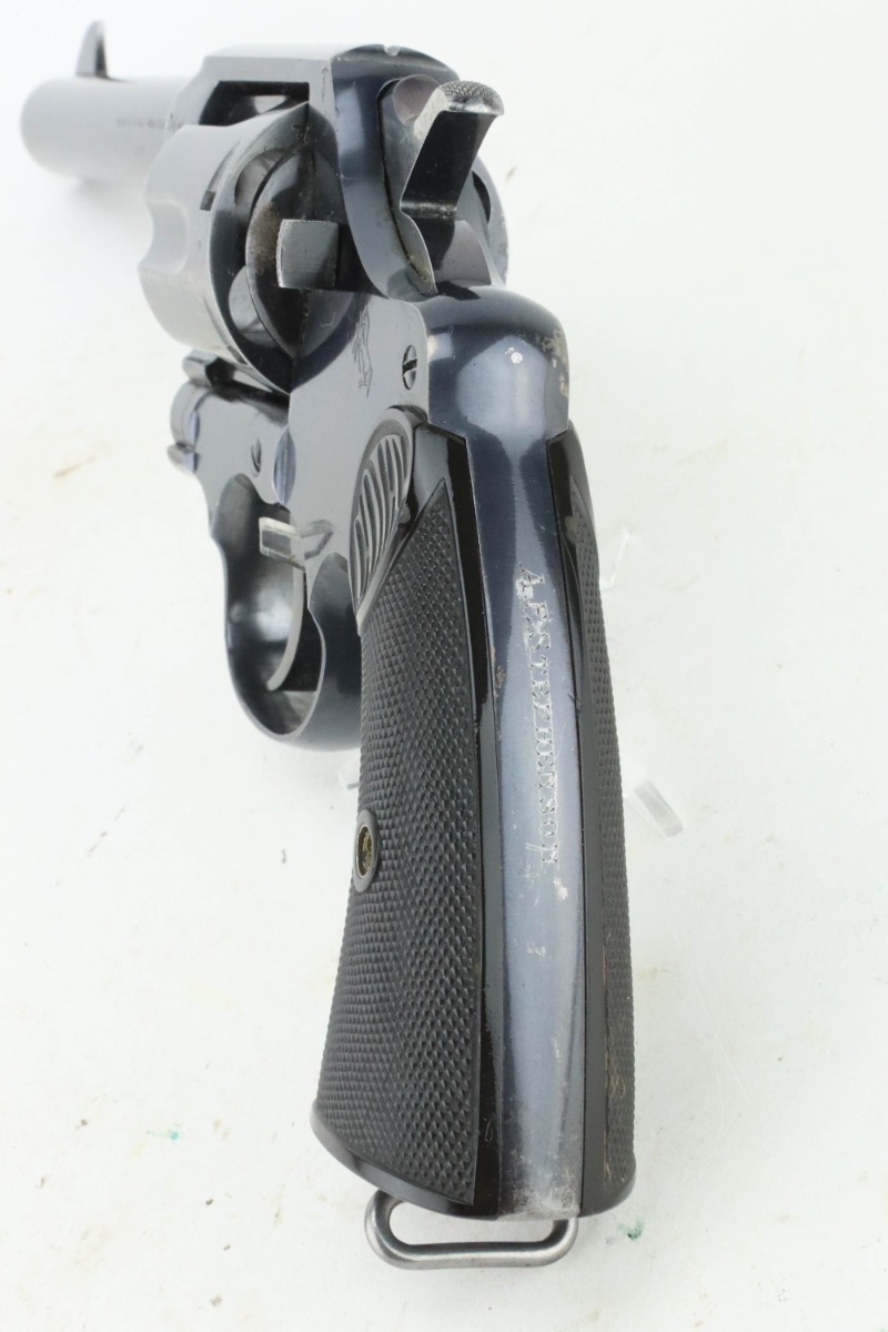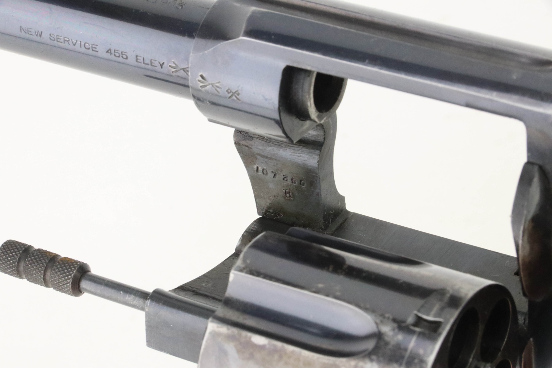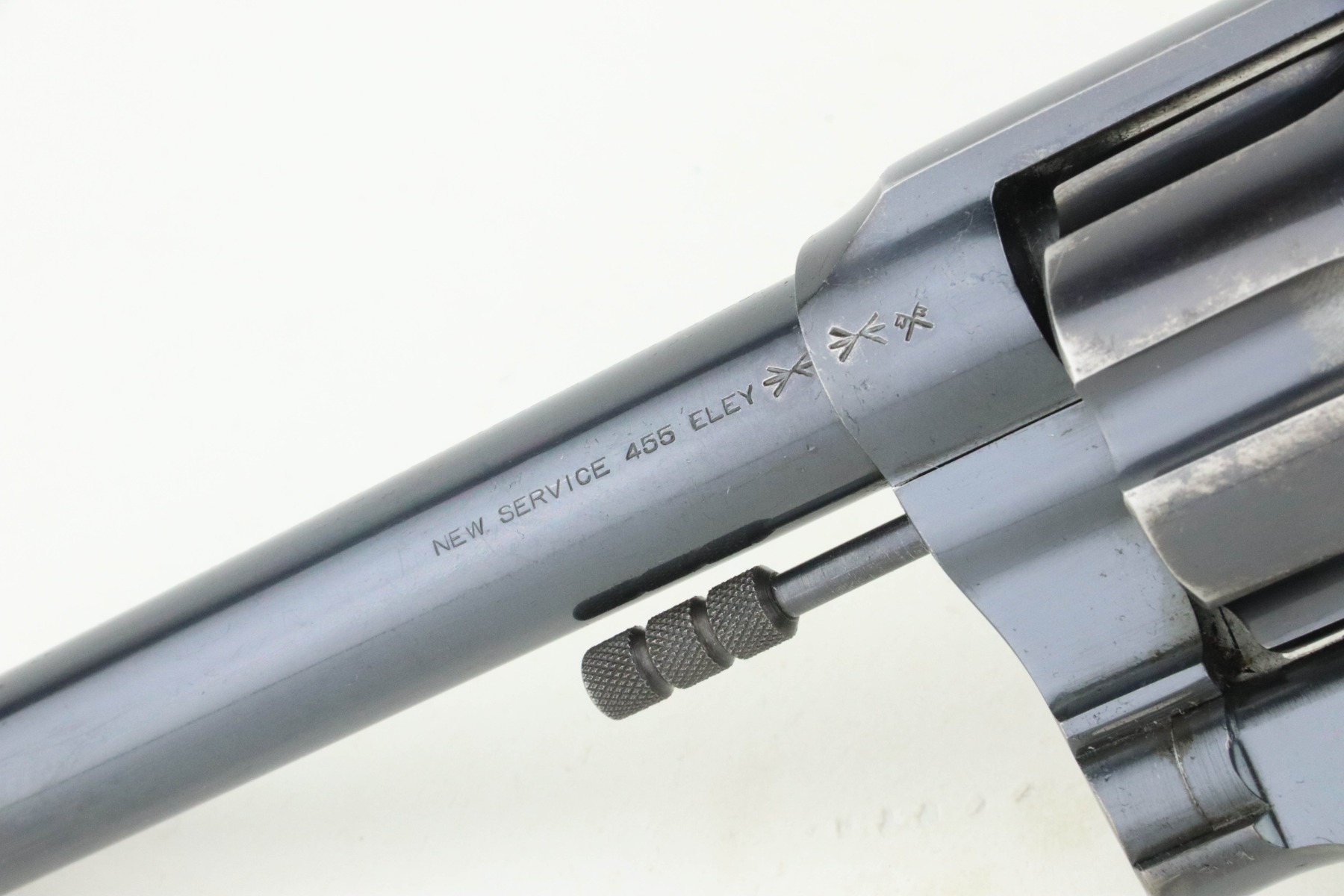 9/18/24 – This is a Colt New Service revolver from 1916 still chambered for the British .455 Eley cartridge. These revolvers were acquired by the British War Department during World War I, and they were popular with British officers. This one is all matching and has the proper British proofs throughout. There is an “A.E.Stevenson” marking on the back strap. It has retained about 90% of its original high polish finish. There is wear around the muzzle, some spotty wear on the cylinder, and wear on some of the high edges. A few light scratches and marks here and there. Fitted with proper black hard rubber grips. Mint bore.