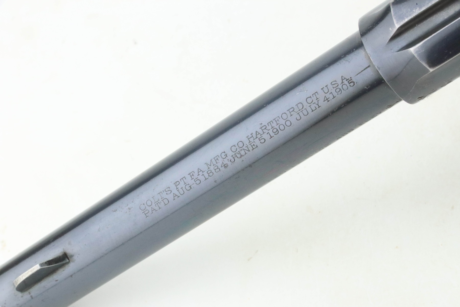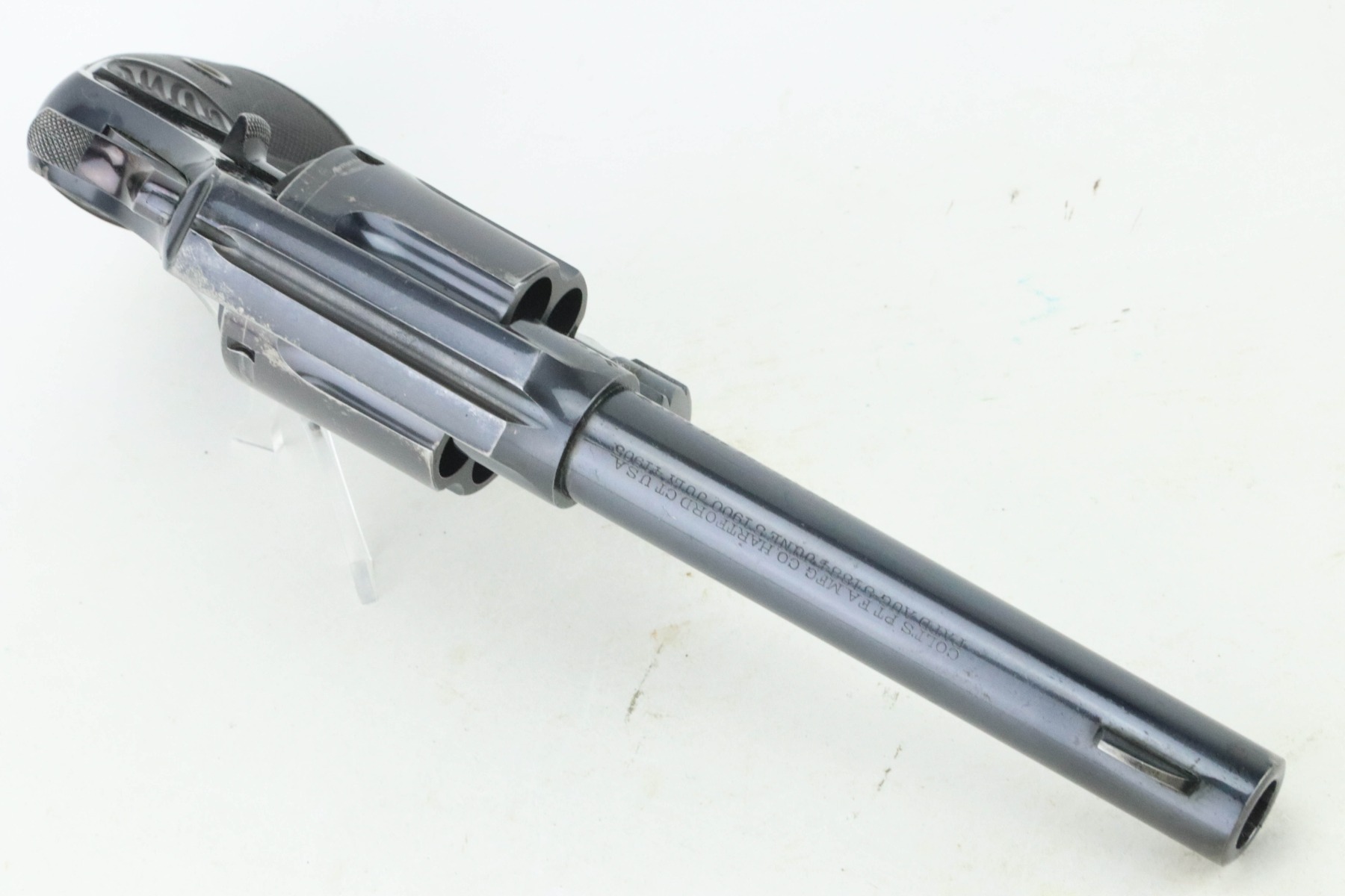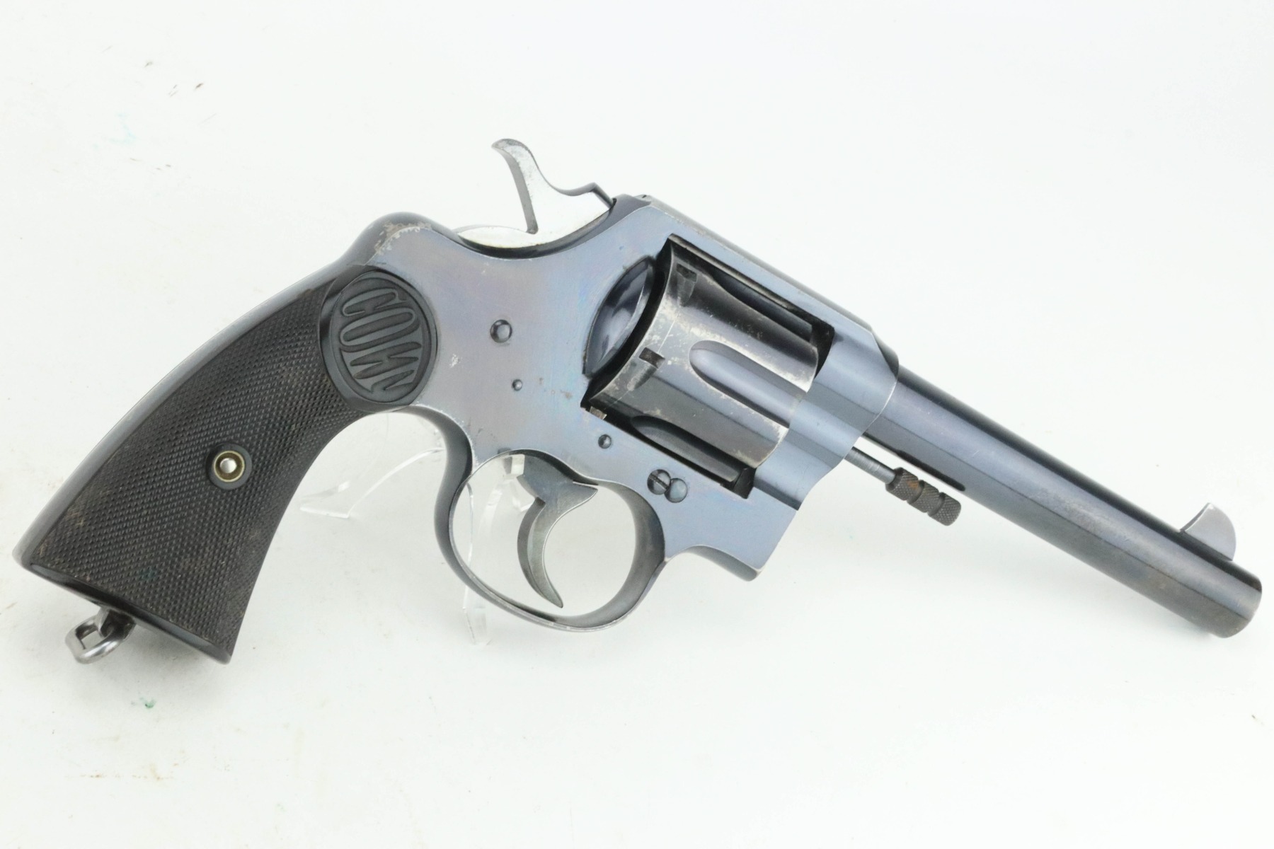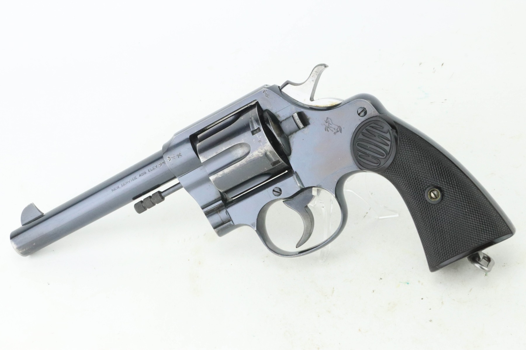 9/18/24 – This is a Colt New Service revolver from 1916 still chambered for the British .455 Eley cartridge. These revolvers were acquired by the British War Department during World War I, and they were popular with British officers. This one is all matching and has the proper British proofs throughout. There is an “A.E.Stevenson” marking on the back strap. It has retained about 90% of its original high polish finish. There is wear around the muzzle, some spotty wear on the cylinder, and wear on some of the high edges. A few light scratches and marks here and there. Fitted with proper black hard rubber grips. Mint bore.