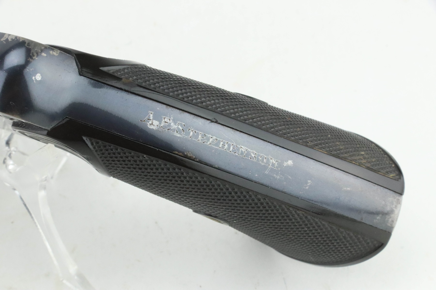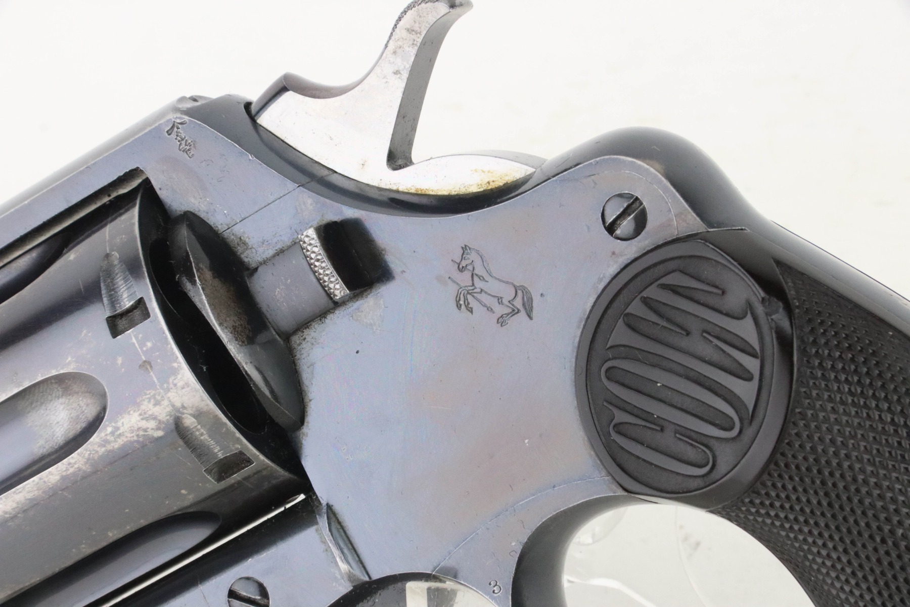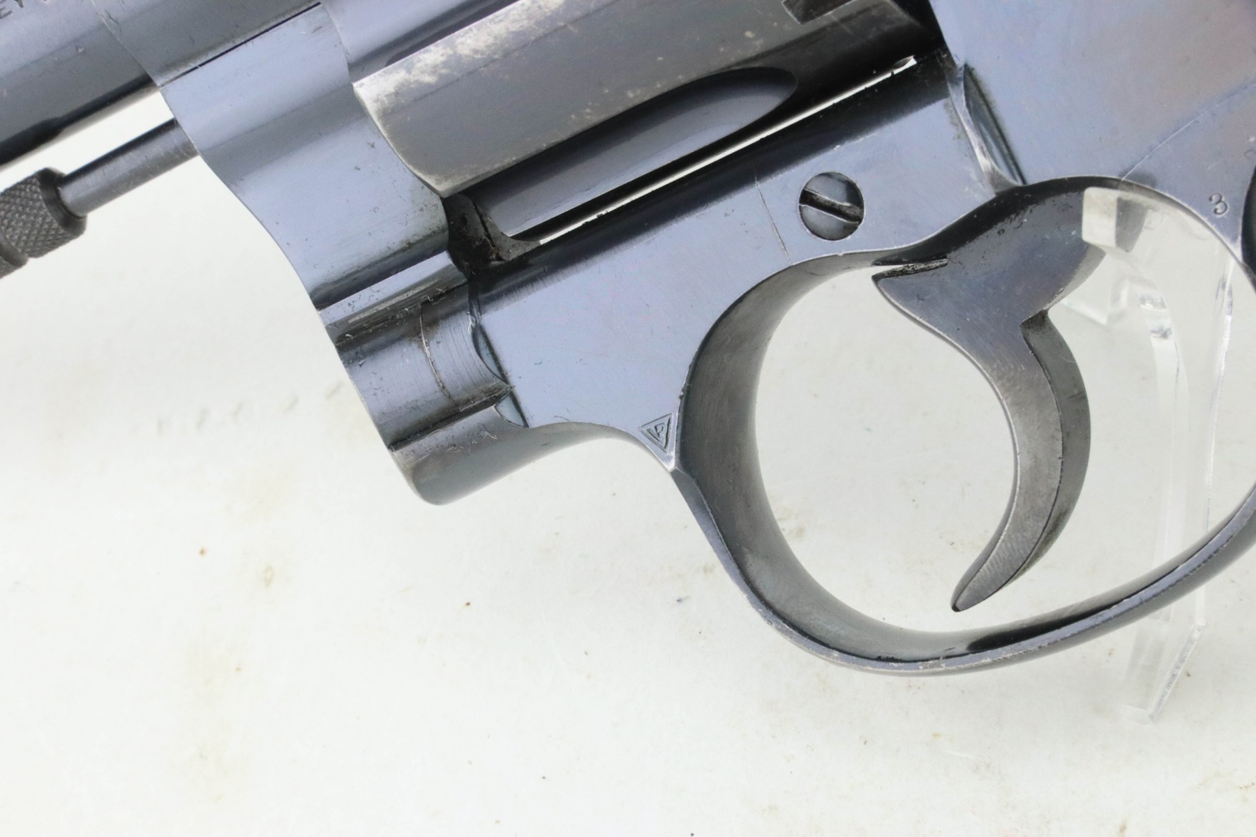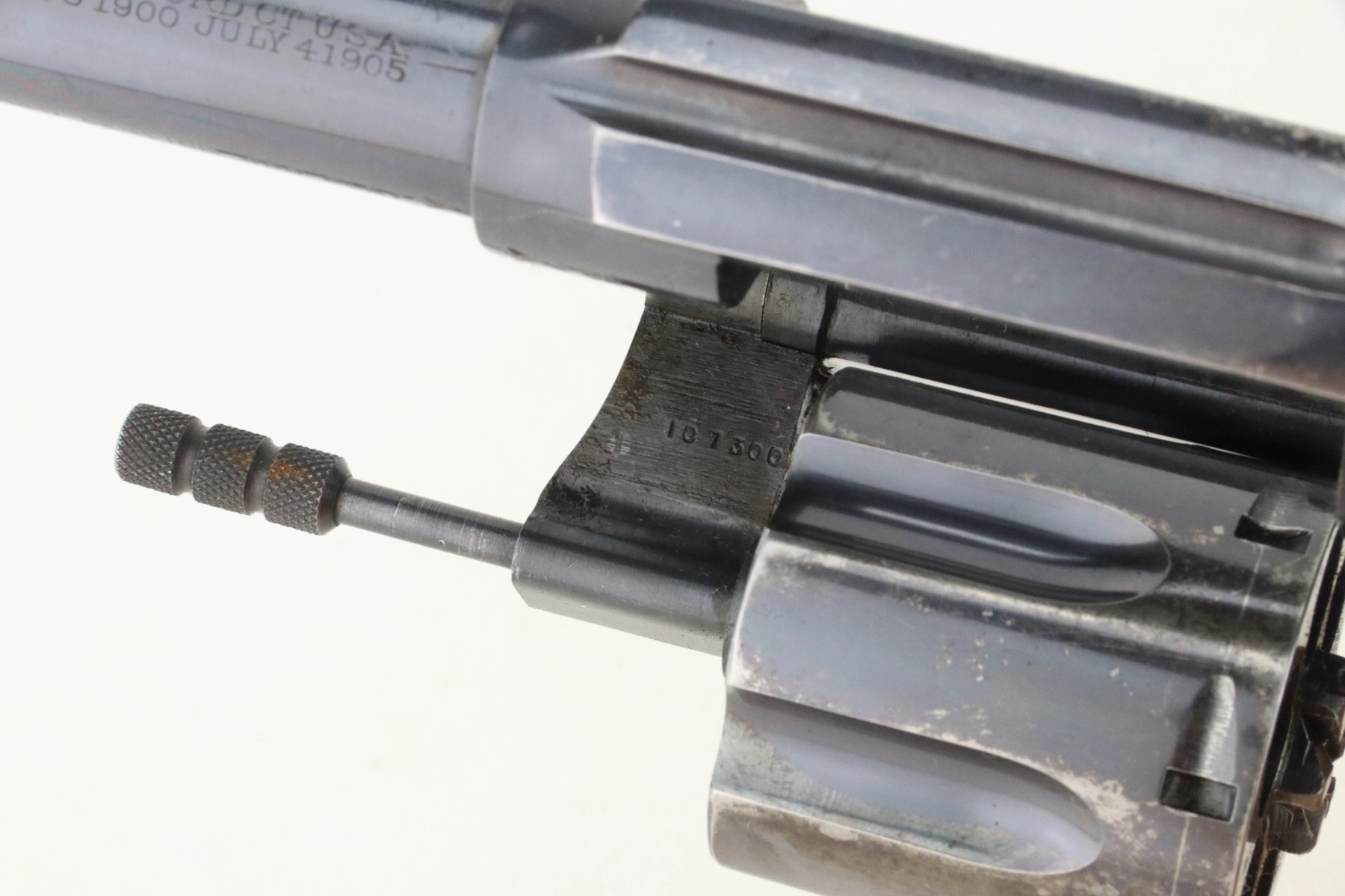 9/18/24 – This is a Colt New Service revolver from 1916 still chambered for the British .455 Eley cartridge. These revolvers were acquired by the British War Department during World War I, and they were popular with British officers. This one is all matching and has the proper British proofs throughout. There is an “A.E.Stevenson” marking on the back strap. It has retained about 90% of its original high polish finish. There is wear around the muzzle, some spotty wear on the cylinder, and wear on some of the high edges. A few light scratches and marks here and there. Fitted with proper black hard rubber grips. Mint bore.