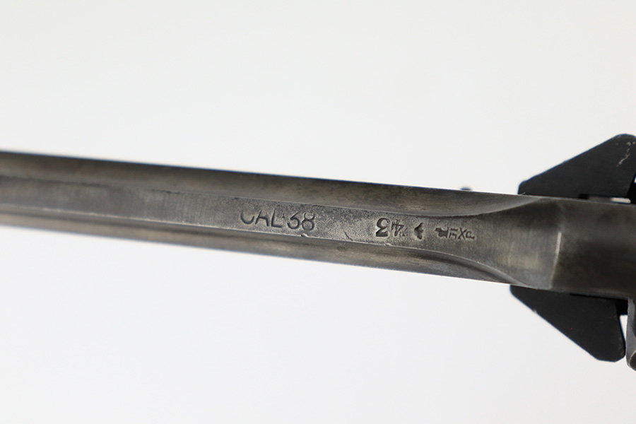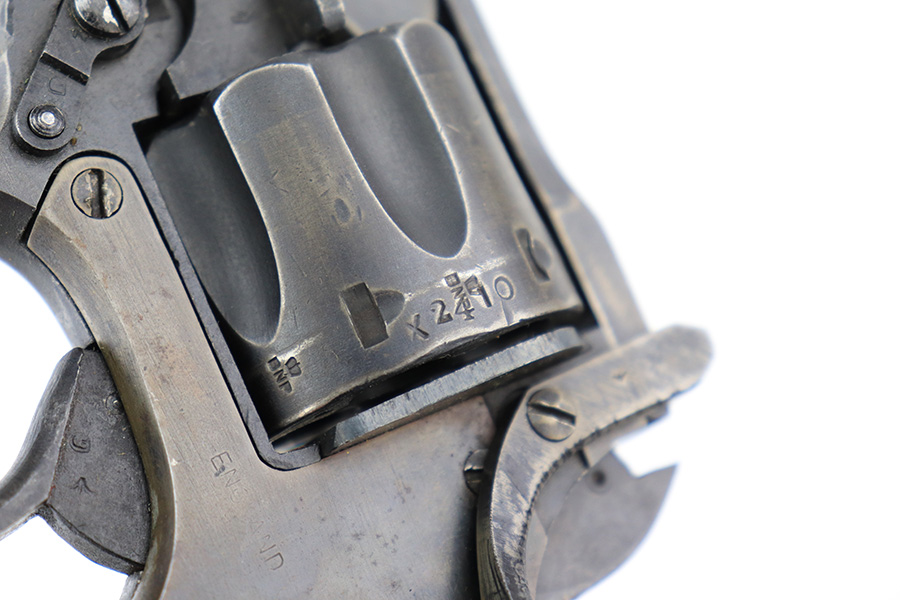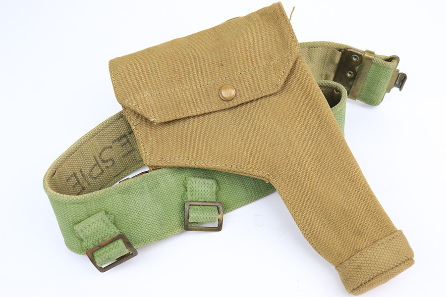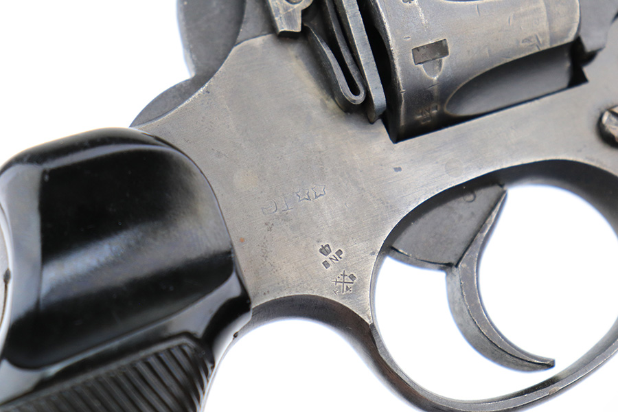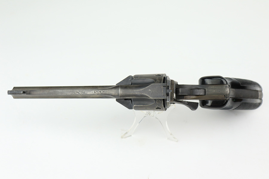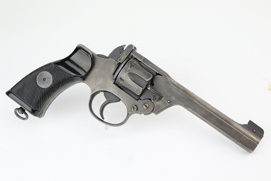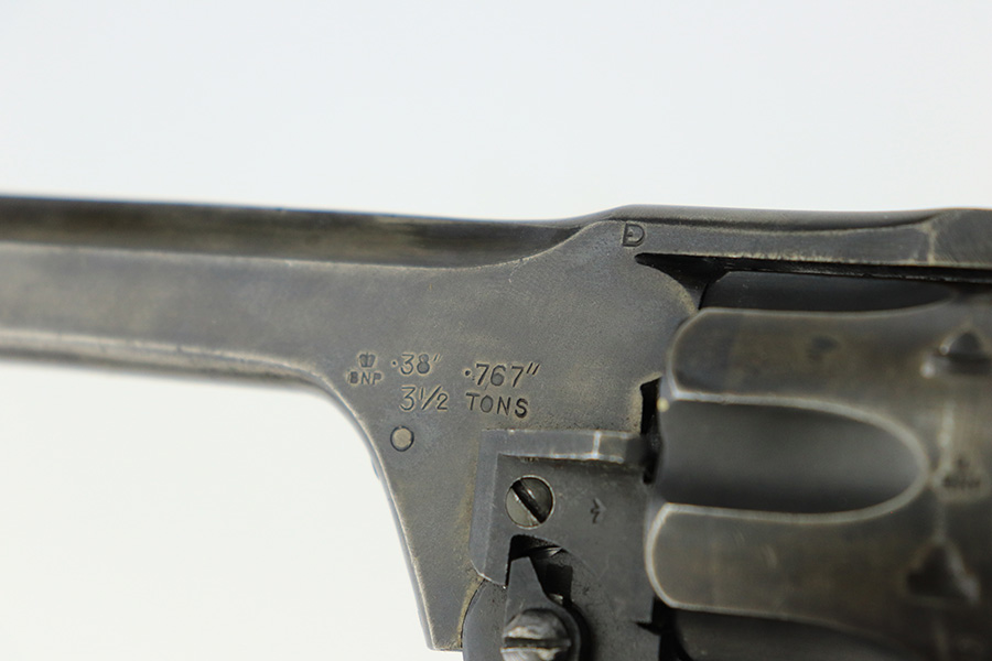 5/3/22 – This is a nice example of an Enfield No 2 Mk 1 revolver issued to the British military during WW2. It is all matching and has the proper British military proofs throughout. “England” export stamp on the left side of the frame. The gun comes as a complete rig with an excellent 1942-dated canvas holster, original cleaning rod, canvas ammo pouch, and a period-correct canvas belt with the name “Gillespie” written on the inside. The gun itself has retained roughly 75-80% of its military finish. Generally, there is thinning throughout and minor wear concentrated around the high edges. Some small spots of discoloration here and there. Comes with nice period-correct black bakelite grips. Mint bore. We just listed some ammo that would go with this gun. SKU is 050322-4.