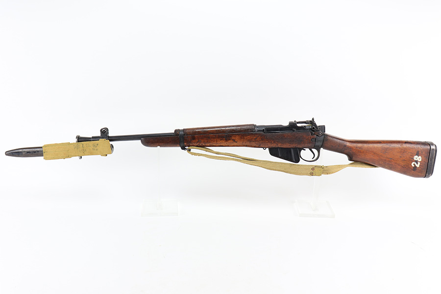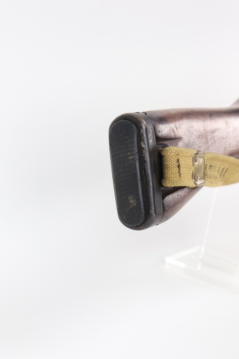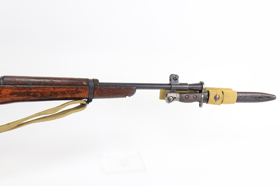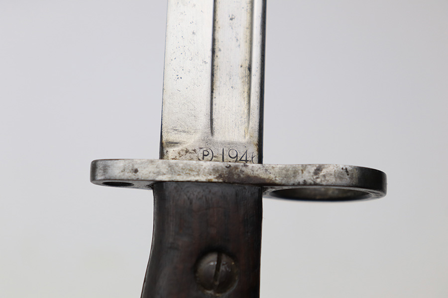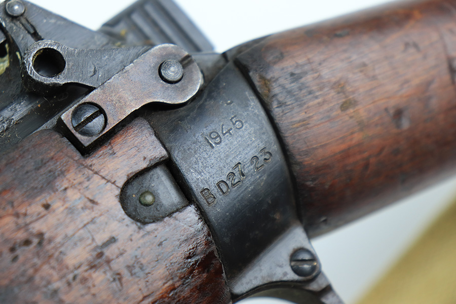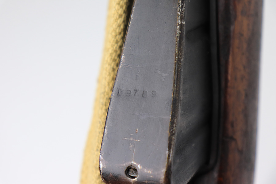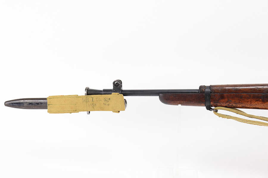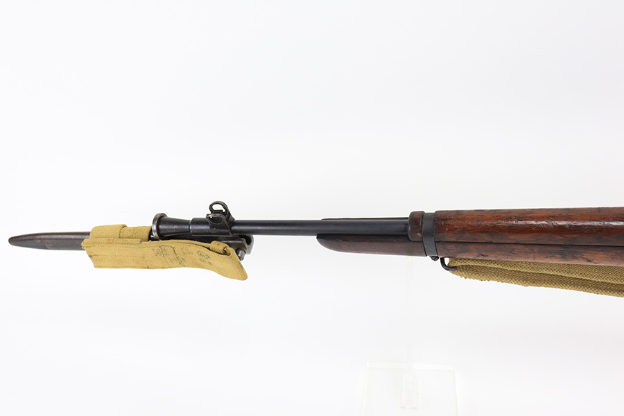 3/16/22 – This is an original British Jungle Carbine that was made in Fazakerley in 1945. Original finish with matching receiver and bolt, though the magazine is mismatched. Finish shows some wear on the magazine and some oxidation/minor surface rust on right side of the wrist. The stock has dings and nicks but no cracks. Bore has strong rifling but thorough frosting and could use a good cleaning. The rifle comes with an original bayonet and scabbard, as well as a canvas sling. The sling is dated to 1944, and the bayonet blade appears to date to 1946. Import mark on barrel.