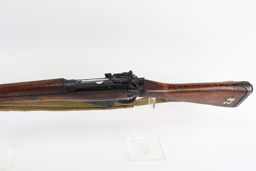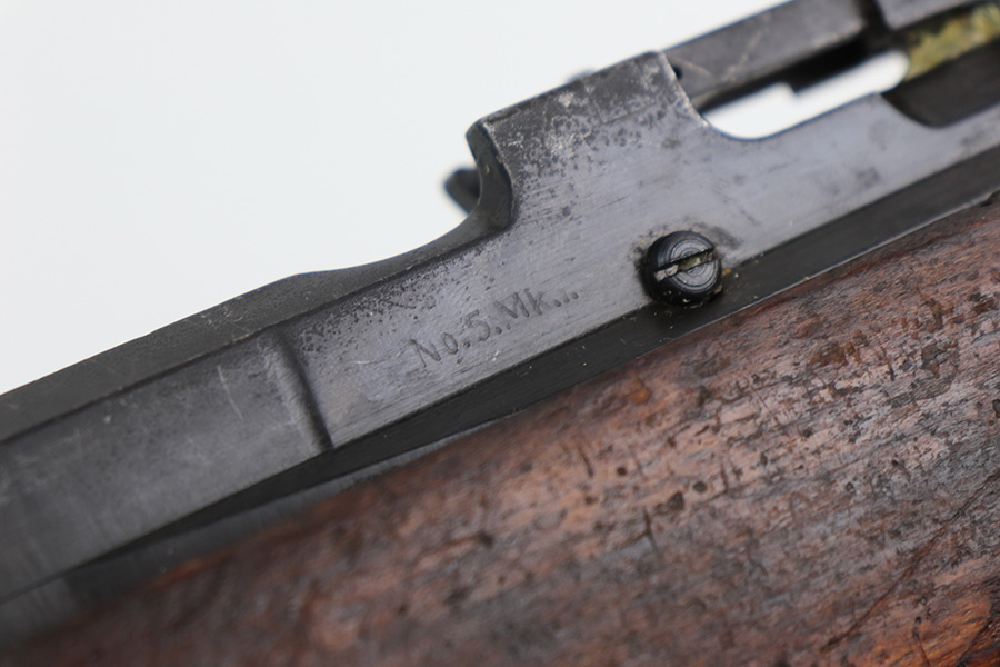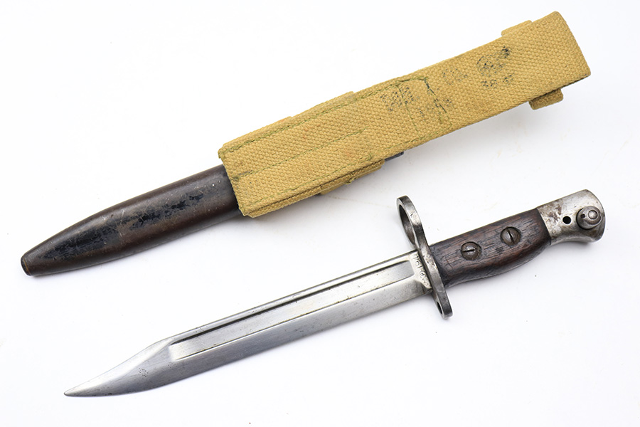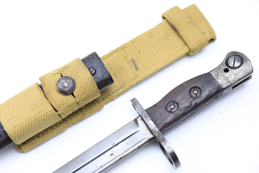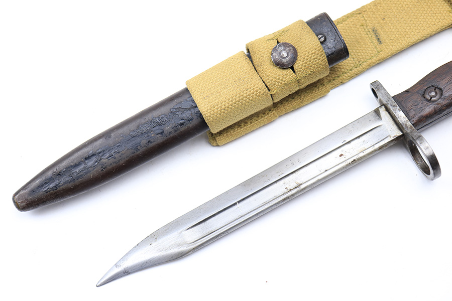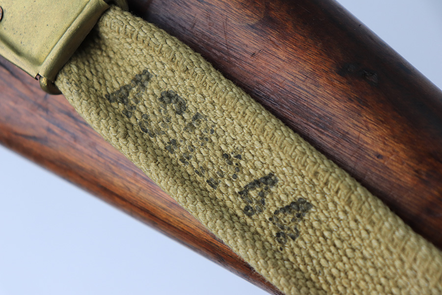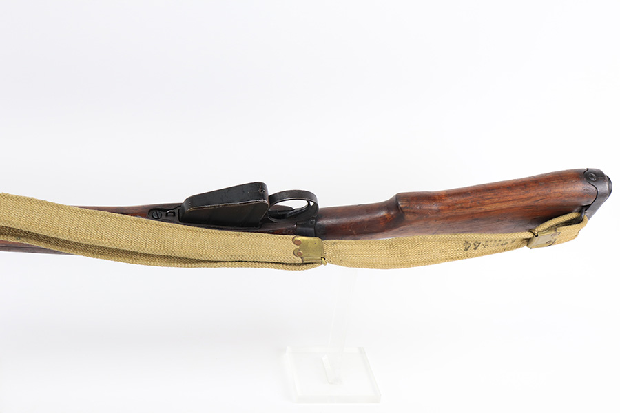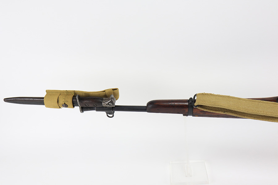 3/16/22 – This is an original British Jungle Carbine that was made in Fazakerley in 1945. Original finish with matching receiver and bolt, though the magazine is mismatched. Finish shows some wear on the magazine and some oxidation/minor surface rust on right side of the wrist. The stock has dings and nicks but no cracks. Bore has strong rifling but thorough frosting and could use a good cleaning. The rifle comes with an original bayonet and scabbard, as well as a canvas sling. The sling is dated to 1944, and the bayonet blade appears to date to 1946. Import mark on barrel.