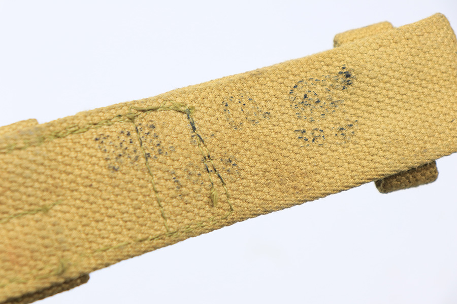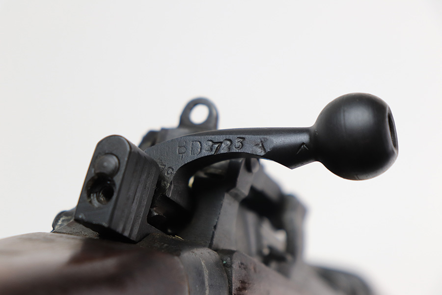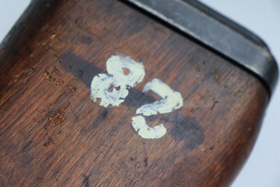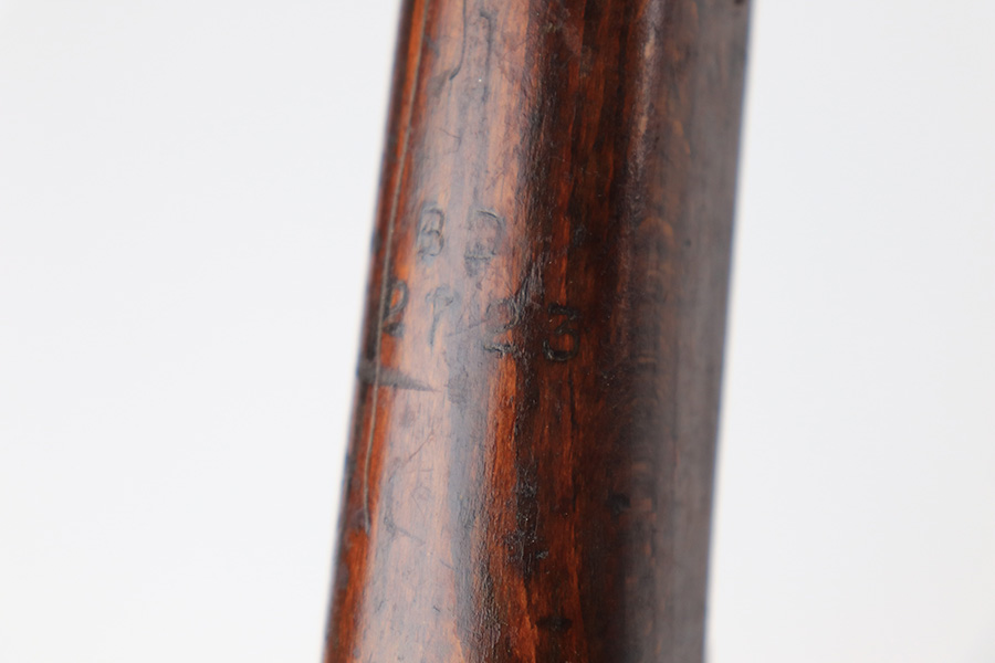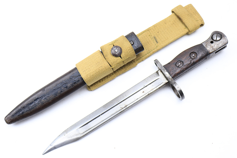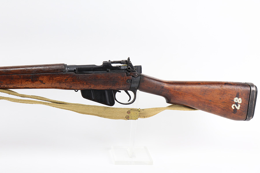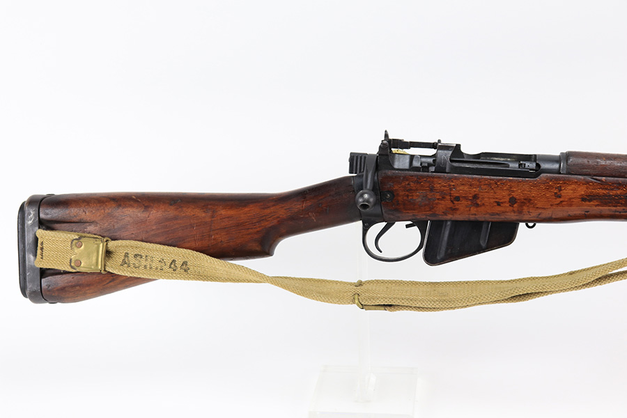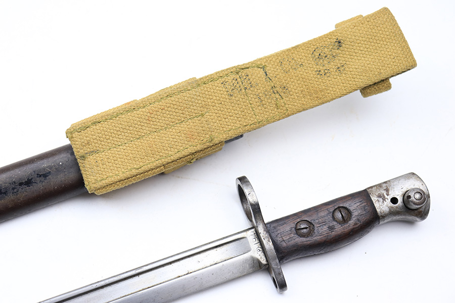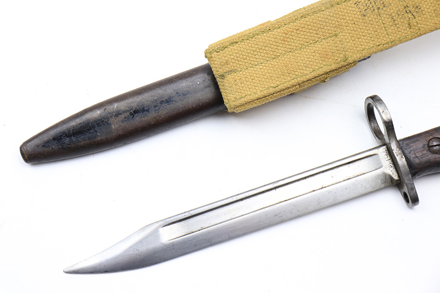 3/16/22 – This is an original British Jungle Carbine that was made in Fazakerley in 1945. Original finish with matching receiver and bolt, though the magazine is mismatched. Finish shows some wear on the magazine and some oxidation/minor surface rust on right side of the wrist. The stock has dings and nicks but no cracks. Bore has strong rifling but thorough frosting and could use a good cleaning. The rifle comes with an original bayonet and scabbard, as well as a canvas sling. The sling is dated to 1944, and the bayonet blade appears to date to 1946. Import mark on barrel.